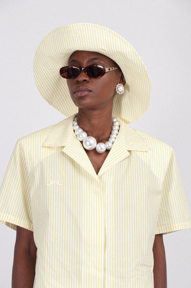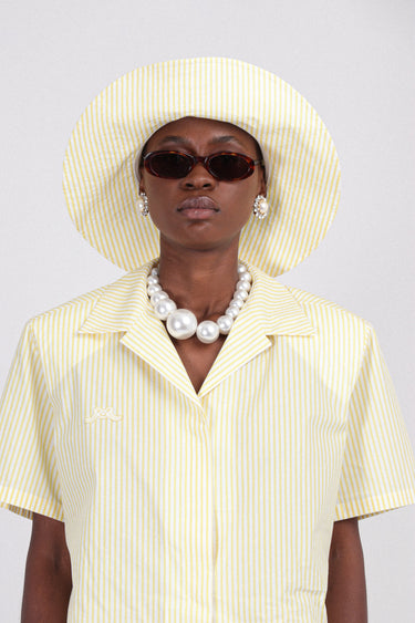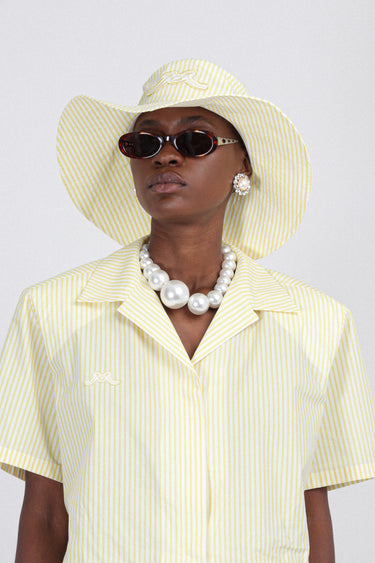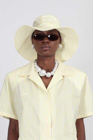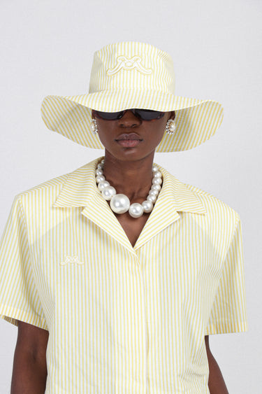 Wide-brim hat in lightweight cotton poplin with yellow and white stripes. Features a central embroidered logo patch for a signature touch. Stylish and functional for sun protection.