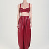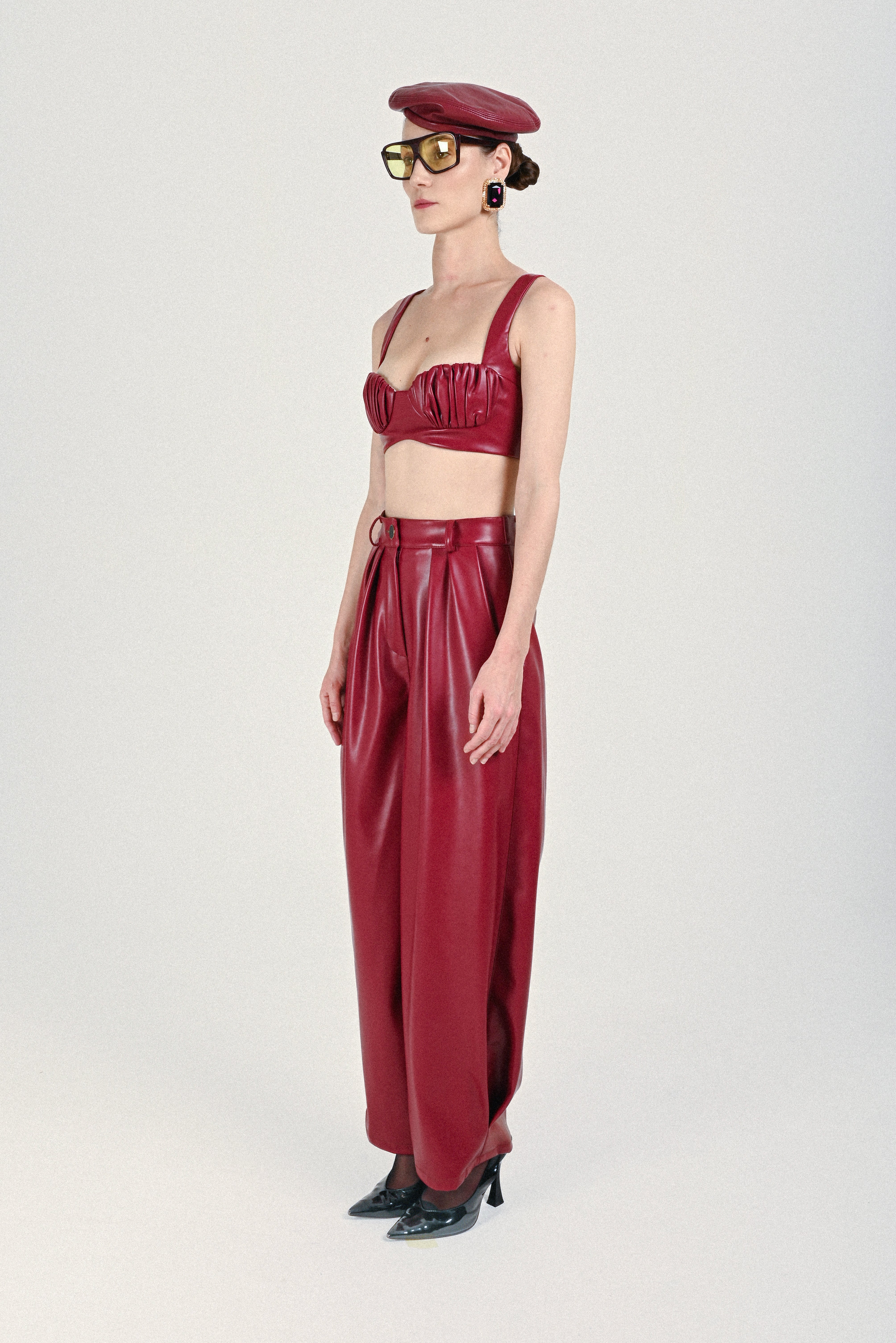 Made from durable eco leather, these elegant carrot pants boast pleats and a flattering high waist that reaches the ankle. The deep bordeaux color, highlighted by coordinating stitching, offers a stylish and adaptable option that effortlessly enhances any top or blouse in your wardrobe.