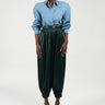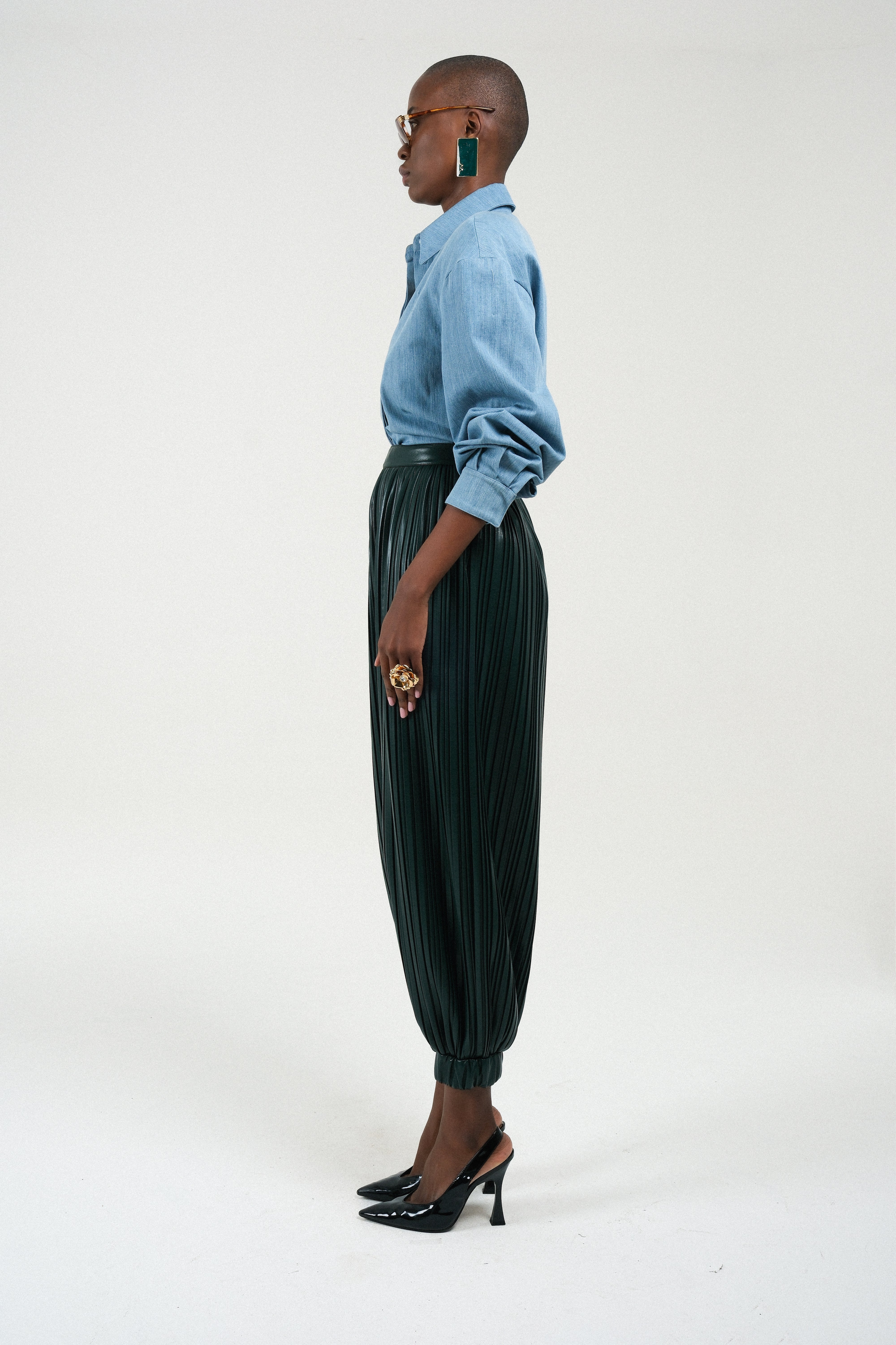 Experience avant-garde texture and volume with these striking balloon trousers. Crafted from permanently pleated eco-leather, this piece offers a luxurious feel and a dynamic, sculptural silhouette. The high-waist design flatters the figure, while the exaggerated balloon fit tapers elegantly at the ankle, creating a modern and bold statement.