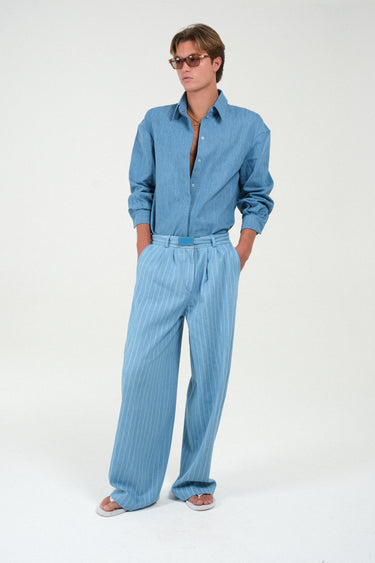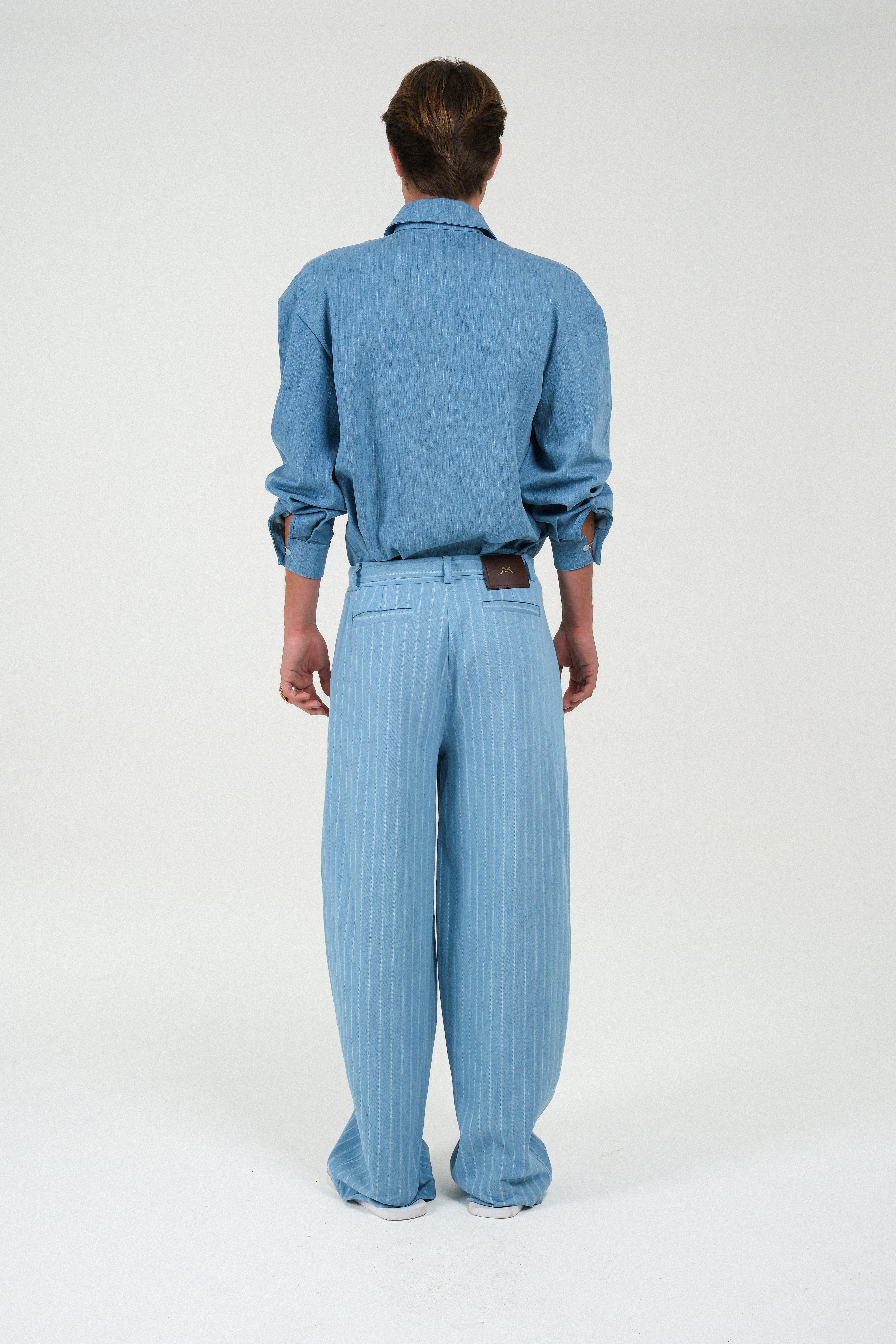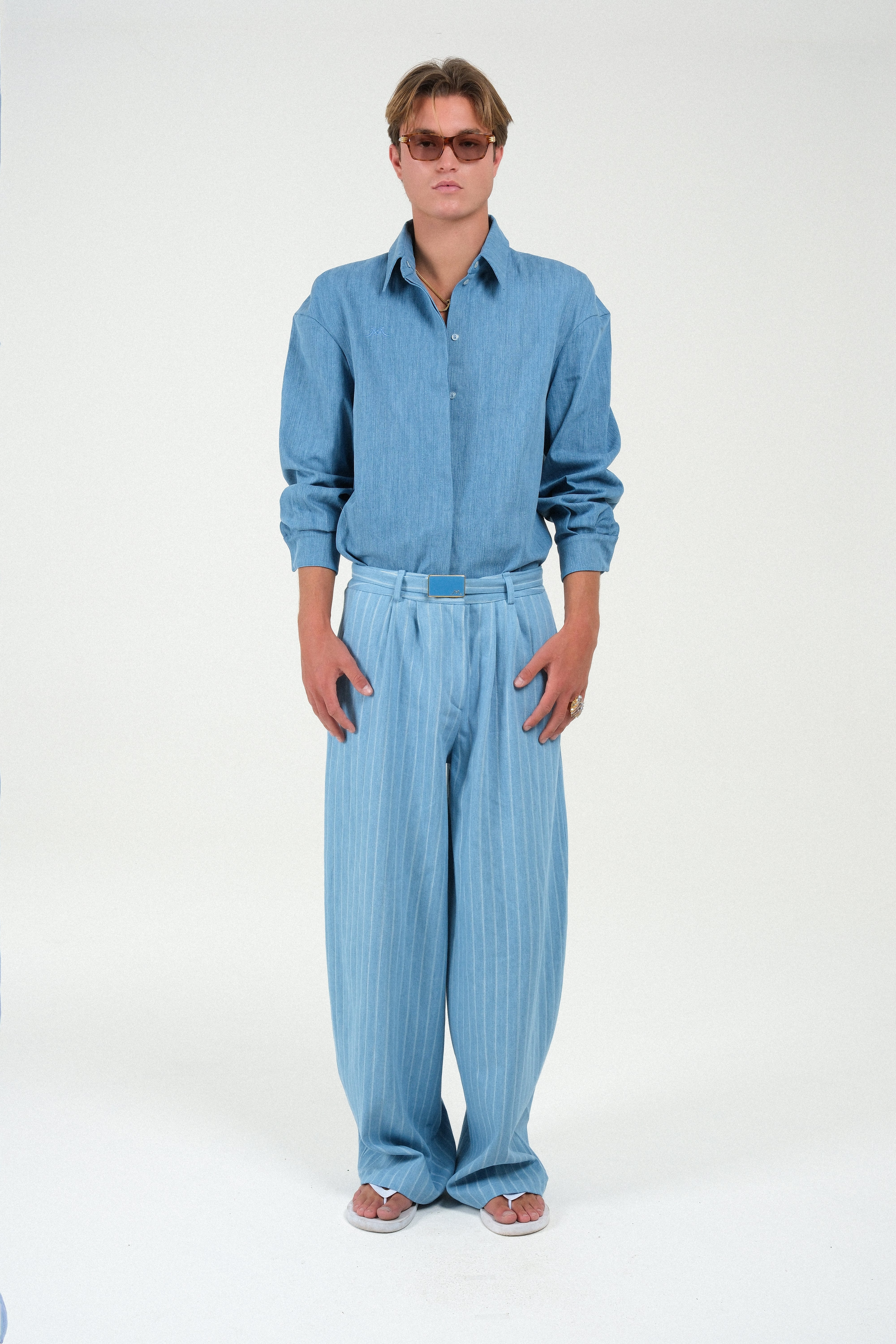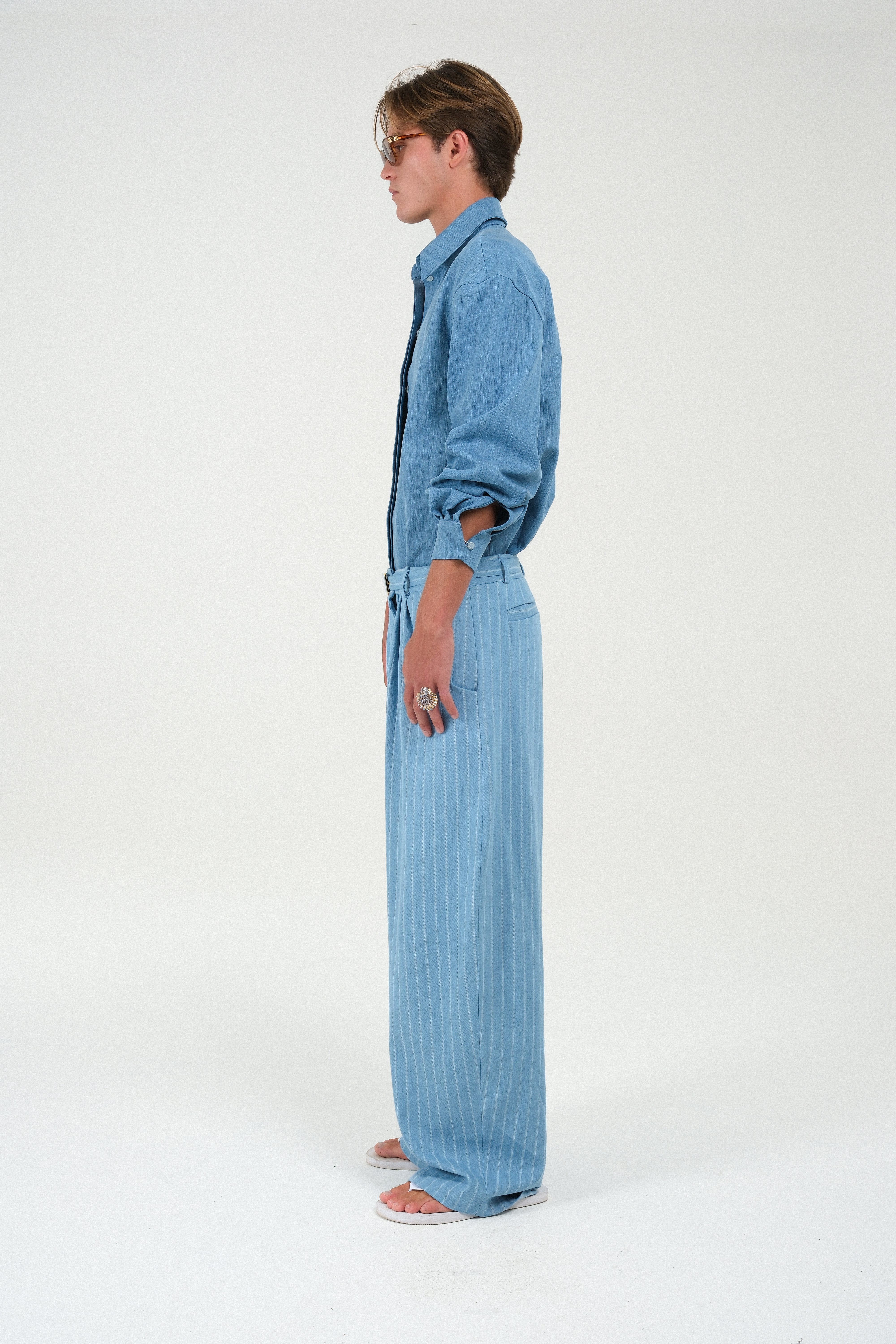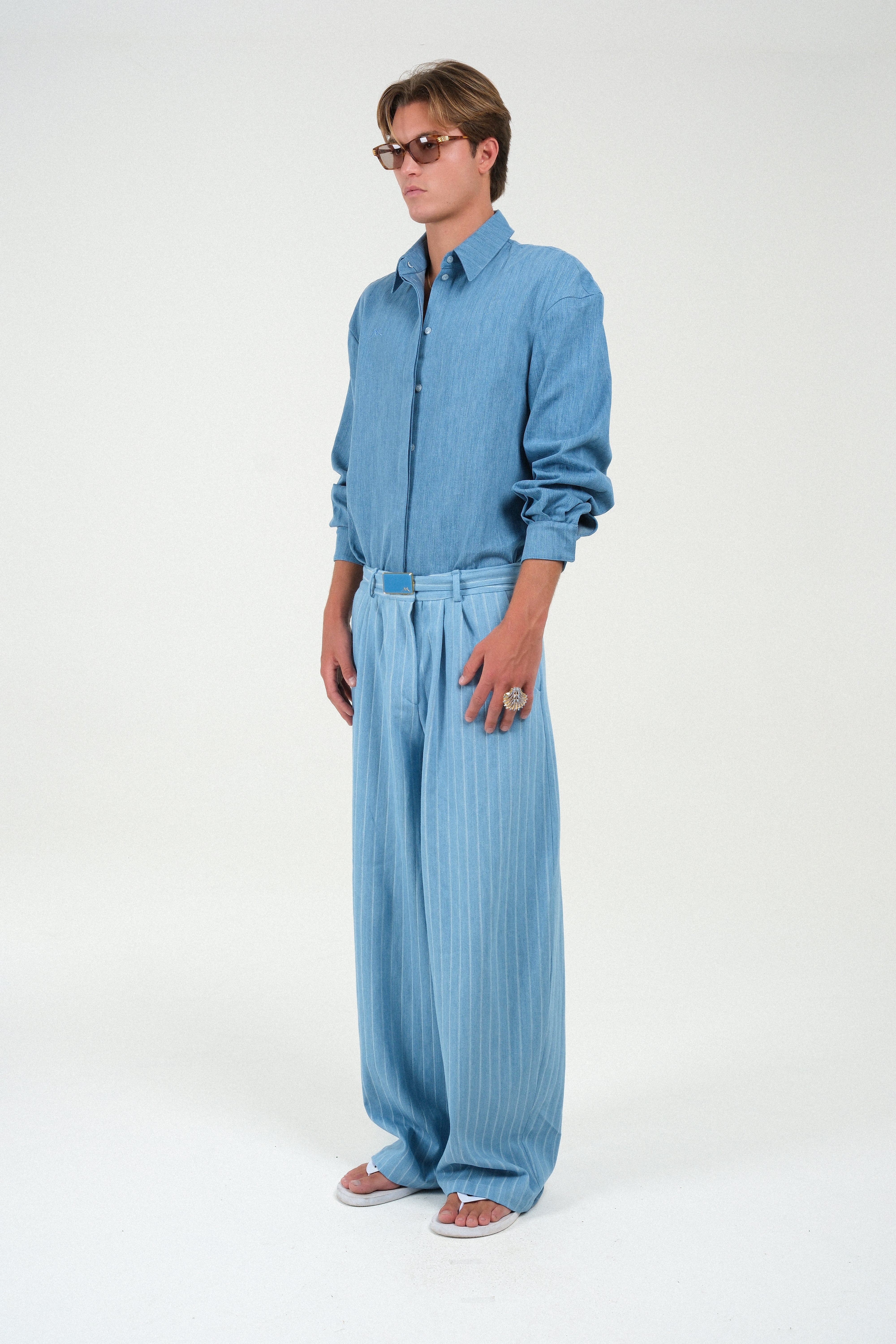 These striped jeans are crafted with a relaxed, elongated silhouette that blends tailoring influences with casual ease. The vertical stripe pattern enhances the line of the leg, while the integrated belt with a lacquered plaque adds a refined, design-driven detail at the waist. Designed to sit comfortably while maintaining a sharp visual structure, they bring a modern, elevated edge to everyday denim.