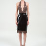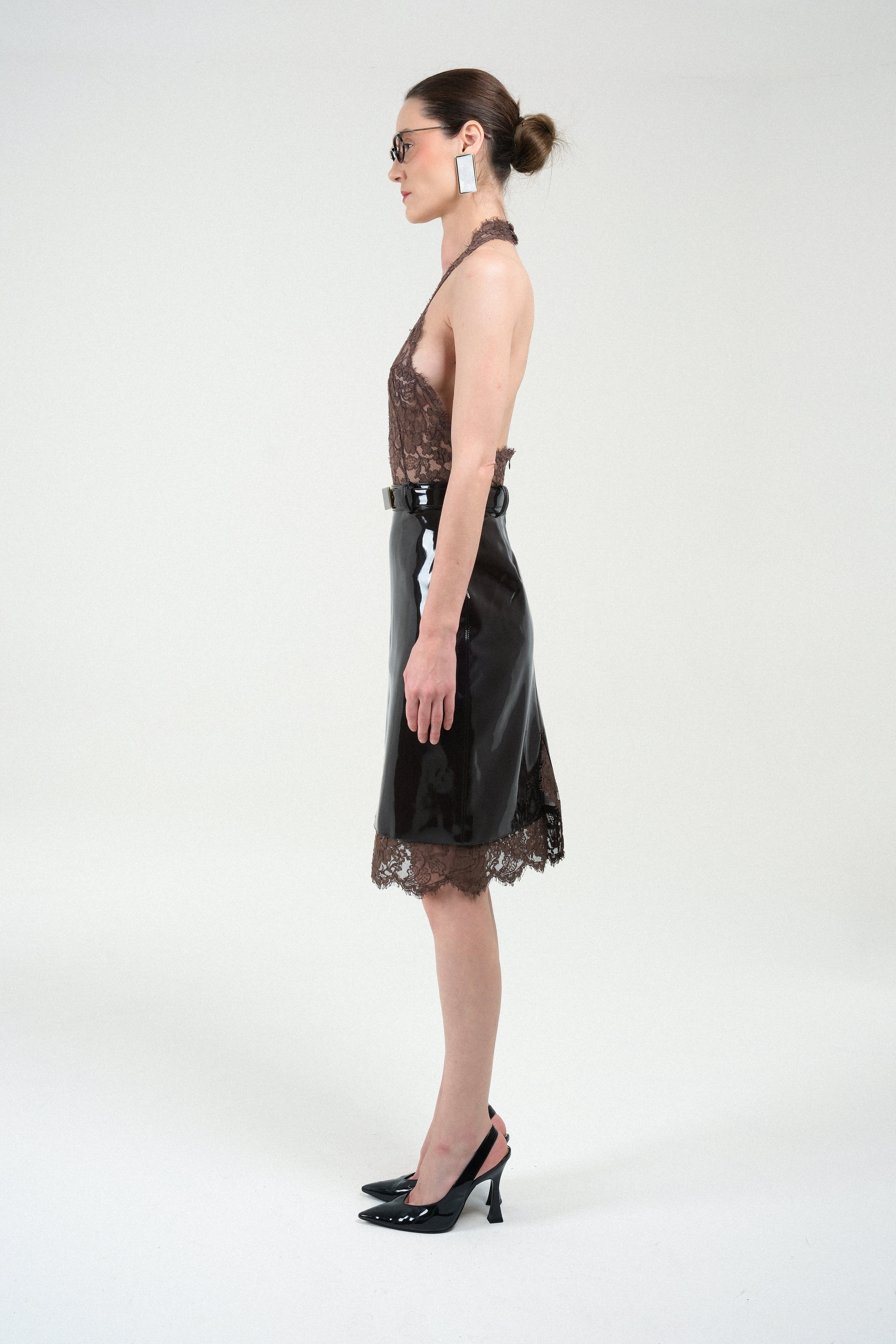 A high-shine vinyl pencil skirt crafted to create a sharp, contemporary silhouette. The design is finished with a delicate lace trim at the hem, offering a refined contrast between the glossy vinyl and the softness of the lace. It includes an integrated belt with a lacquered, tone-on-tone plaque, adding cohesion and a distinctive design detail. A statement piece that plays with texture, volume, and modernity.