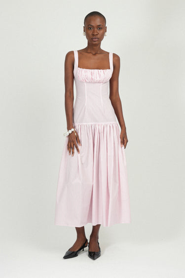 Designed to enhance the silhouette, this dress is crafted from cotton poplin with delicate pink and white stripes. The gathered bust detail offers a sculpted fit and optimal support, while wide straps add a refined touch. The fitted bodice transitions into a voluminous skirt, creating a balanced and flattering look for effortless sophistication.