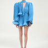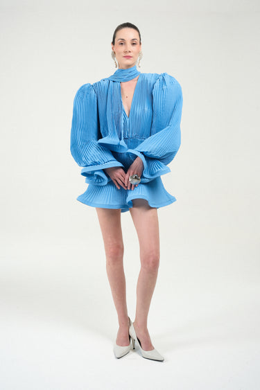 A sculptural mini dress crafted in finely pleated georgette, designed with fluid volume and architectural movement. Its integrated two-part scarf frames the neckline with effortless sophistication, while the billowed sleeves and flared hem create a dynamic, airy silhouette. Light, textural, and inherently statement-making, it brings couture-inspired elegance to any ensemble.