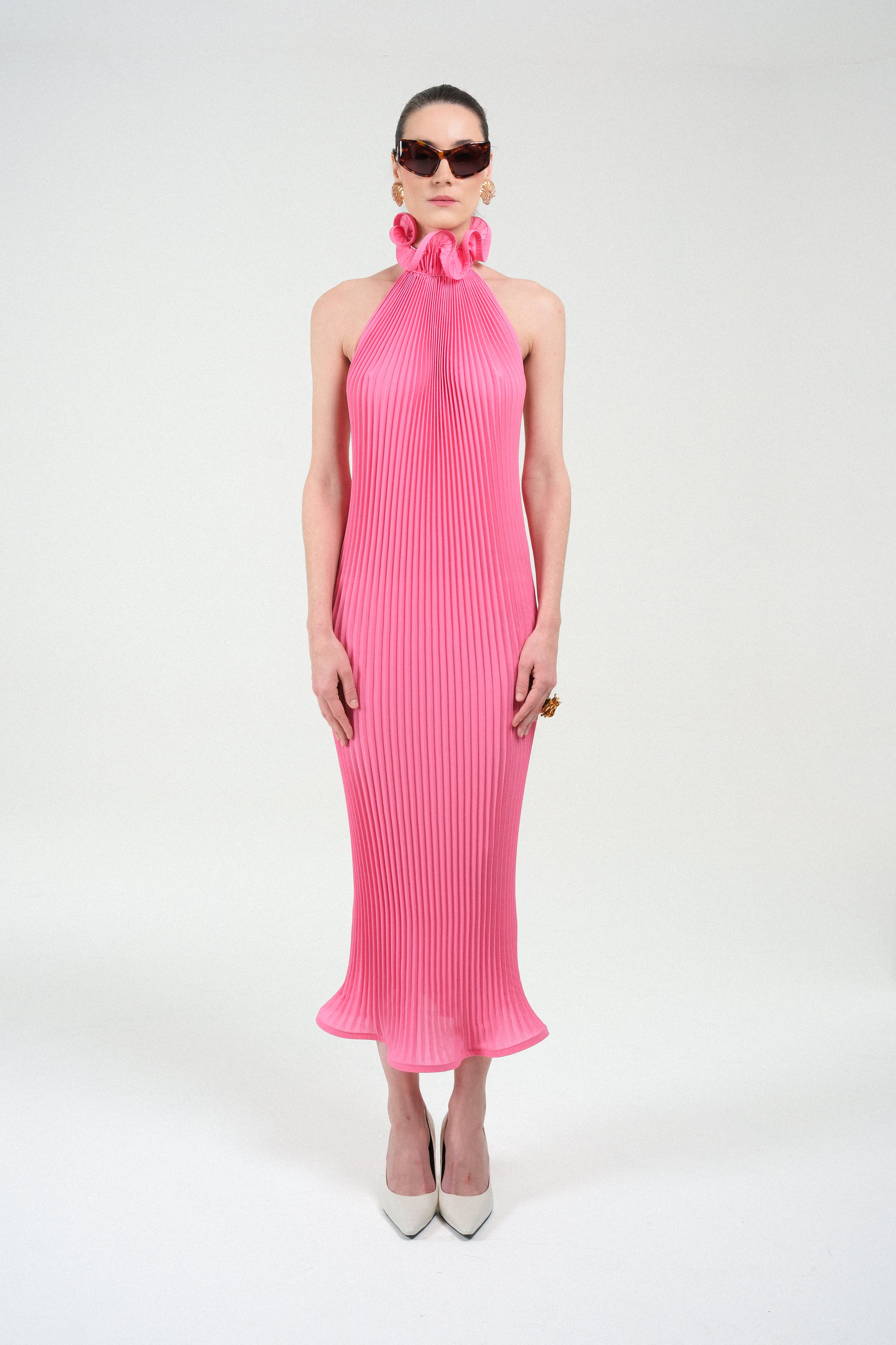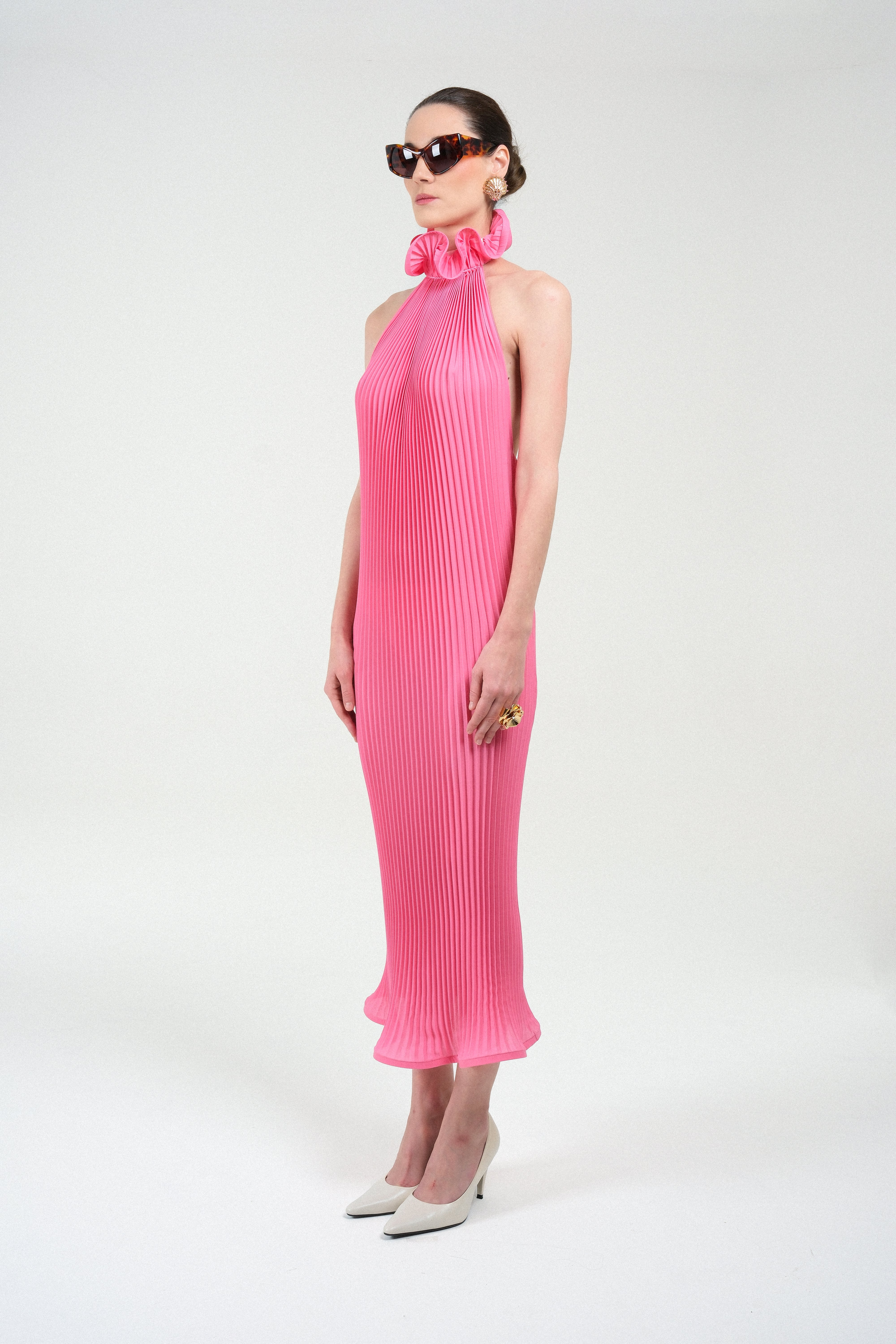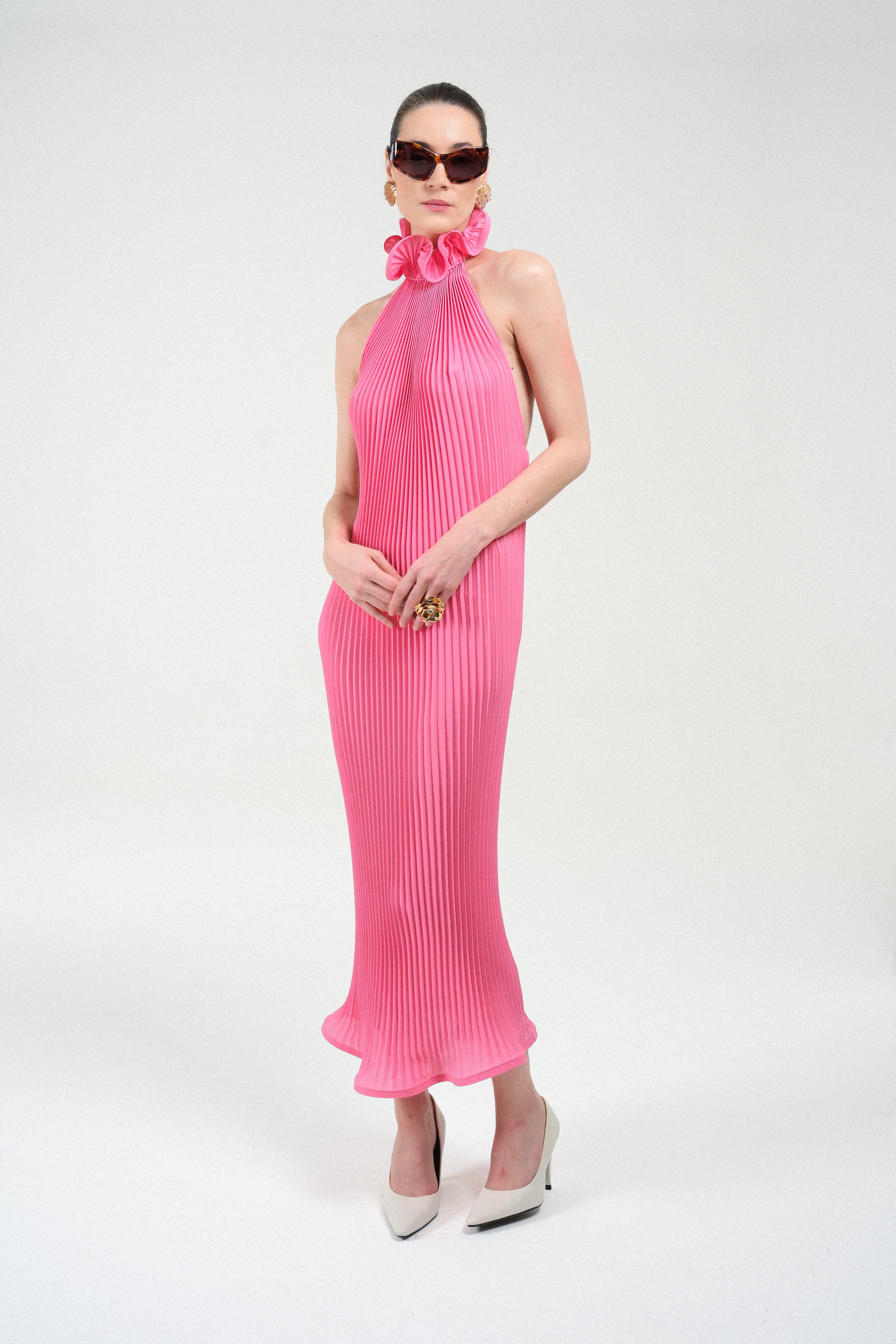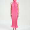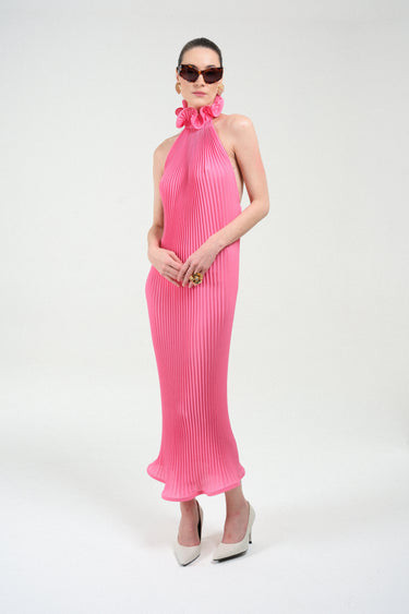 A fluid pleated halter dress crafted in a luminous pink tone that moves gracefully with every step. The high ruffled neckline creates an elegant sculptural frame, while the open back introduces a refined sensuality to the otherwise elongated, minimalist silhouette. Light, architectural, and effortlessly feminine, this piece delivers modern eveningwear with a couture-inspired touch—striking in its simplicity and unforgettable in motion.