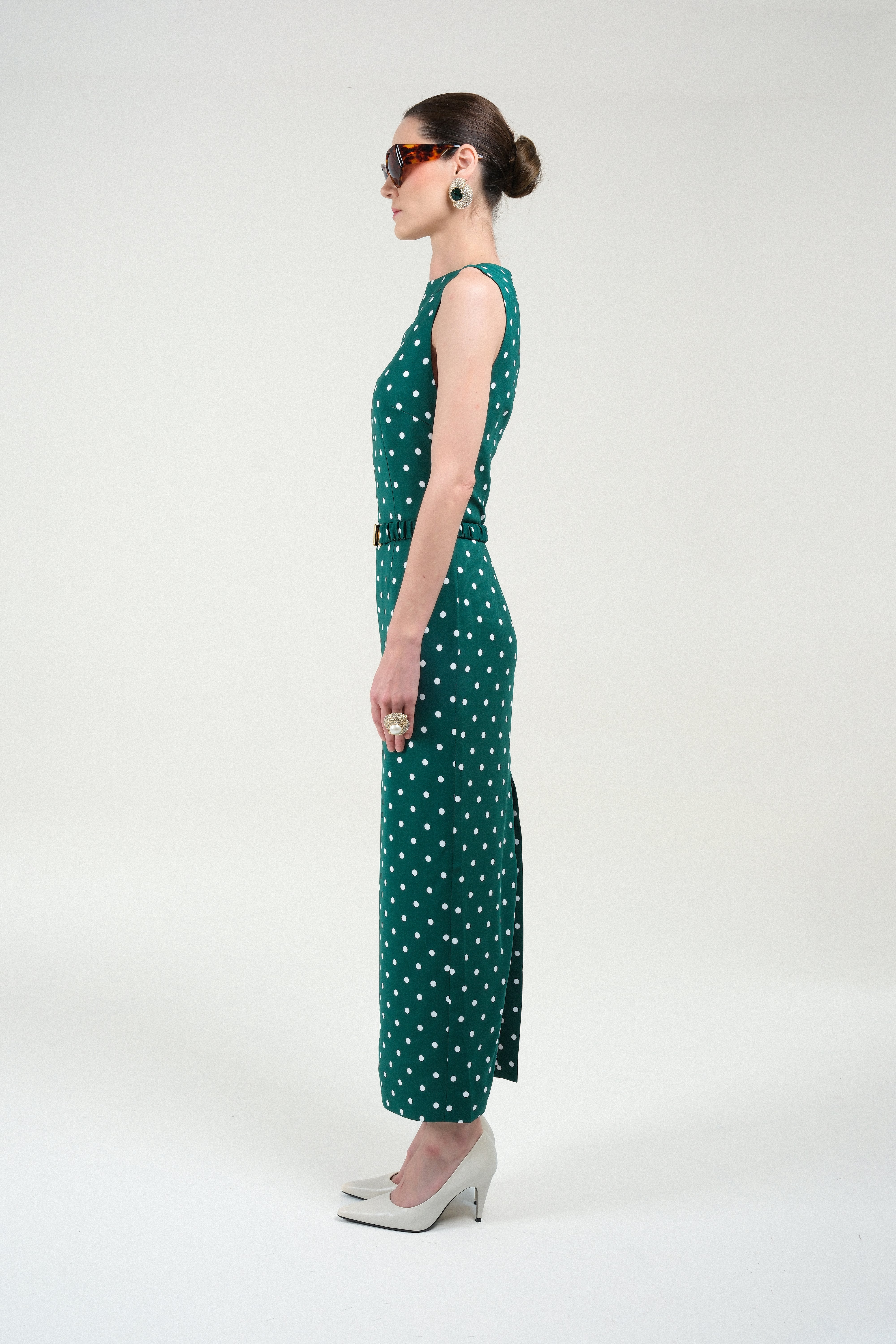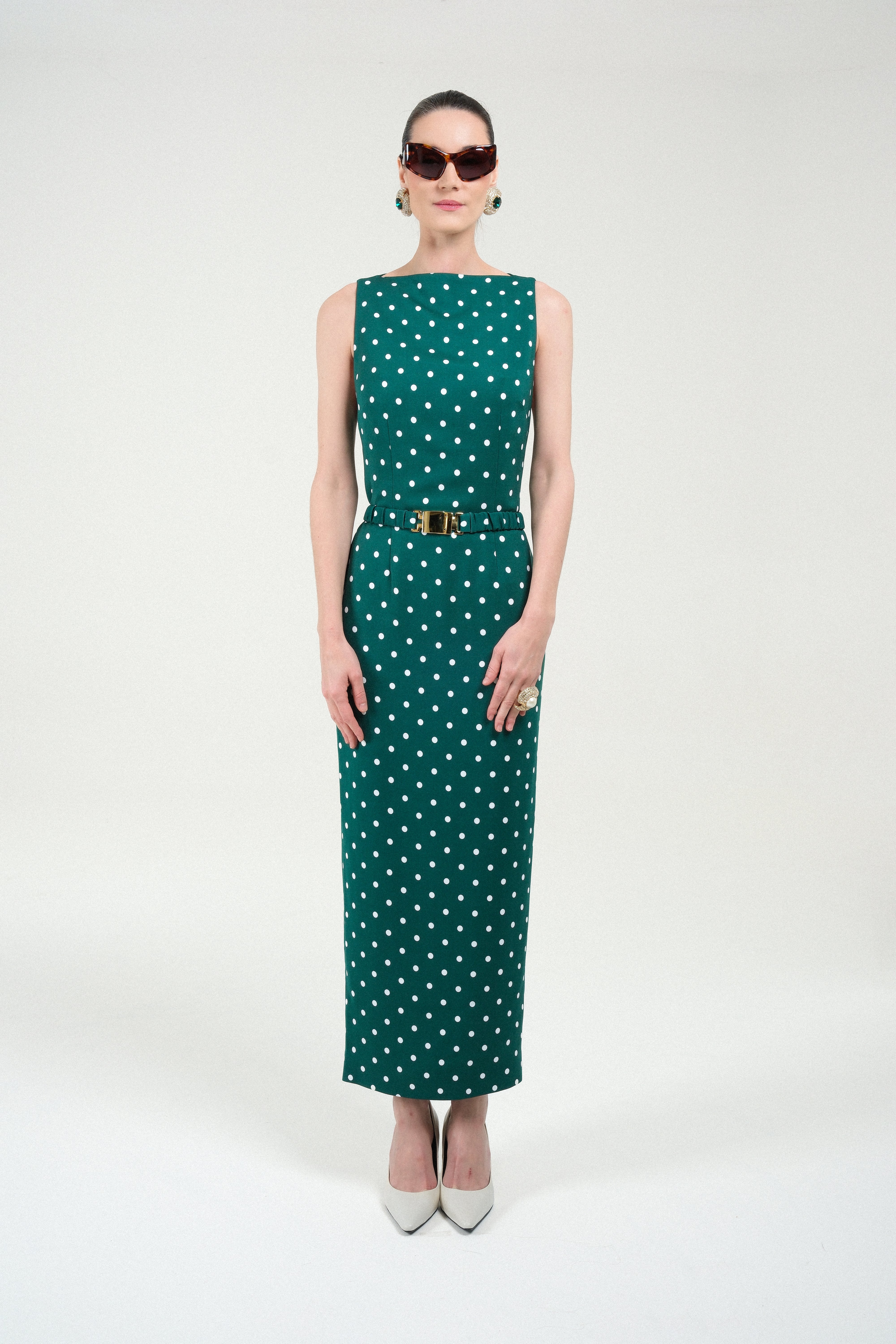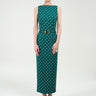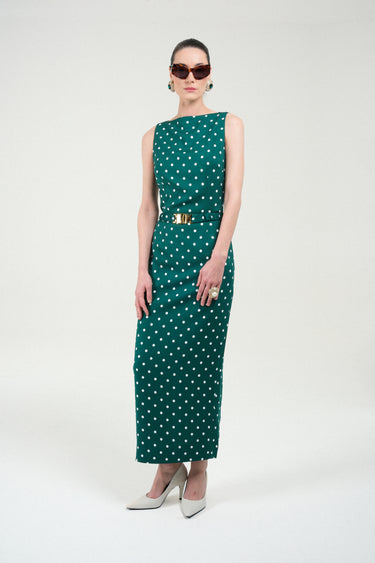 Sable long dress crafted from a refined, structured fabric that enhances its sculptural silhouette. It features a straight neckline and a fitted waist accentuated by a matching belt with a gold-tone buckle, creating an elongated and elegant line. The playful polka dots print adds timeless allure, while the minimalist cut highlights impeccable tailoring. A statement piece that merges classic elegance with modern precision—perfect for elevated evening occasions.