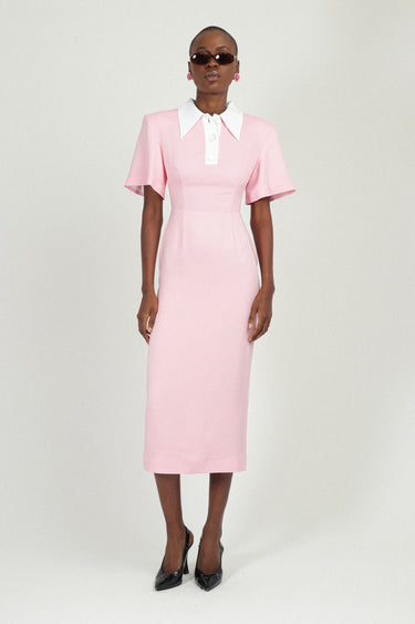 Our signature polo dress, crafted from structured sablé, embodies timeless elegance with a sharp, tailored silhouette. Featuring straight shoulder pads for a bold, architectural look, a contrasting oversized collar, and a refined front button placket, it falls into a sleek long length. A statement piece that balances modern sophistication with classic precision.