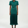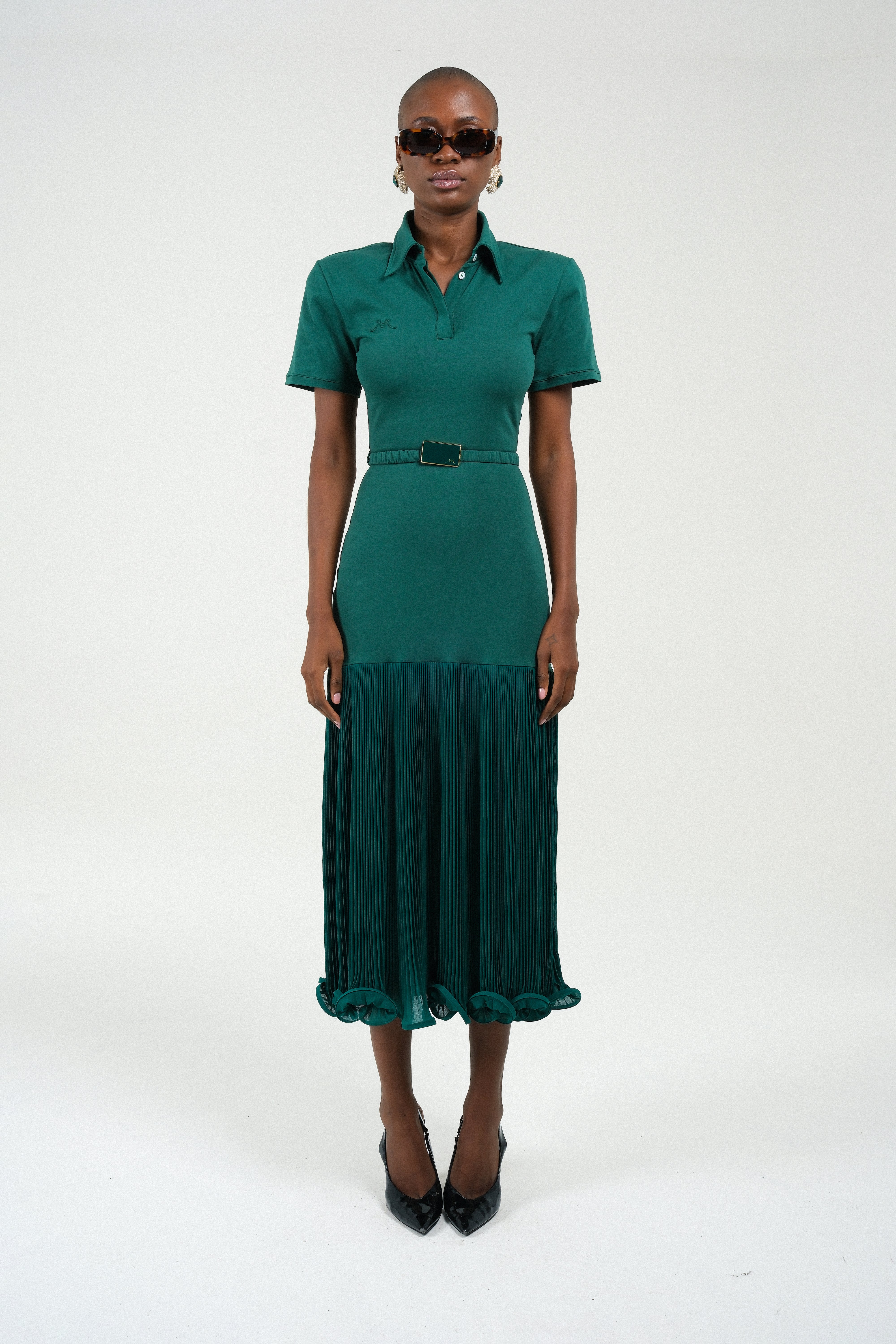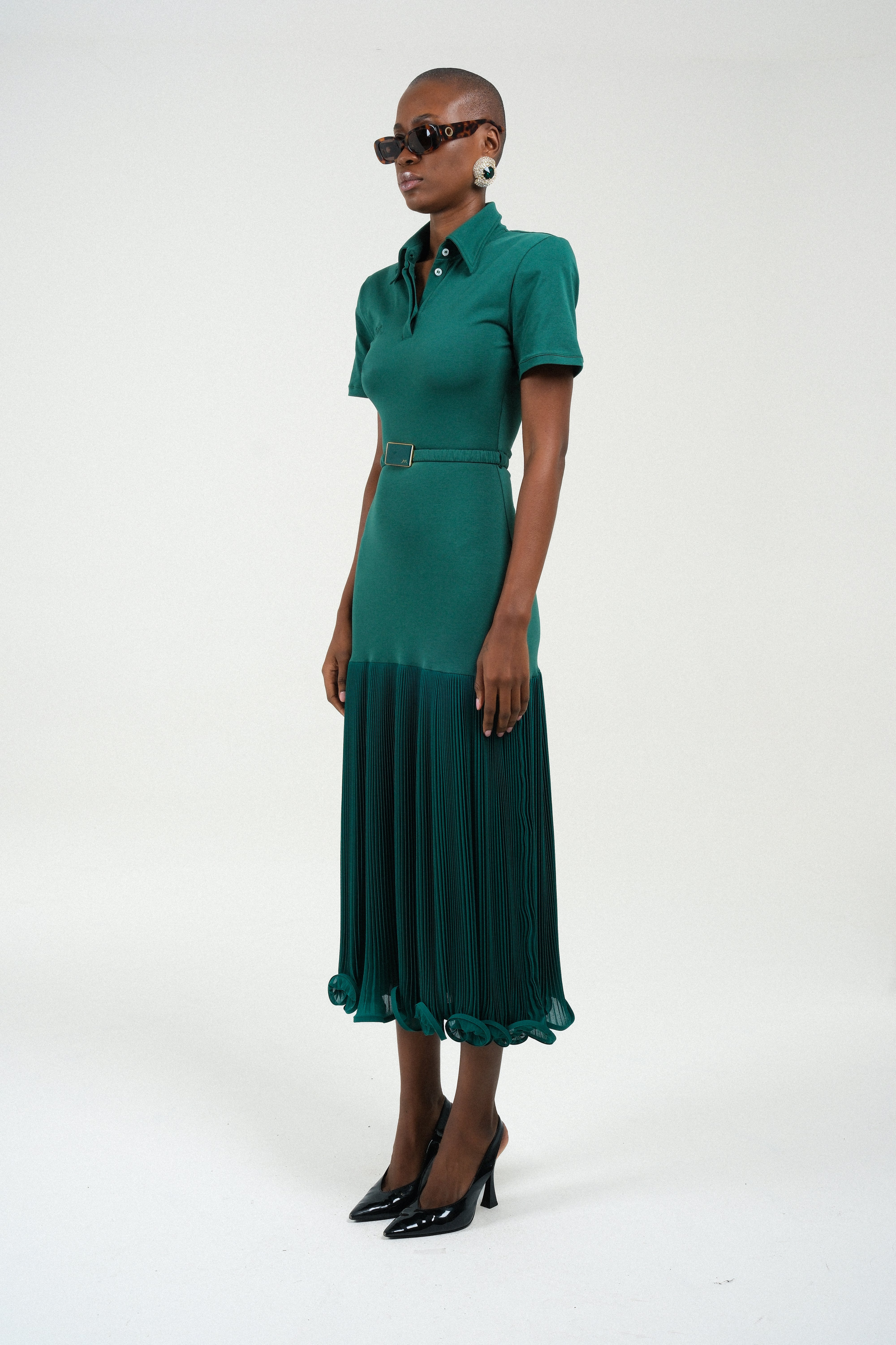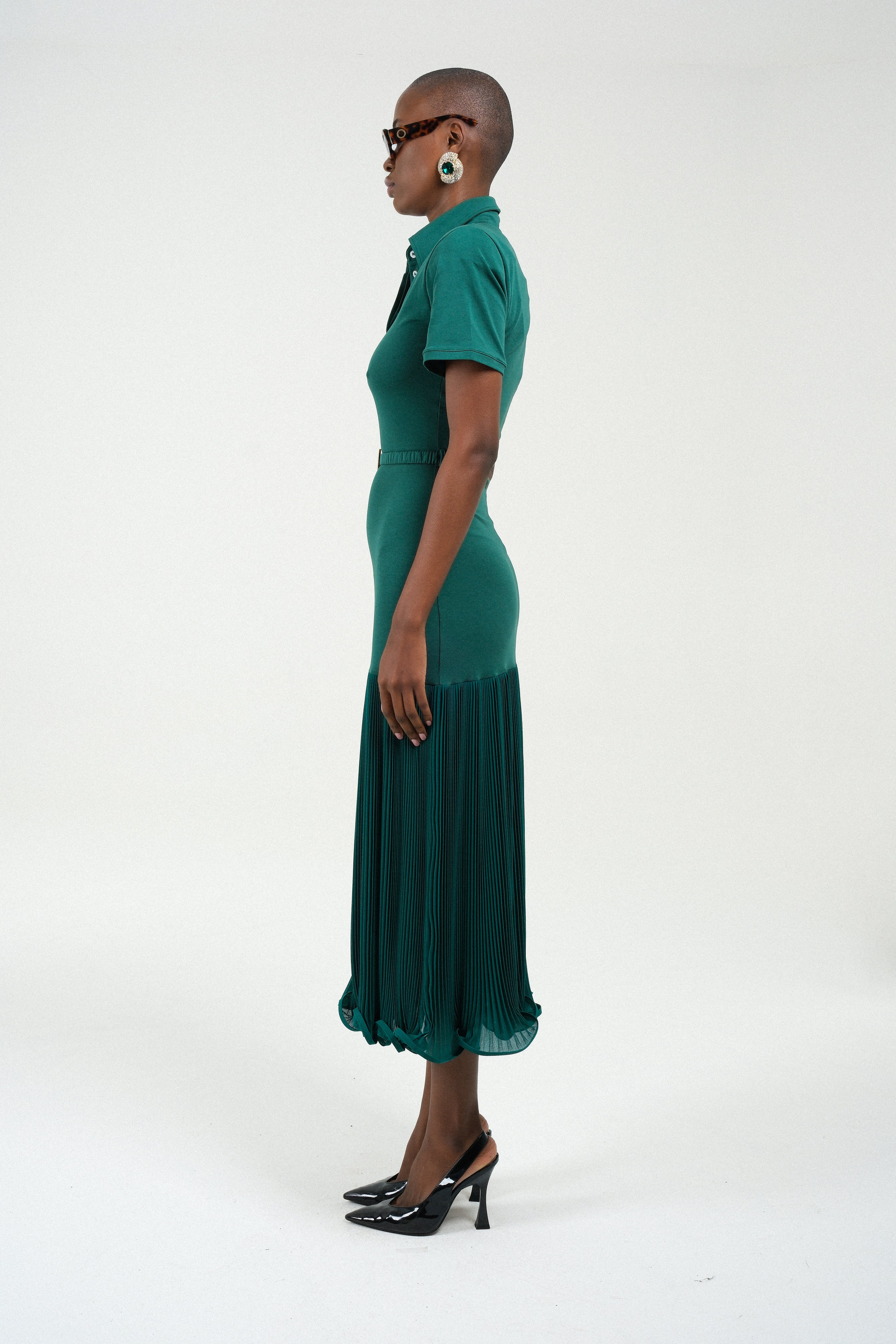 This unique piece seamlessly merges two distinct fabrics for a look that is both modern and timeless. The fitted top, made from high-quality cotton jersey, provides ultimate comfort, while the airy, pleated georgette skirt creates beautiful movement. A matching belt with a lacquered plate elegantly defines the waist, and a crinoline-trimmed hem adds a touch of couture-inspired volume. Effortlessly transition from day to night with this versatile and sophisticated wardrobe essential.