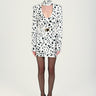This tailored mini dress is cut from sable fabric in a bold black Dalmatian-inspired print. The design features a plunging neckline framed by strong shoulders and long sleeves, balanced with a sleek, form-fitting silhouette. A matching belt with a polished gold-tone buckle cinches the waist, adding definition and a refined touch. The high-neck detail enhances its contemporary elegance, making it a standout piece for evening sophistication.