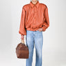 Make a bold statement with this unique bomber jacket, masterfully crafted from pleated eco-leather. The striking texture of the permanent pleats adds dynamic movement and a luxurious depth to the terracotta hue. This piece elevates the classic bomber silhouette with a refined polo collar and features signature buttons that provide a distinctive, high-end finish. Designed for the modern wardrobe, this jacket is an effortless way to introduce texture and contemporary edge to any outfit.