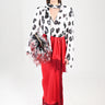 A fluid long-sleeve shirt crafted in lightweight creponne, featuring the same all-over print as the dress for a cohesive and refined look. The silhouette is soft and elegant, designed to move naturally with the body. The shirt is finished with a V-shaped hem, adding a subtle sense of elongation, and is detailed with two scarf-like panels at each side that fall delicately, creating movement and a distinctive layered effect. A sophisticated piece that blends fluidity, print, and modern femininity.