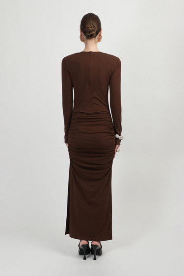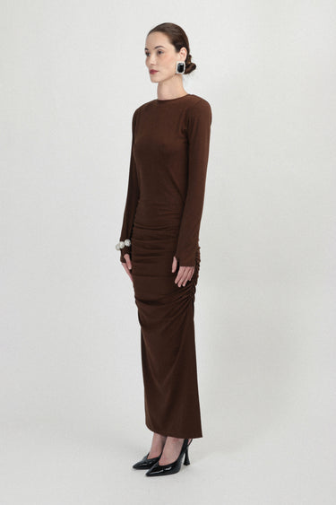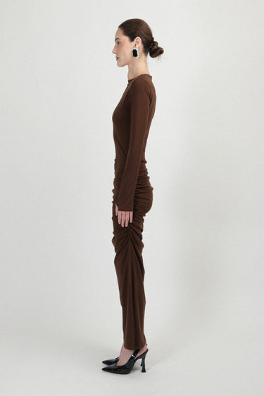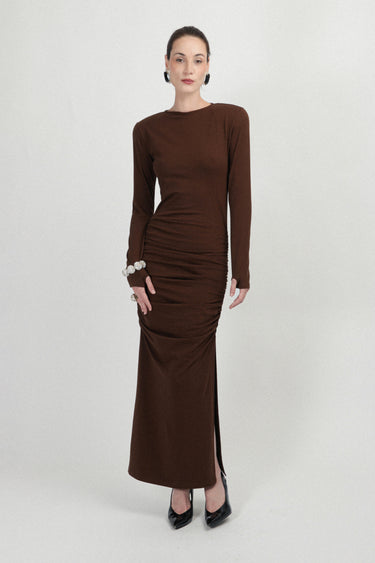 Crafted from a soft, form-fitting jersey, this sophisticated midi dress features a clean crew neckline and subtle shoulder pads that add refined structure to the silhouette. The skirt is artfully draped along the sides, enhancing the body’s natural curves while providing elegant texture and movement. A side slit lends a touch of allure, balancing the minimalist long sleeves with a feminine edge. Perfect for both day and evening occasions, this piece is effortlessly chic and endlessly versatile.