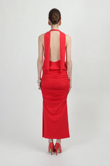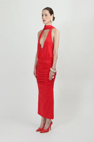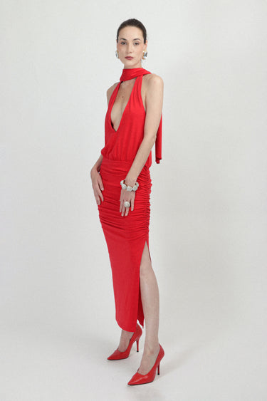 Elegant jersey midi dress with a deep plunging neckline and flattering ruched detailing at the sides. Designed with a removable matching scarf that can be styled around the neck or taken off for a cleaner look. The silhouette is sleek and sculpting, finished with a concealed zip at the back and no pockets for a smooth finish.