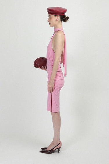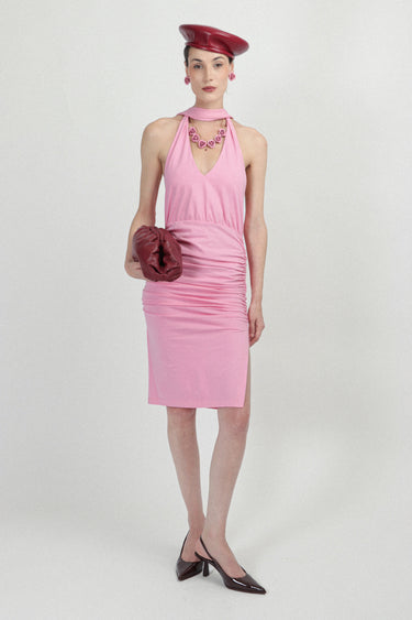 Elegant jersey short dress with a deep plunging neckline and flattering ruched detailing at the sides. Designed with a removable matching scarf that can be styled around the neck or taken off for a cleaner look. The silhouette is sleek and sculpting, finished with a concealed zip at the back and no pockets for a smooth finish.