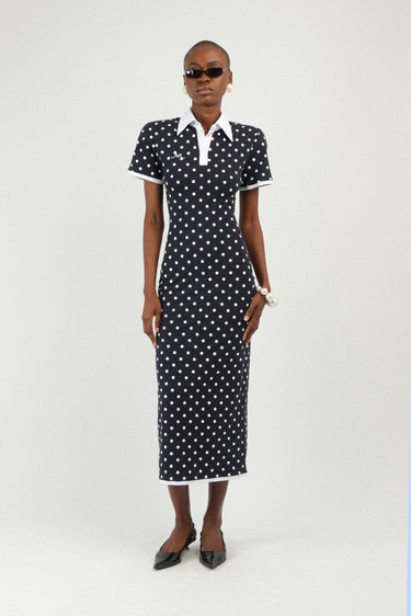 Indulge in our iconic jersey polo dress adorned with a charming polka dot pattern. This delightful piece boasts a flattering silhouette, dainty short sleeves, and a sultry back slit. Experience ultimate luxury with subtle shoulder pads.