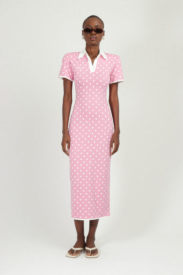 Indulge in our iconic jersey polo dress adorned with a charming polka dot pattern. This delightful piece boasts a flattering silhouette, dainty short sleeves, and a sultry back slit. Experience ultimate luxury with subtle shoulder pads.