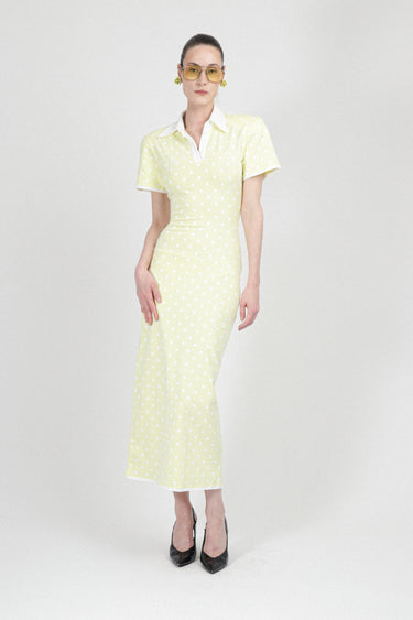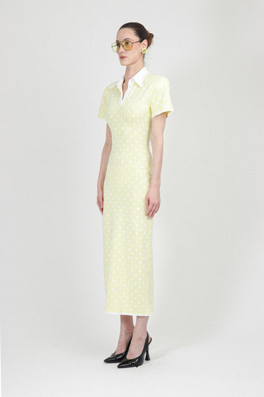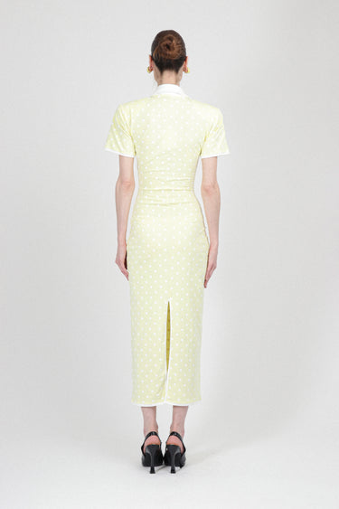 Indulge in our iconic jersey polo dress adorned with a charming polka dot pattern. This delightful piece boasts a flattering silhouette, dainty short sleeves, and a sultry back slit. Experience ultimate luxury with subtle shoulder pads.