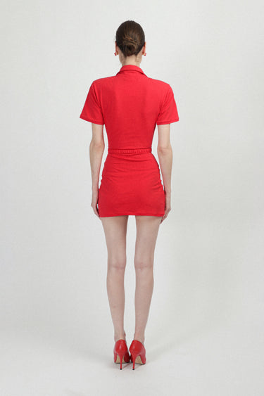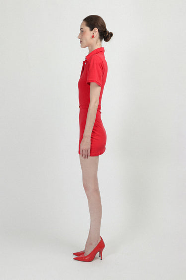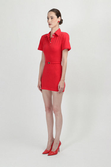 Elevate your wardrobe with our Short Sleeves Jersey Mini Polo Dress, designed to flatter your silhouette with its tailored shape and delicate short sleeves. The coordinating belt with a gold buckle adds a touch of sophistication, while subtle shoulder pads enhance the dress’s refined elegance.