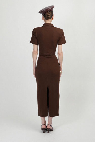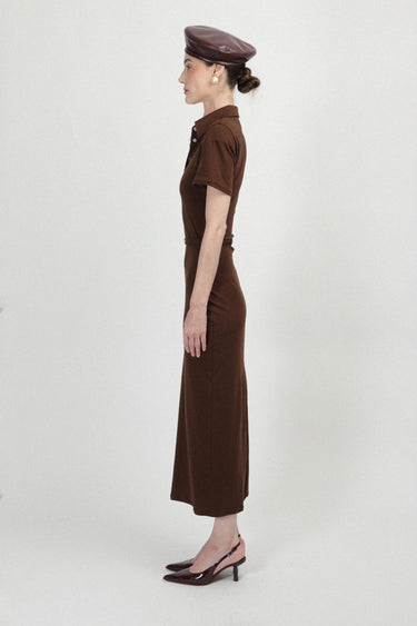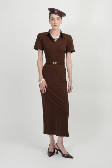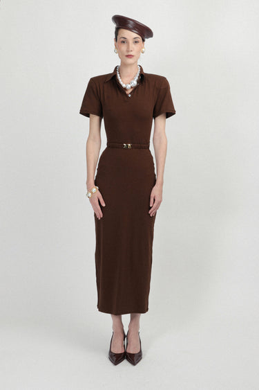 Experience elegance with our signature jersey polo dress, featuring a coordinating belt with a gold buckle. This exquisite design highlights a flattering shape, delicate short sleeves, and a seductive back slit. Enhanced with subtle shoulder pads, it offers a refined touch of luxury.