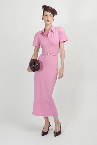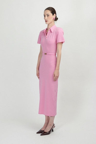 Experience elegance with our signature jersey polo dress, featuring a coordinating belt with a gold buckle. This exquisite design highlights a flattering shape, delicate short sleeves, and a seductive back slit. Enhanced with subtle shoulder pads, it offers a refined touch of luxury.