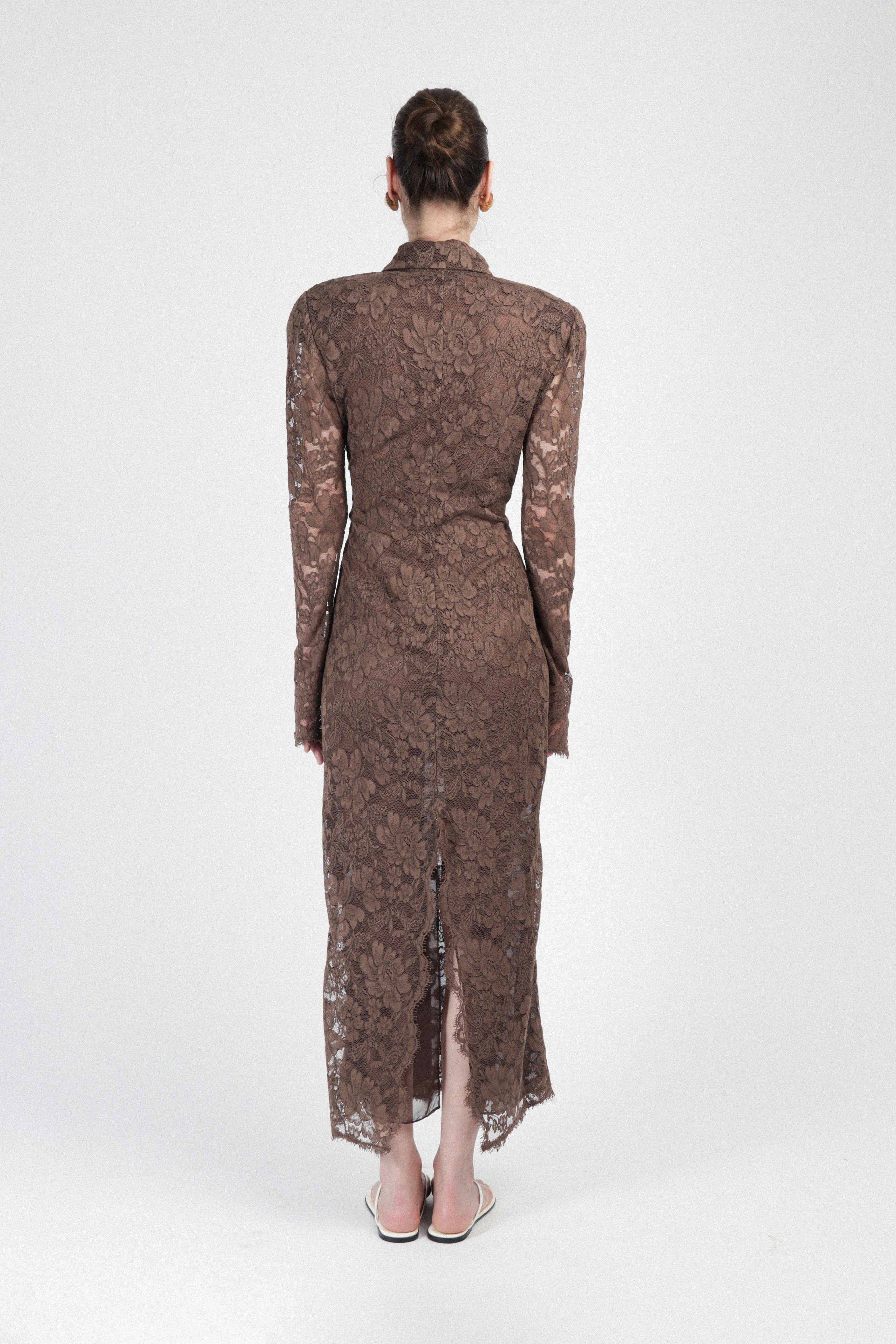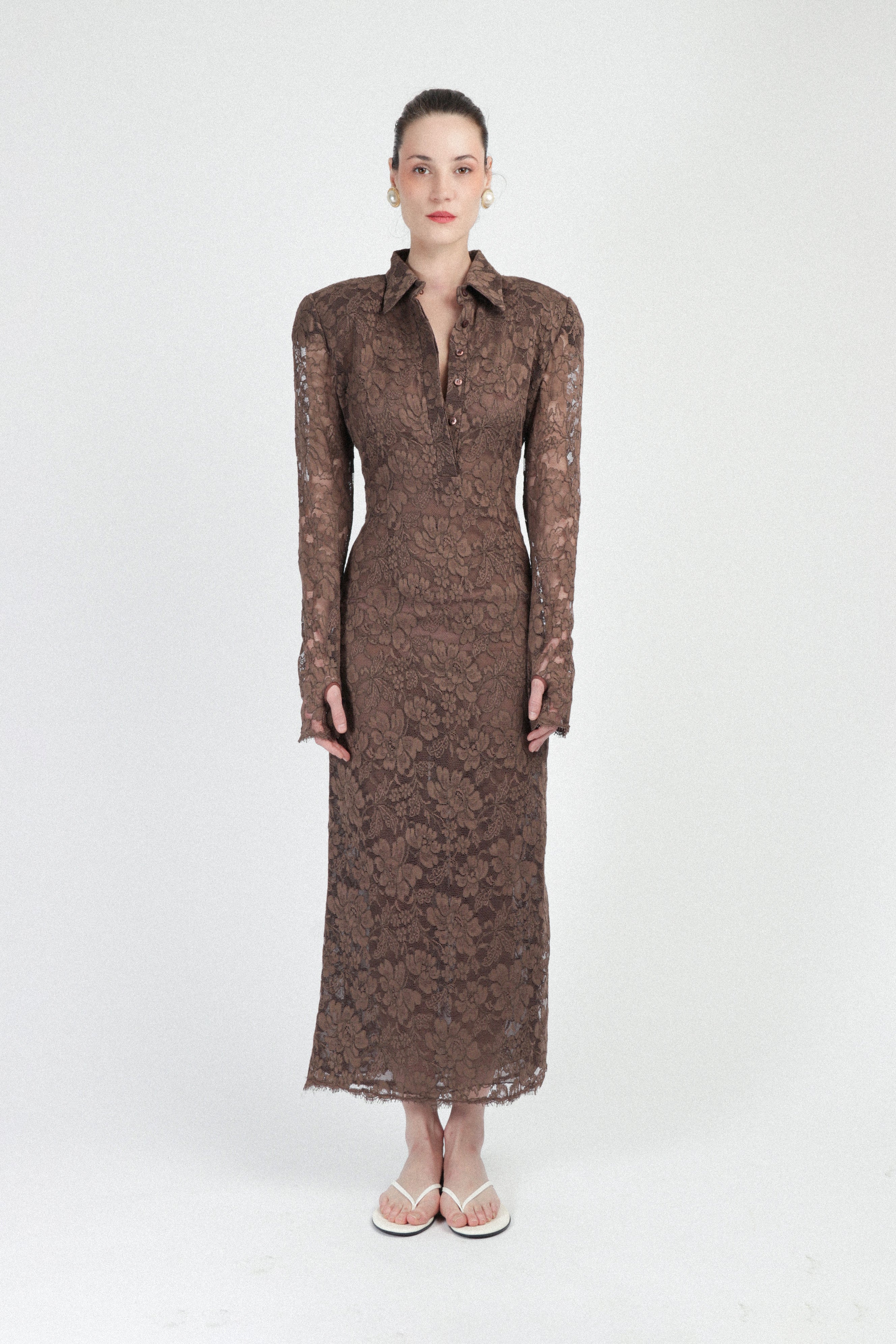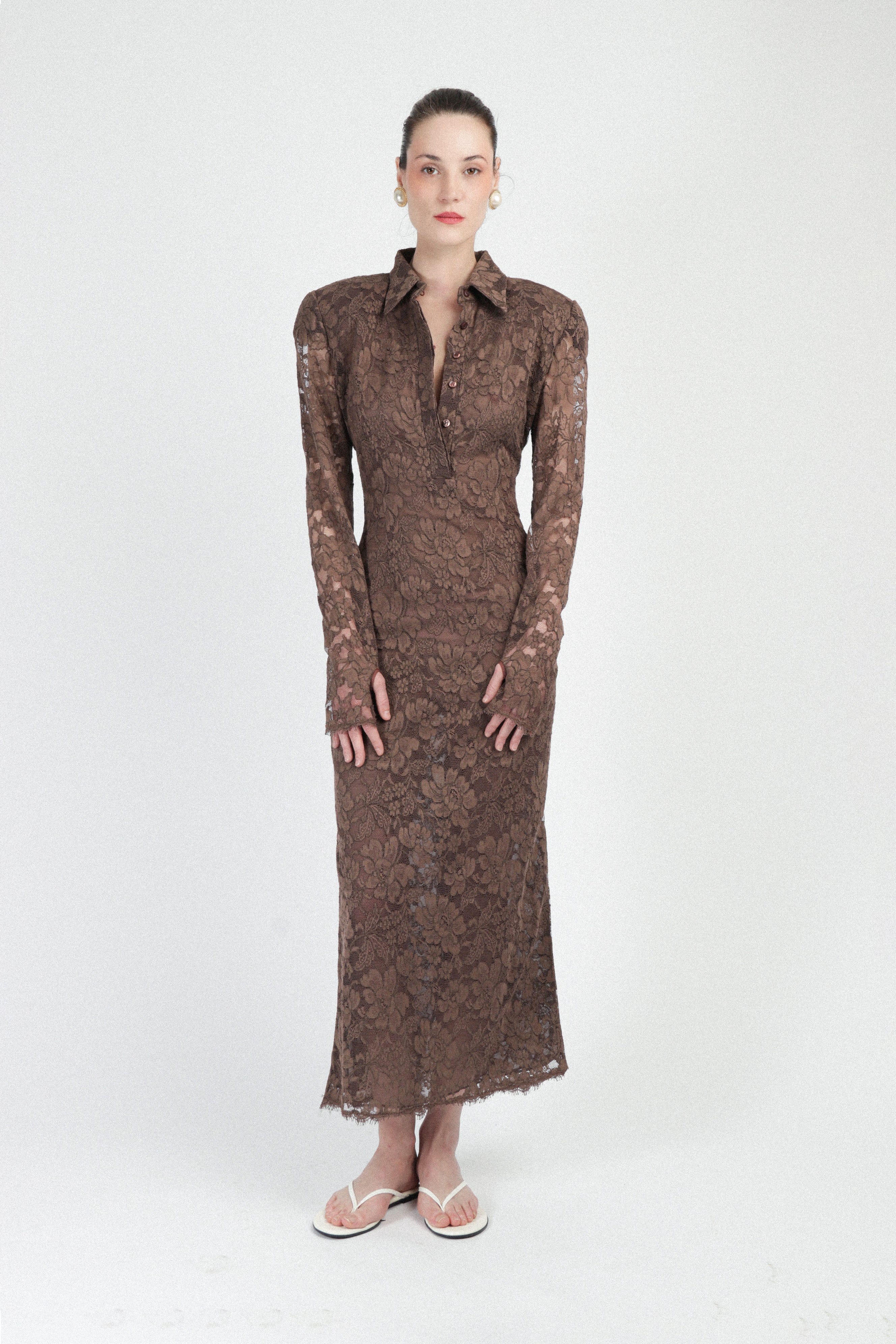 Fitted long dress crafted from sheer floral lace, featuring a classic shirt collar and a deep neckline with invisible buttons along the front placket. Long sleeves with scalloped cuffs and hem. See through design, no pockets, with concealed side zipper.