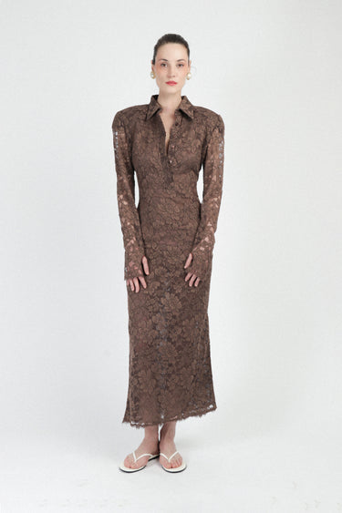 Elegant fitted long dress crafted from delicate sheer floral lace, featuring a structured shirt collar and deep neckline with invisible button closure. Detailed with scalloped cuffs and hem for a refined finish. Fully sheer design, no pockets, with concealed side zipper for a sleek silhouette. A sophisticated statement piece, perfect for evening and special occasions.
