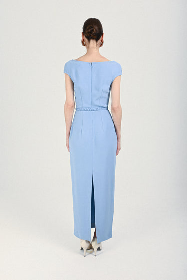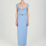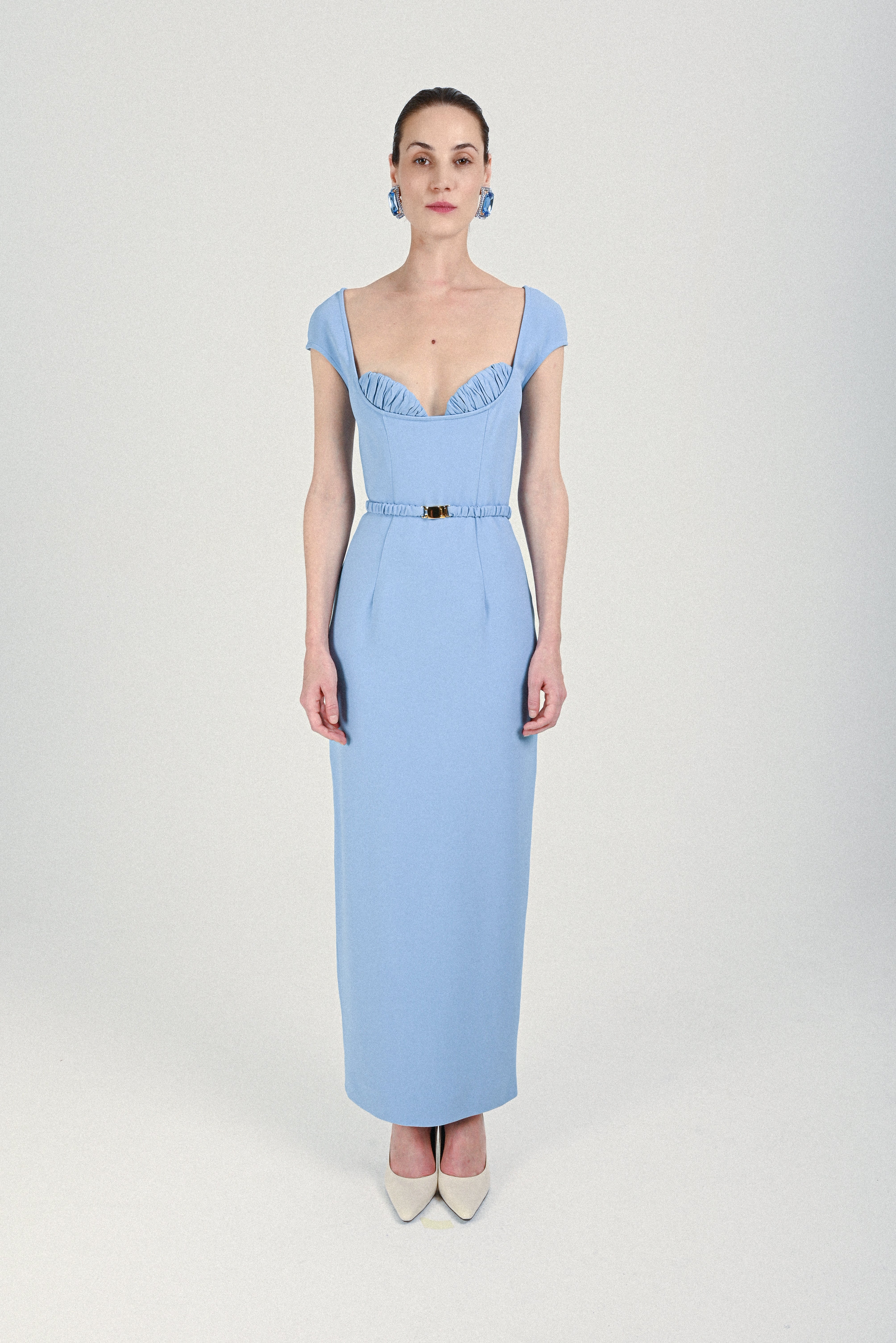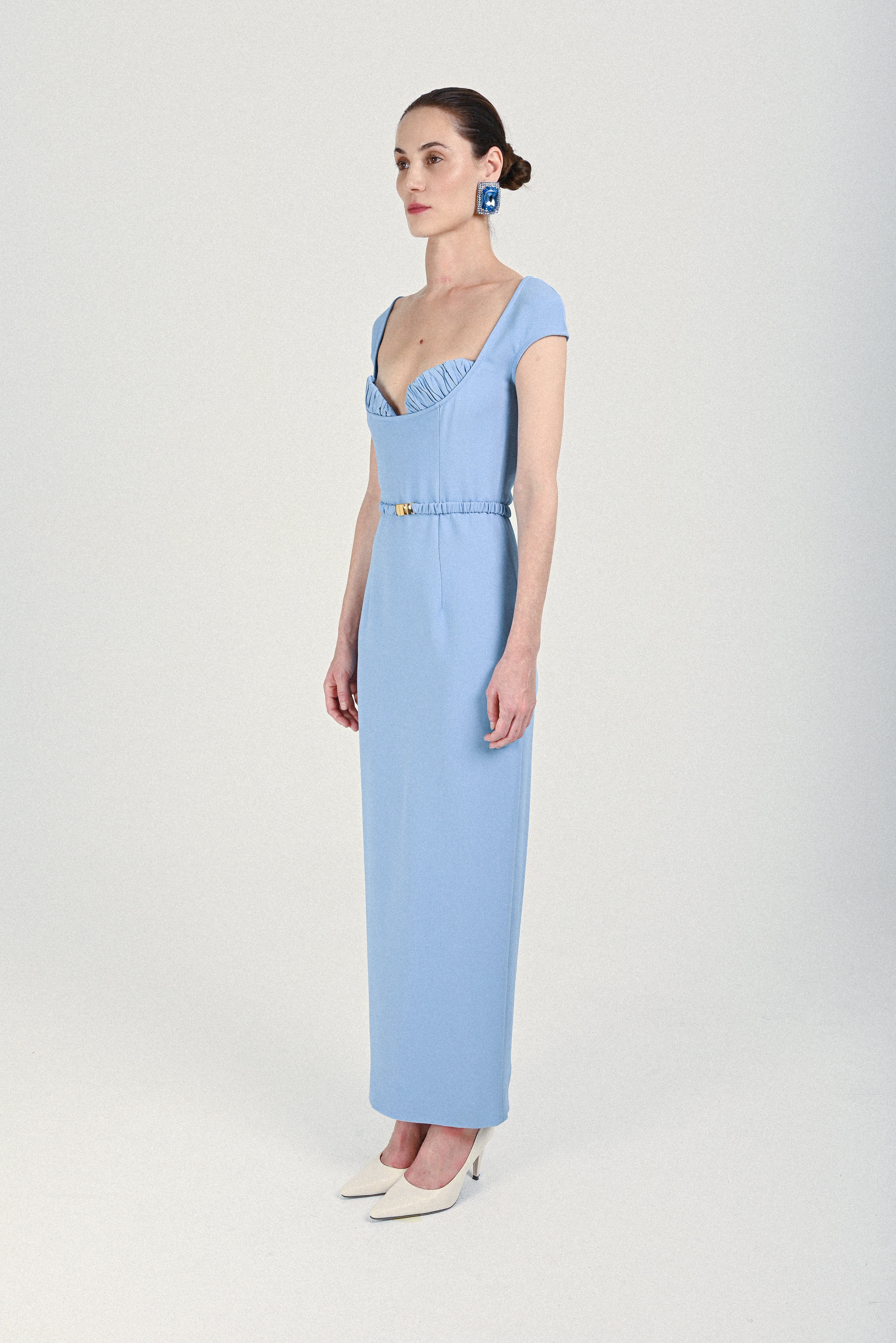 This refined dress in sky blue sable features a sleek, elongated silhouette that exudes timeless sophistication. Designed with a flattering half-exposed cup detail, it offers a bold yet feminine touch. The integrated belt cinches the waist for a structured, elegant shape, while the clean lines and floor-length cut enhance its graceful appeal. A statement piece that seamlessly combines modern sensuality with classic tailoring.