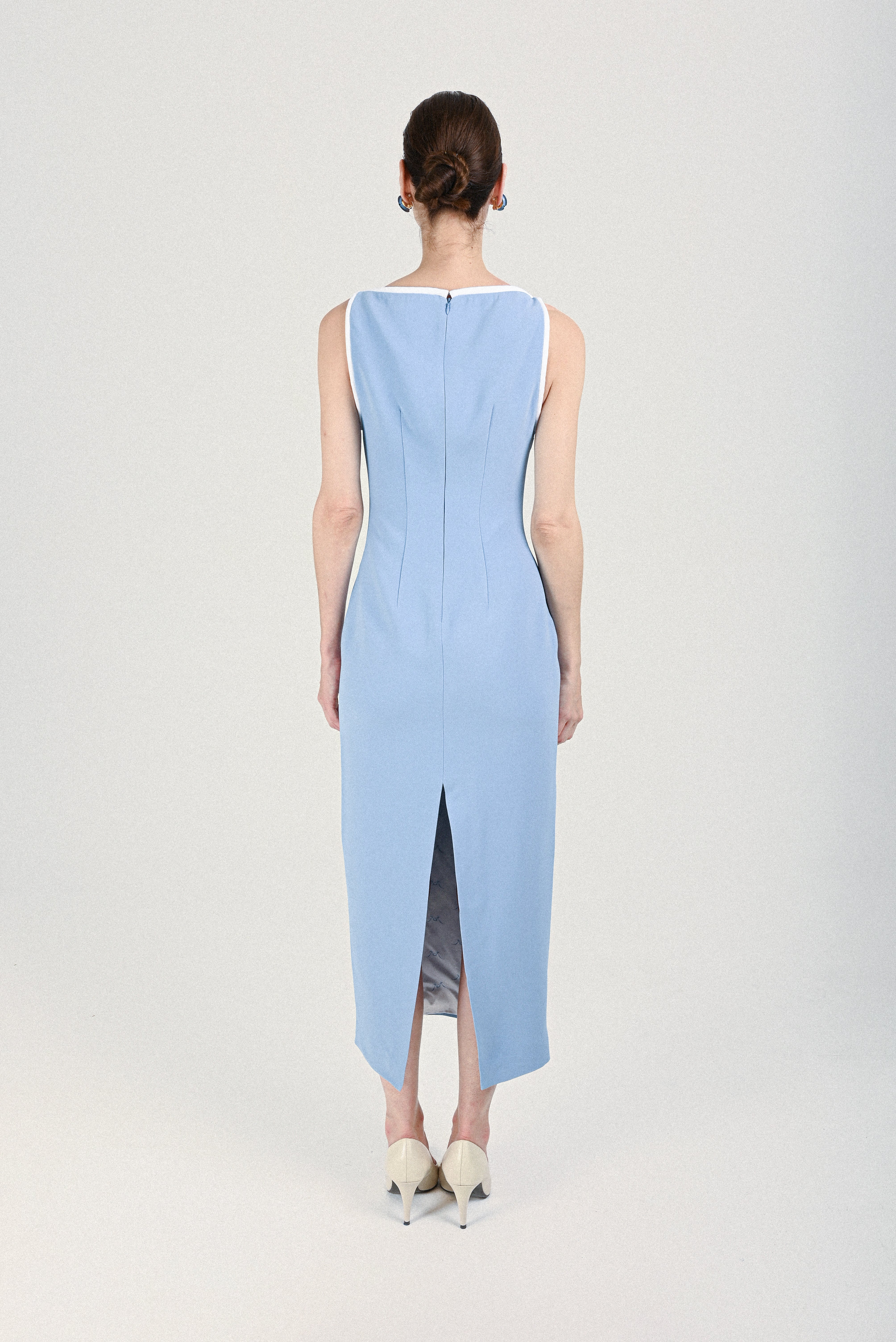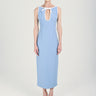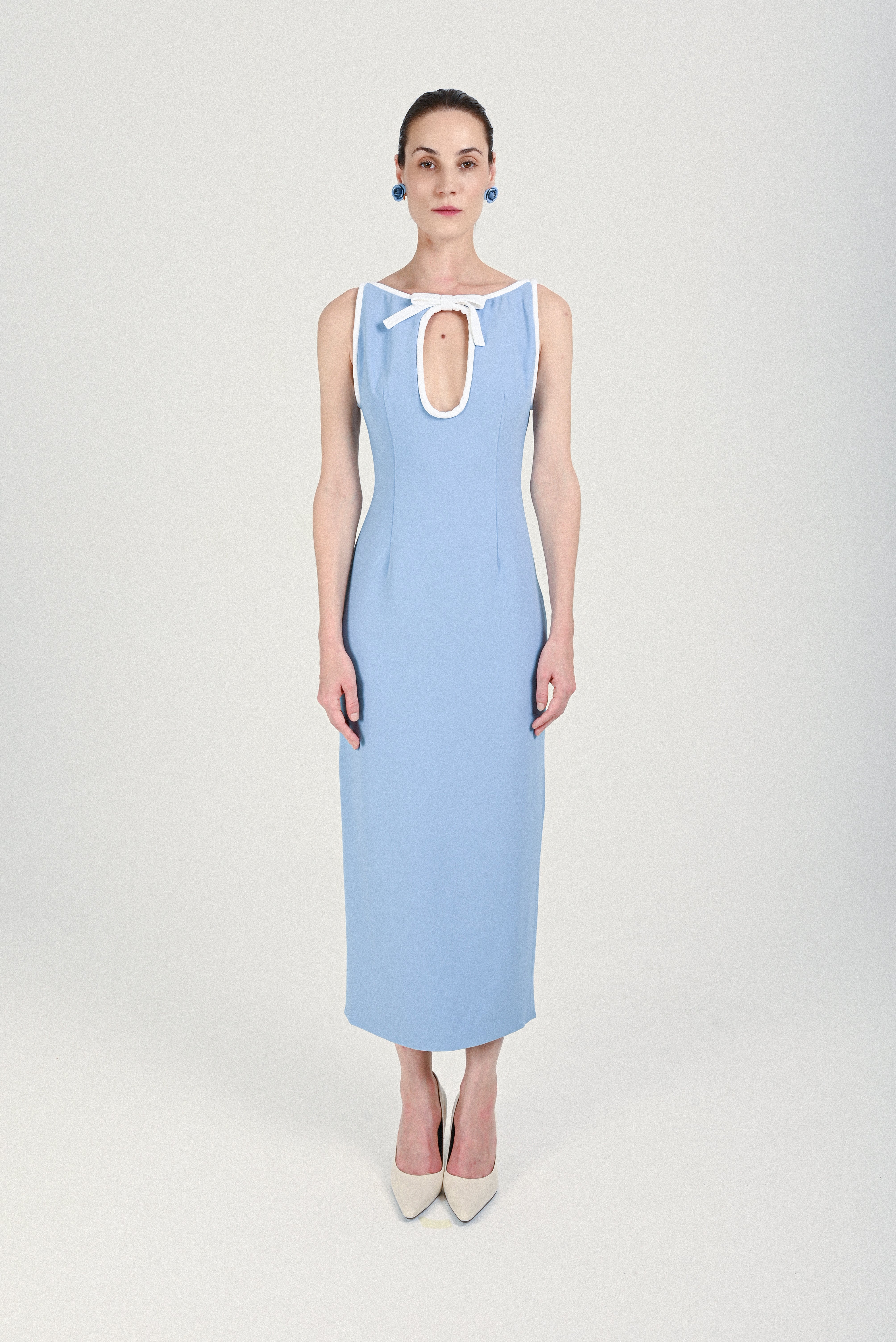 Crafted from structured sky blue sablé, this sleeveless midi dress features a signature oval cut-out at the chest, framed with contrasting white trim and tied with a delicate bow. The fabric’s subtle texture enhances the dress’s sculptural silhouette, hugging the body in all the right places. Finished with a clean mid-length hem, this piece blends retro elegance with a bold, modern twist.