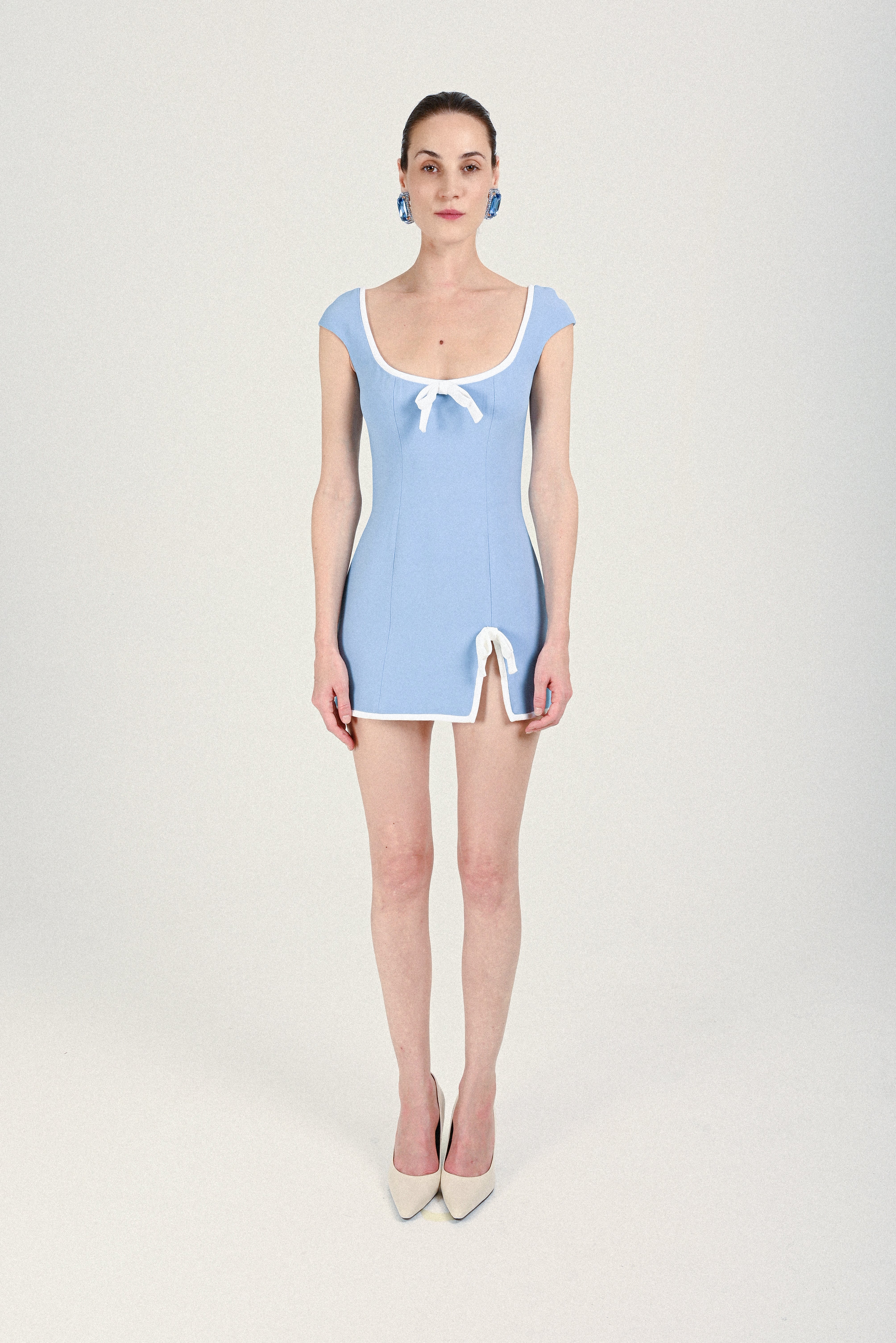 Experience the iconic beauty of Rowen Rose with our mini dress featuring a stunning corseted effect. This form-fitting piece elegantly hugs the body, enhanced by delicate shoulder pads, a squared neckline, and a back zip closure.