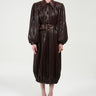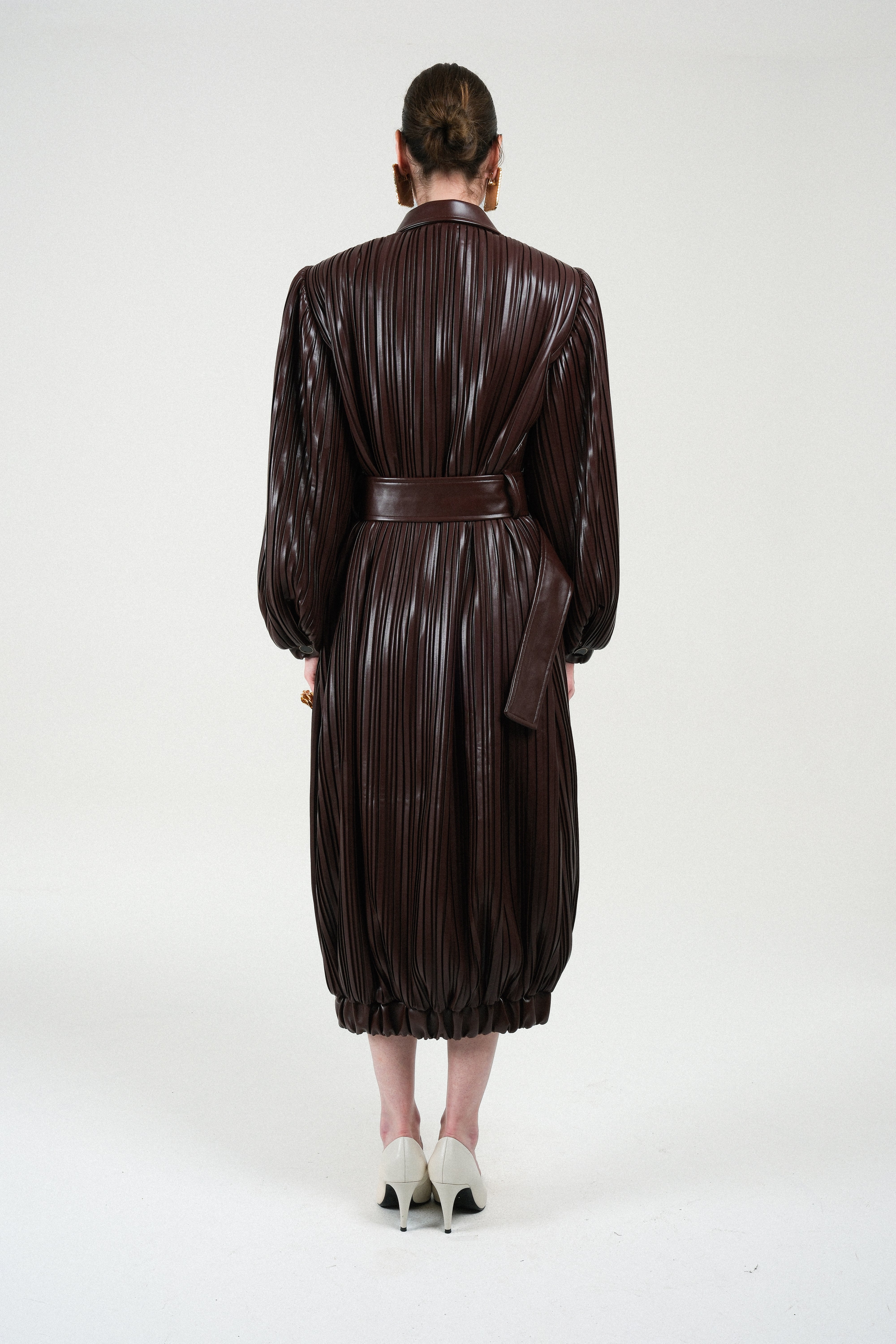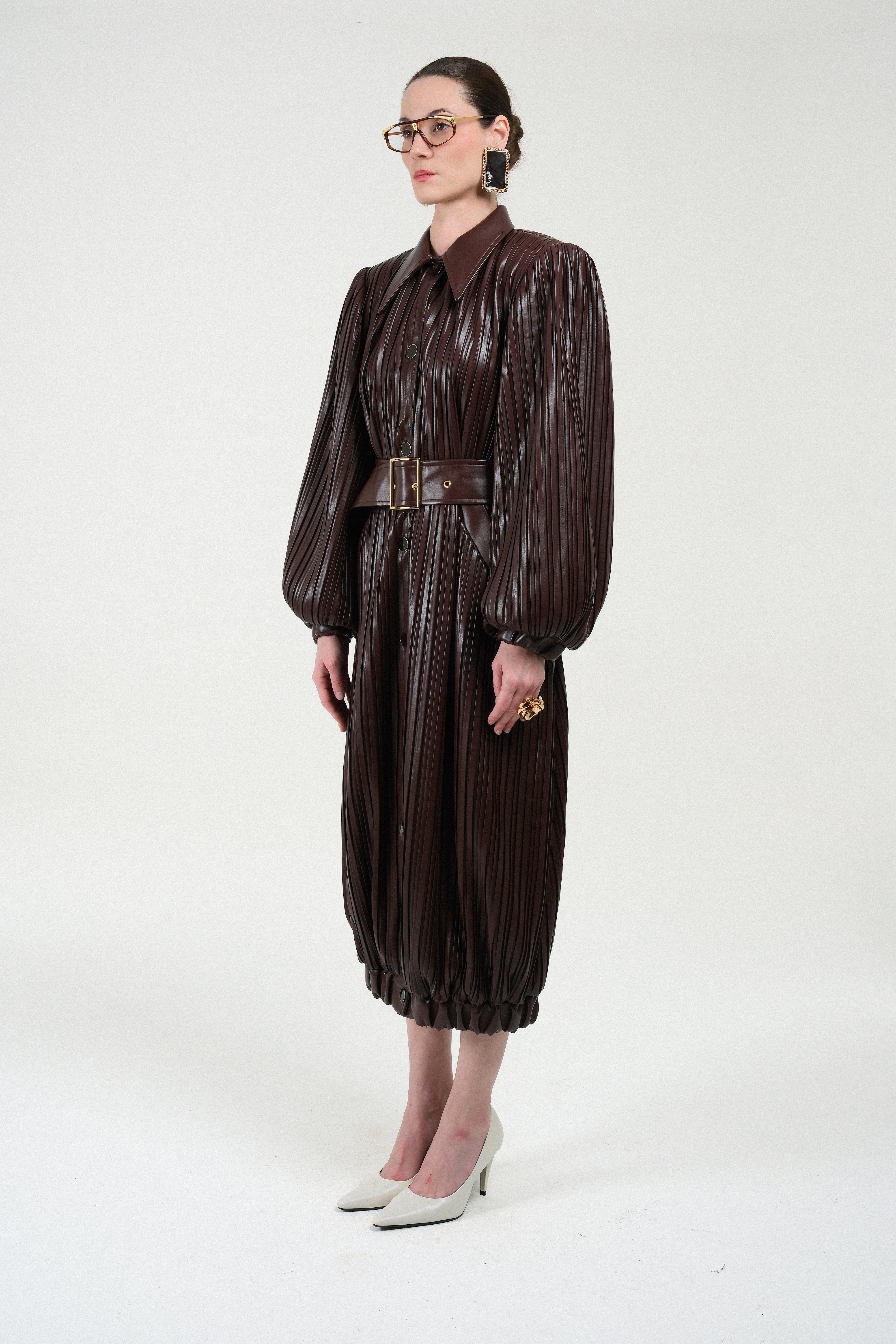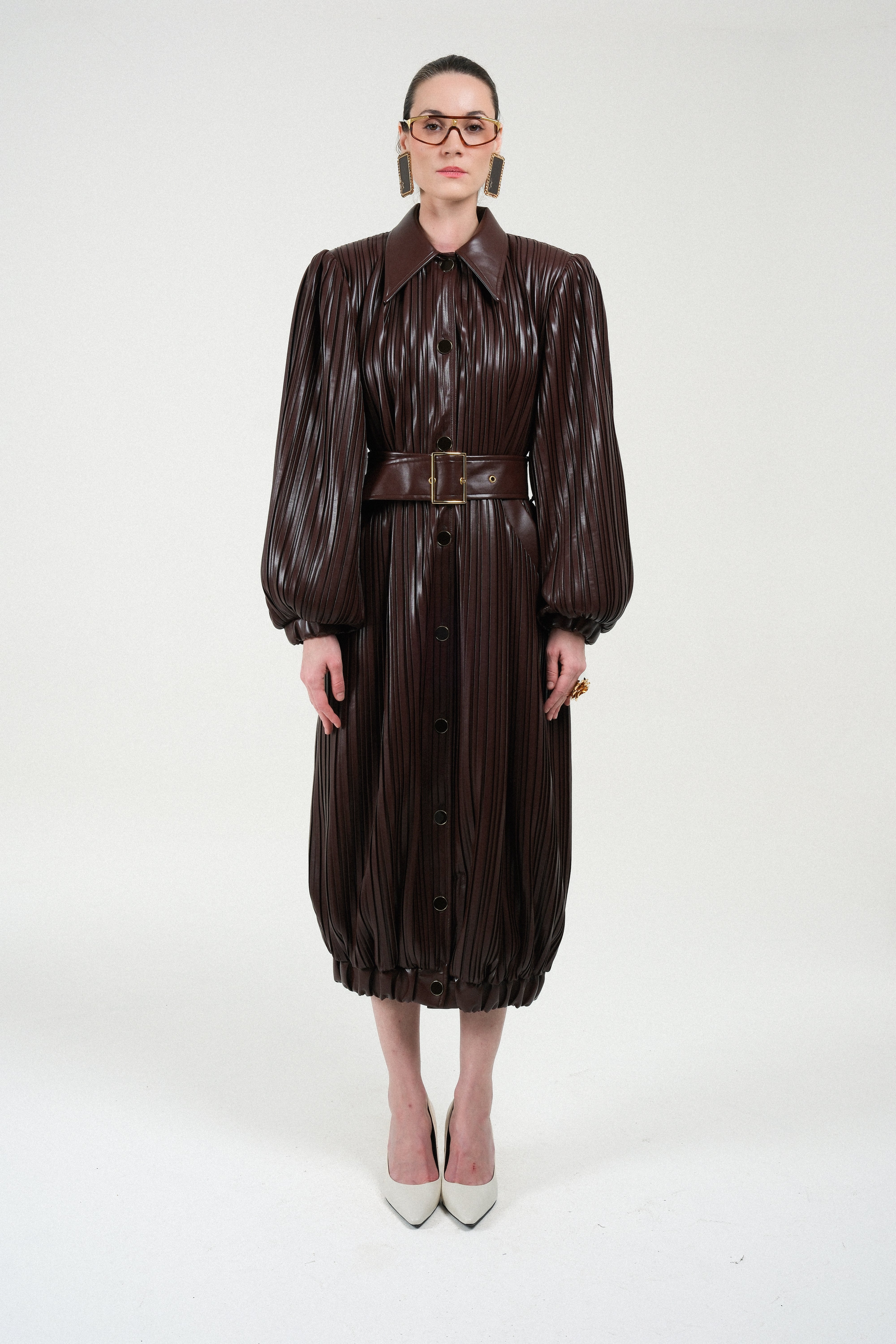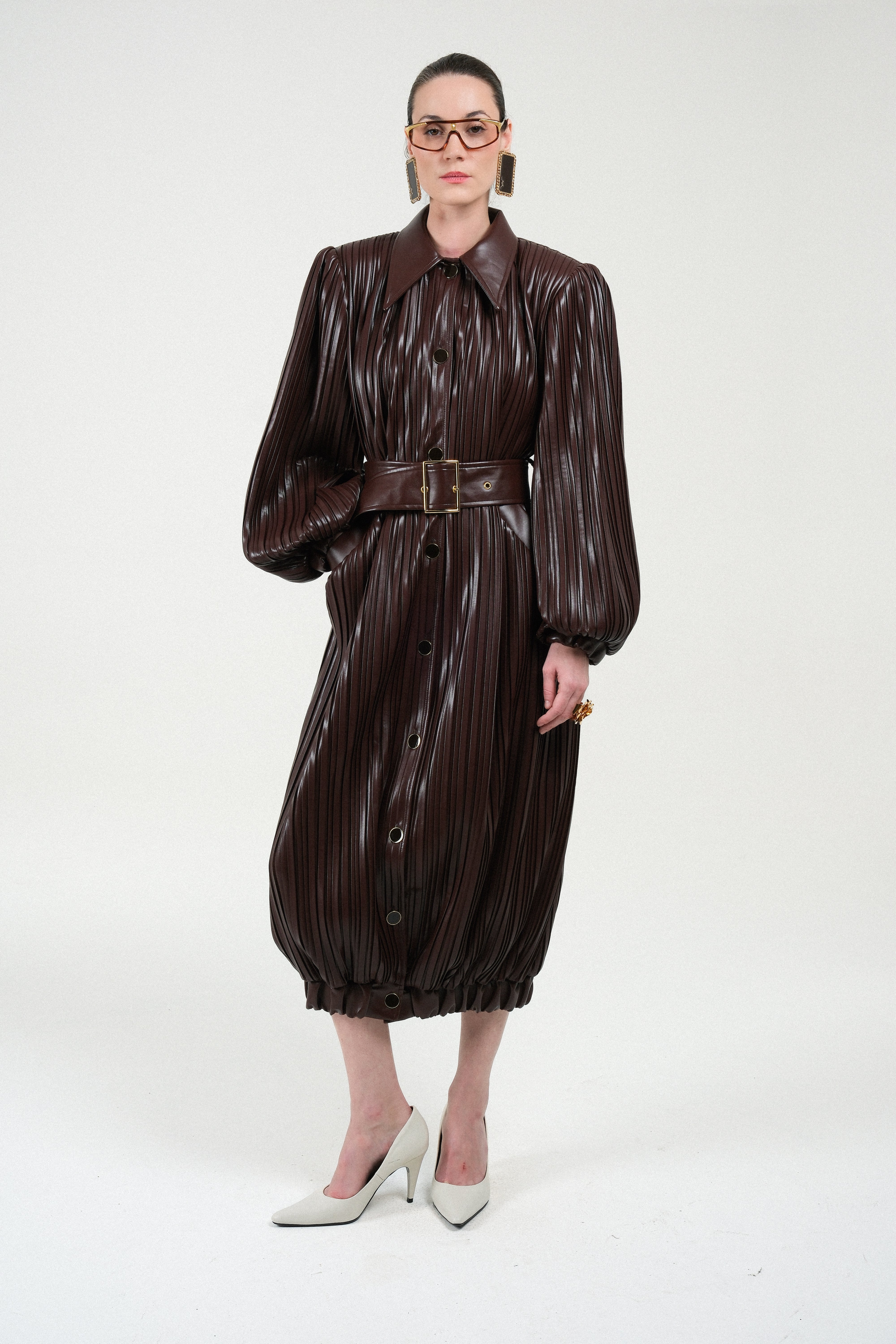 A sculptural trenchcoat crafted from richly textured, pleated leather in a deep chocolate tone. Its dramatic balloon sleeves, oversized collar, and full button-through front elevate the traditional trench silhouette into a bold, fashion-forward statement. The matching wide belt, finished with a lacquered gold-tone buckle, defines the waist and enhances the coat’s architectural volume.