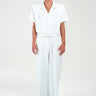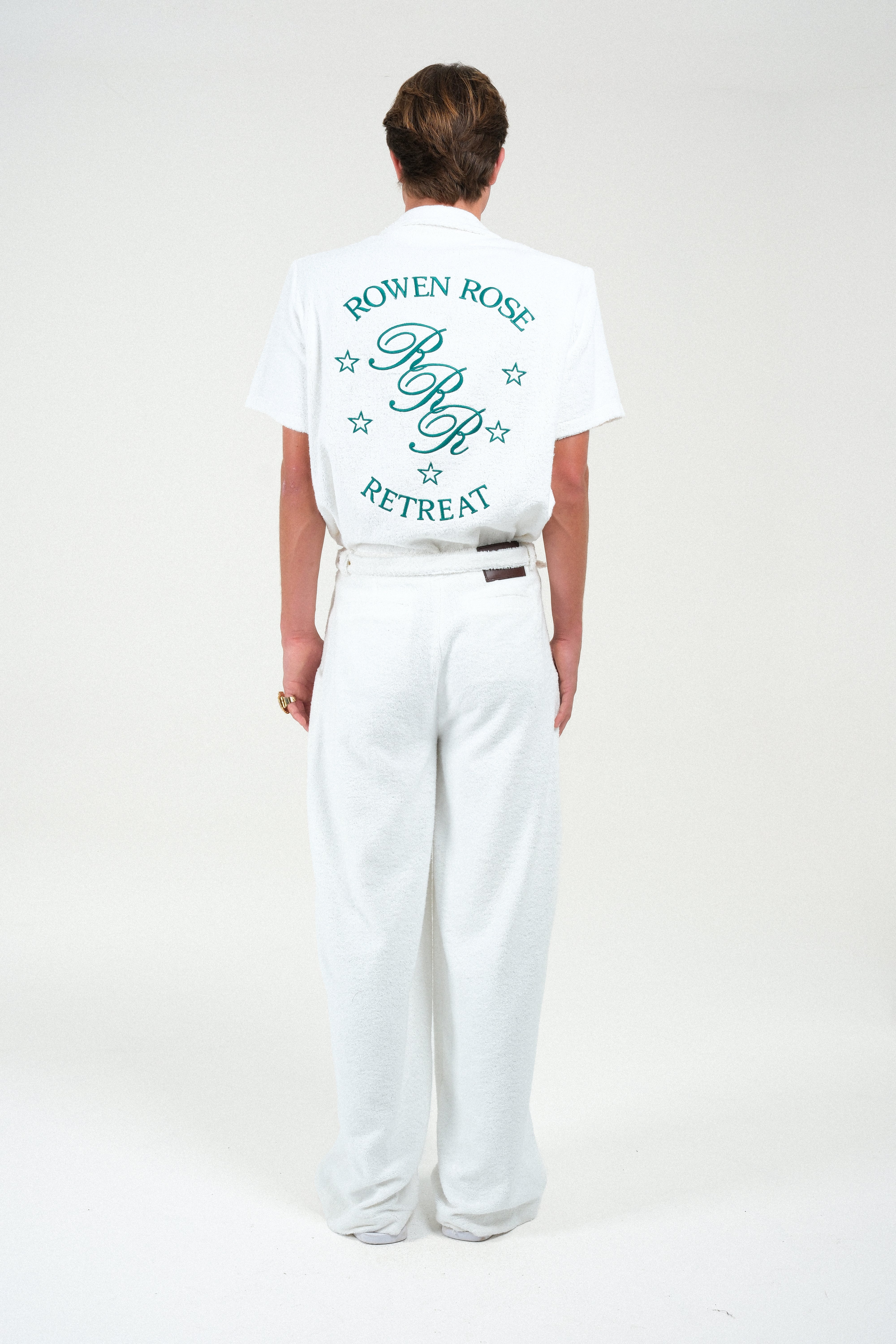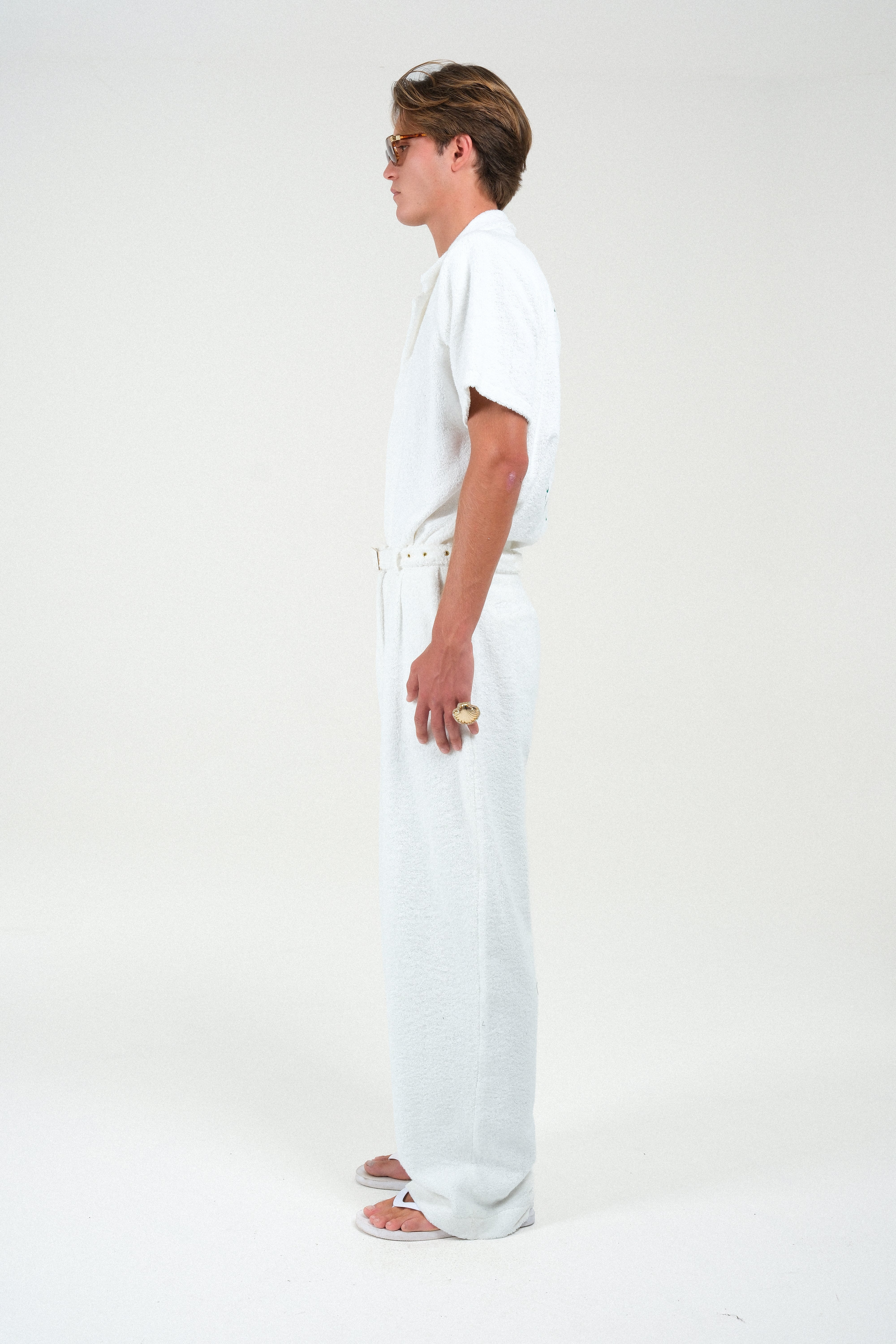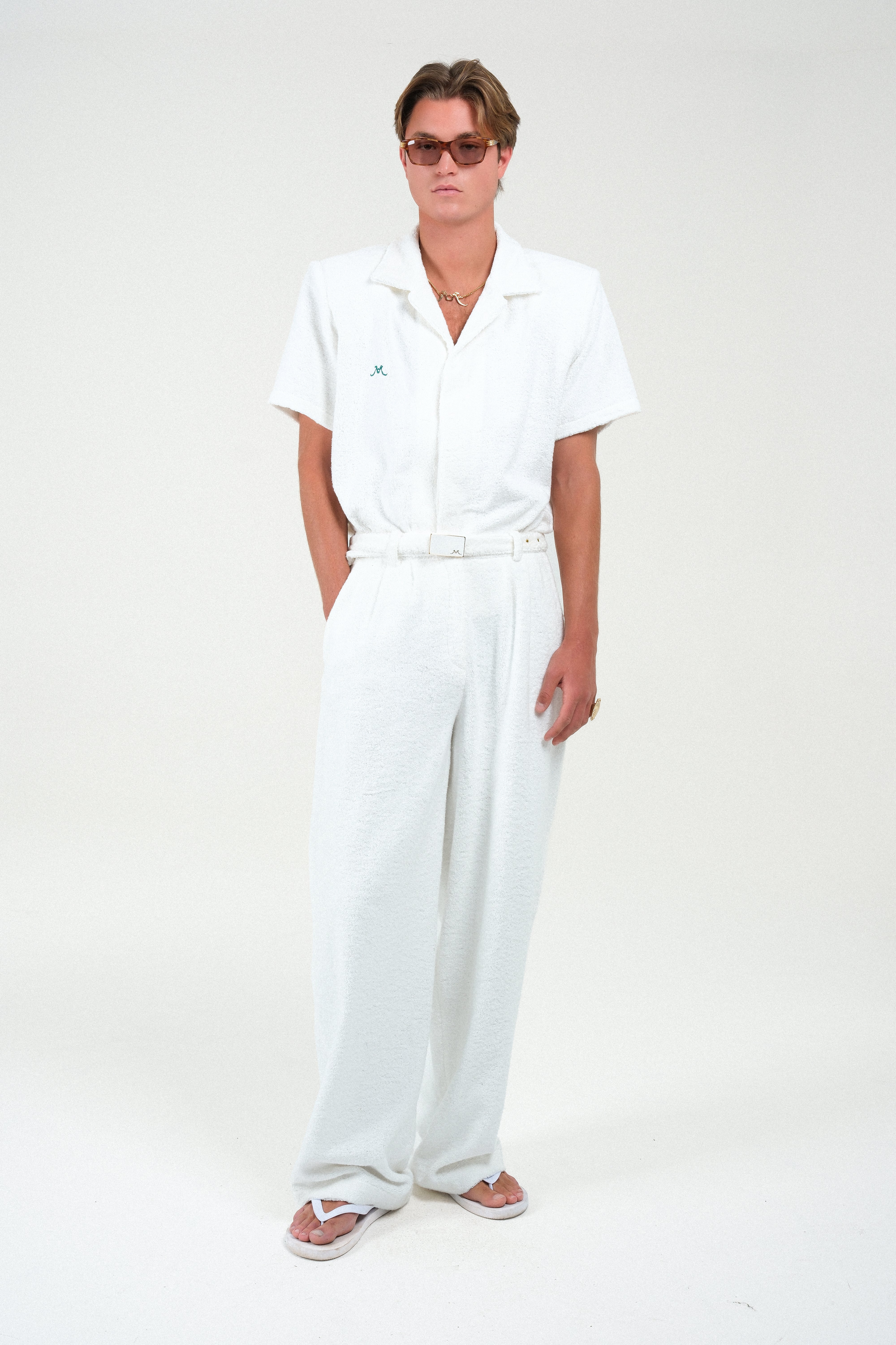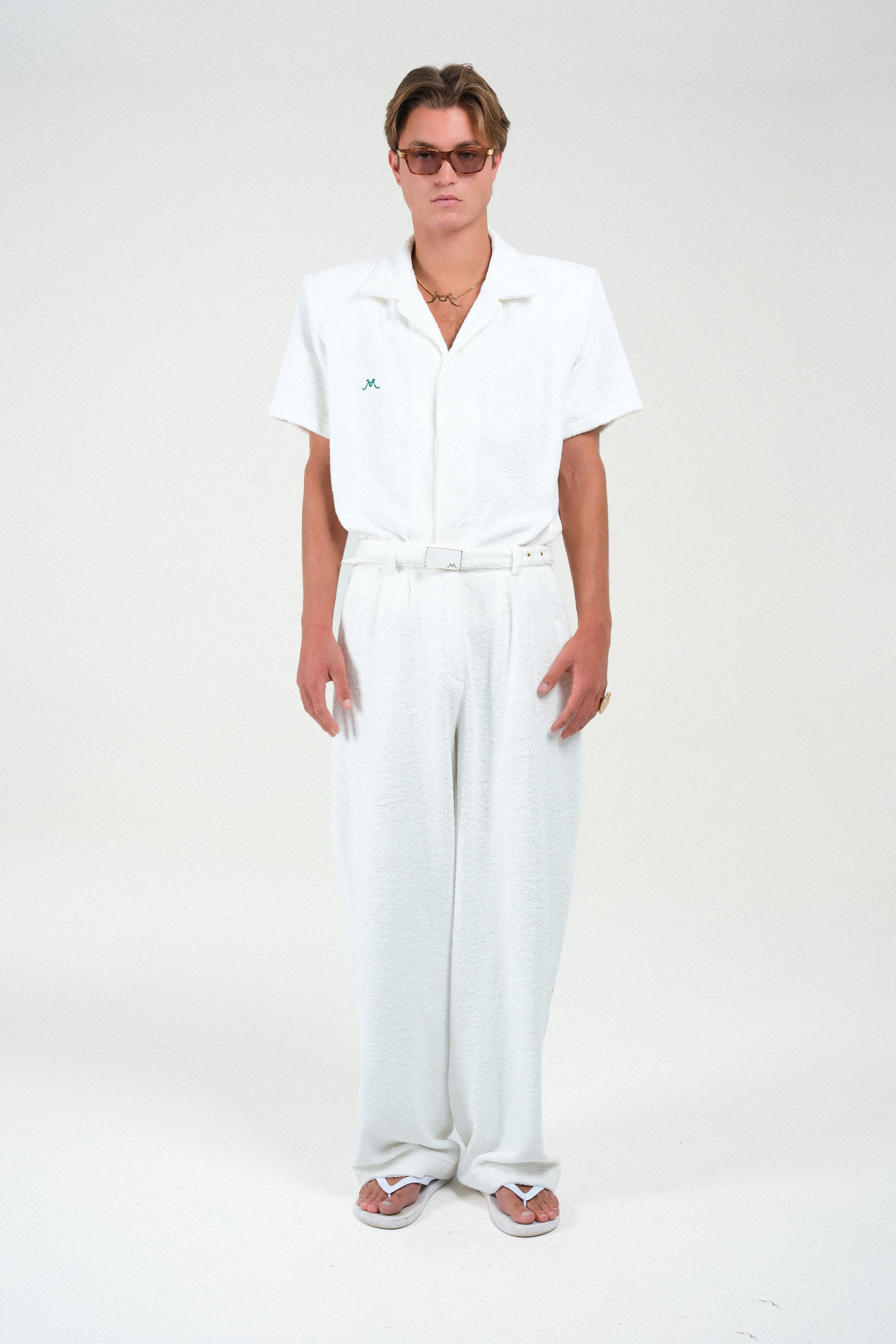 These Terry Cloth Trousers offer the ultimate blend of comfort and resort-ready style, perfectly matching our embroidered polo shirt. Cut for a straight, relaxed fit, they feature a plush terry cloth fabric and functional pockets. The look is completed by a sophisticated built-in belt with a sleek, tonal lacquered buckle, providing a polished, monochromatic finish. An essential piece for an effortlessly chic ensemble.