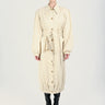 Long jacket in beige gabardine featuring signature gold-tone snap buttons, integrated belt, and gathered hem. Designed with puffed sleeves, front flap pockets, and sharp collar for a structured silhouette.