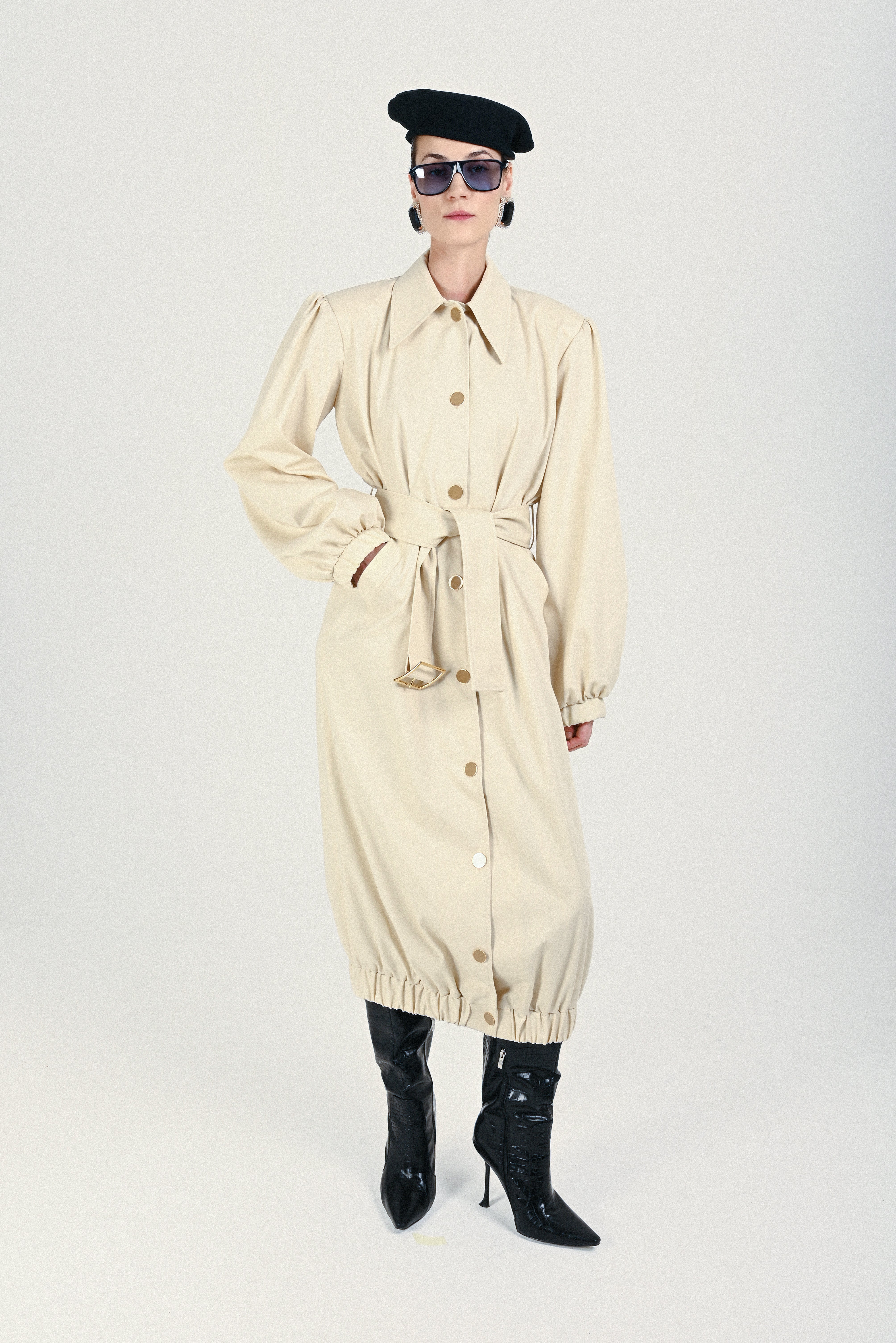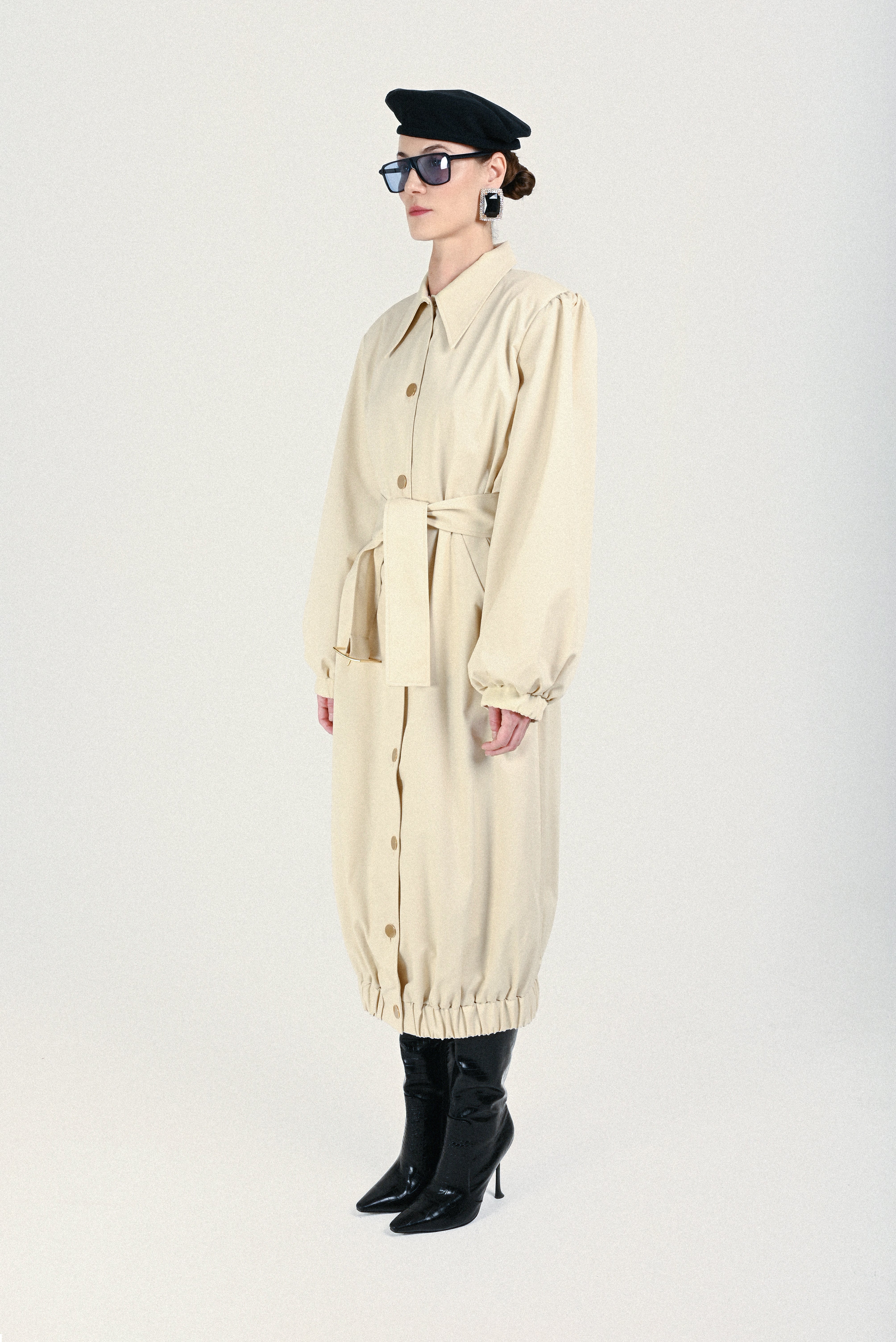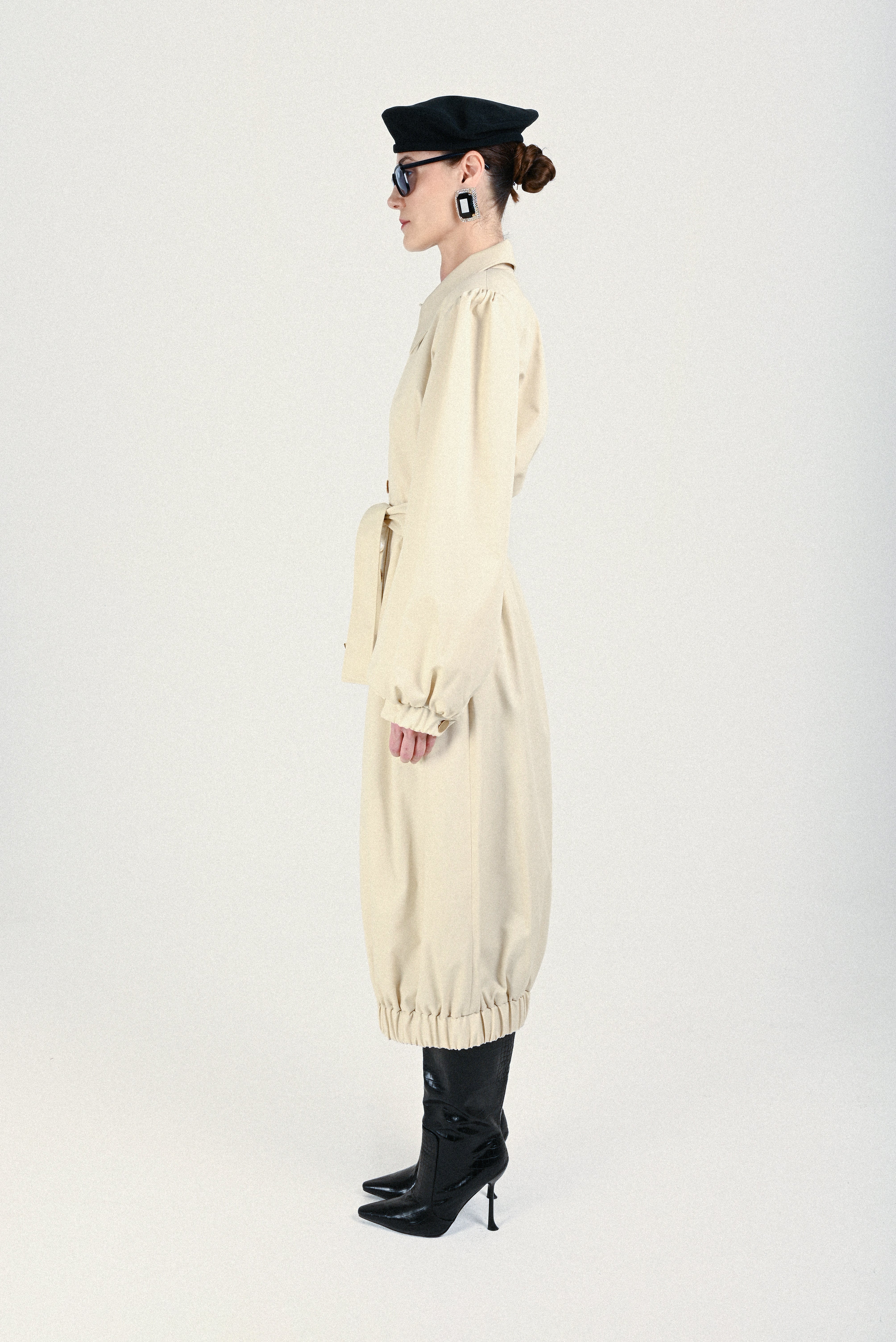 Elevate your outerwear with this elegant long coat crafted from rich beige gabardine. Designed with a flattering silhouette, it features an integrated belt to accentuate the waist and a distinctive gathered hem for a modern, voluminous finish. Gold-tone snap buttons add a refined touch, while the puffed sleeves and sharp collar bring a timeless appeal.