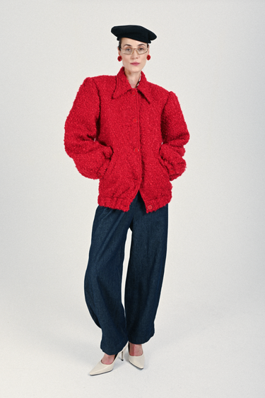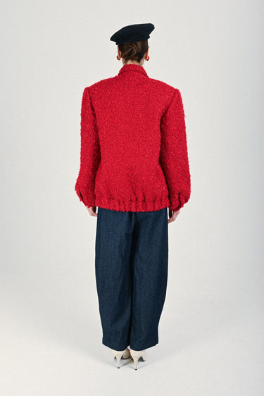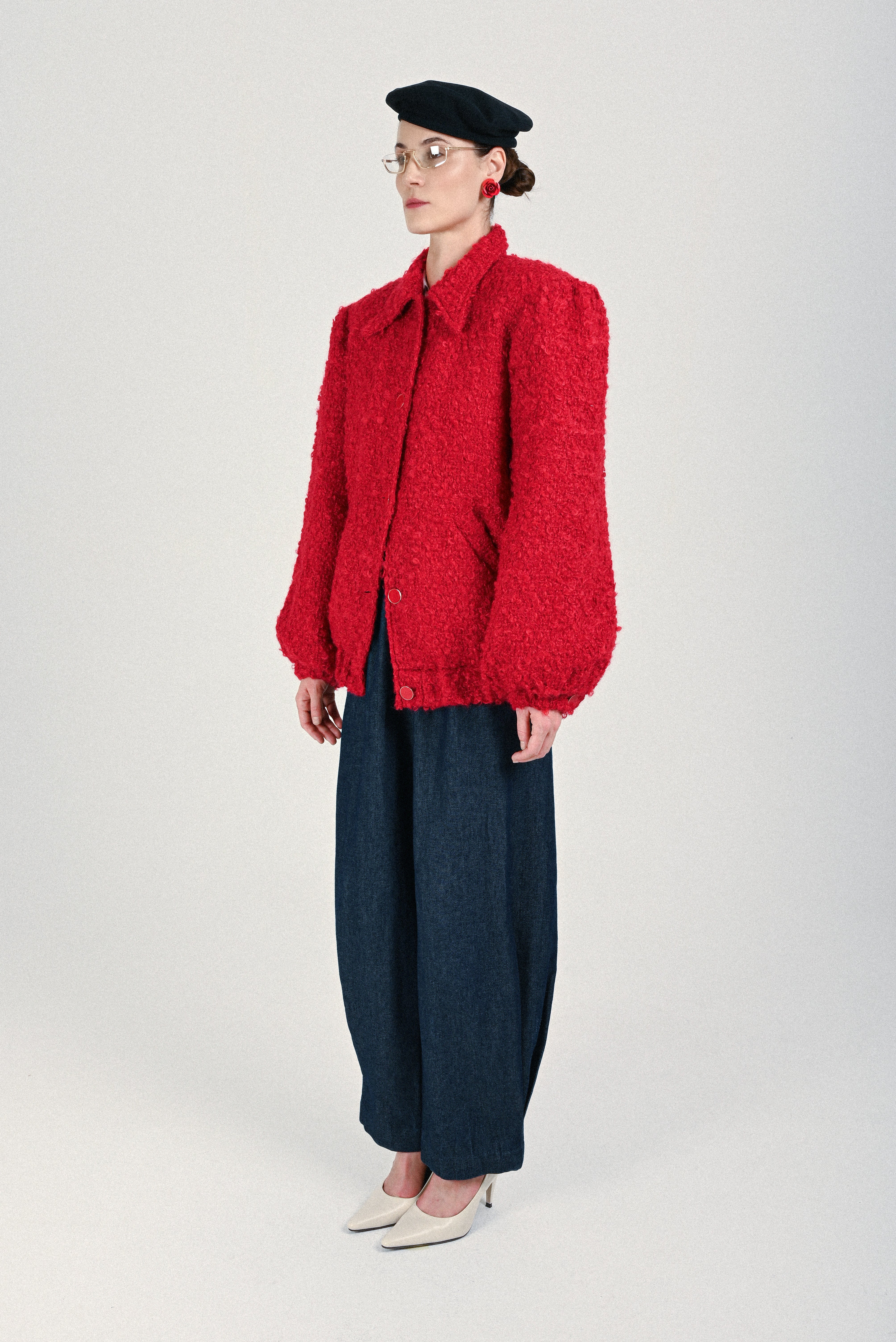 Introducing our Raglan Puffy Bomber in warm red tweed. With its luxurious feel and versatile design, this coat is the ultimate wardrobe essential for any occasion. Featuring an oversized fit, signature buttons, raglan sleeves, and round shoulder pads, it exudes strength and elegance. Stay warm on chilly days with its quilted interior and convenient side pockets.