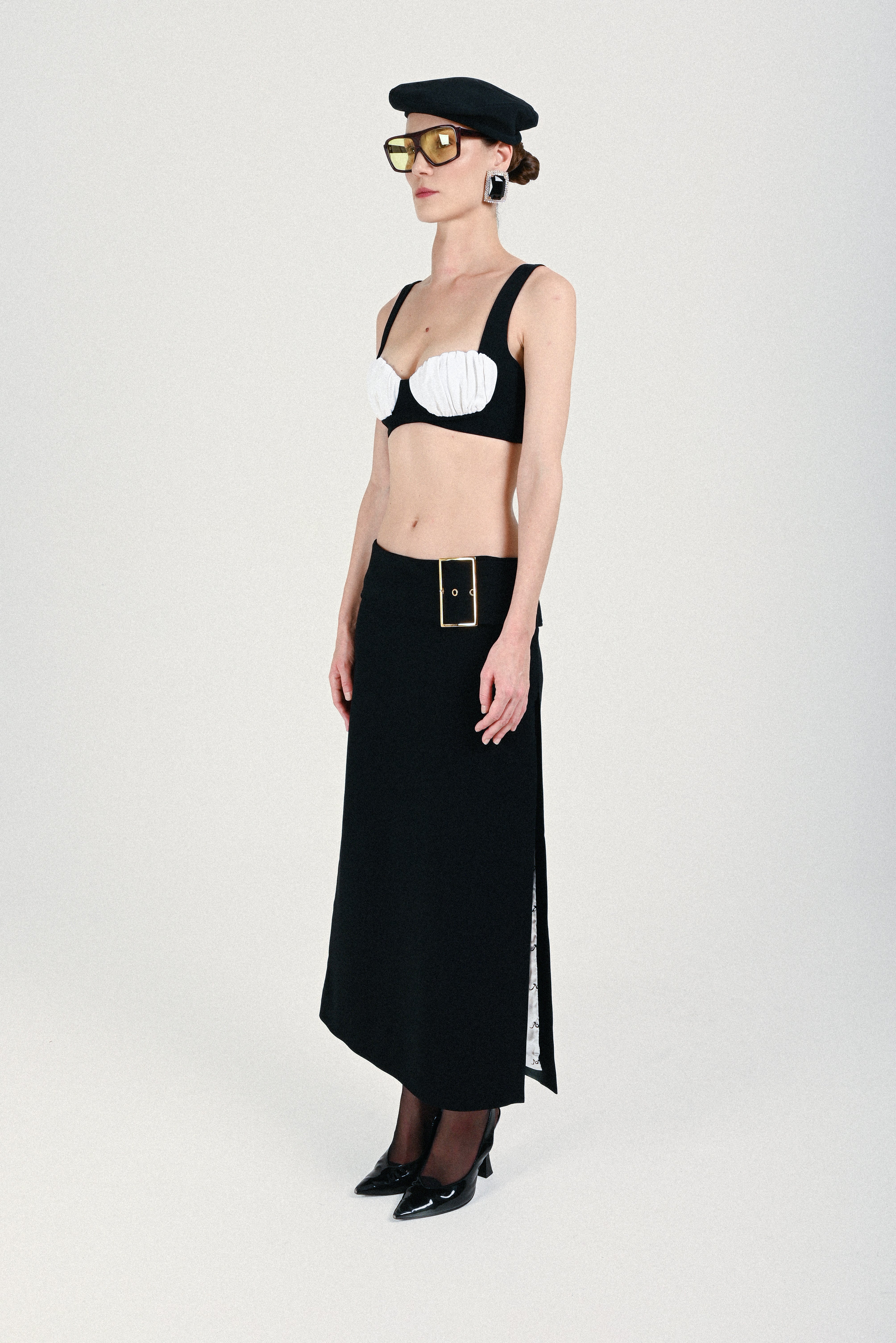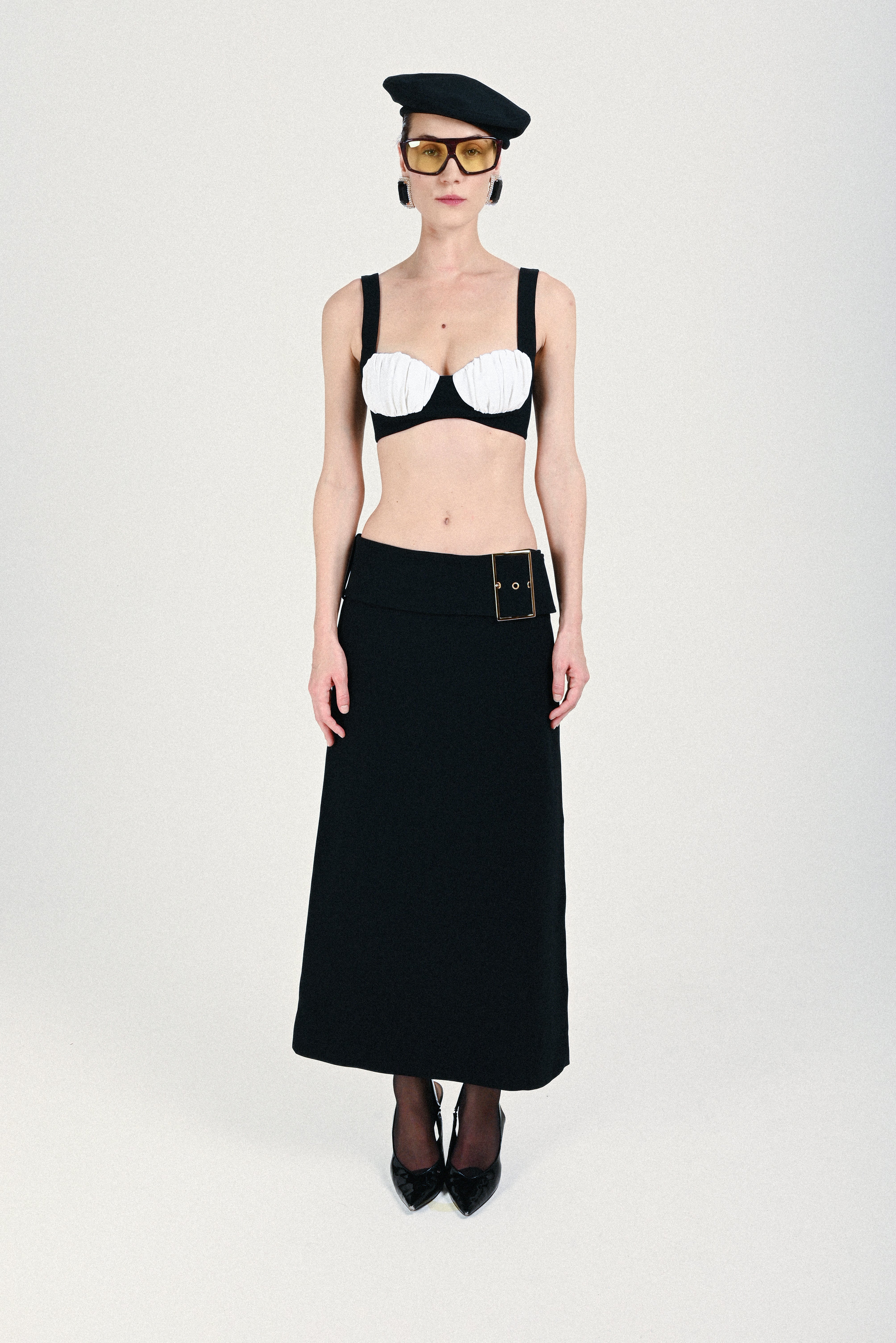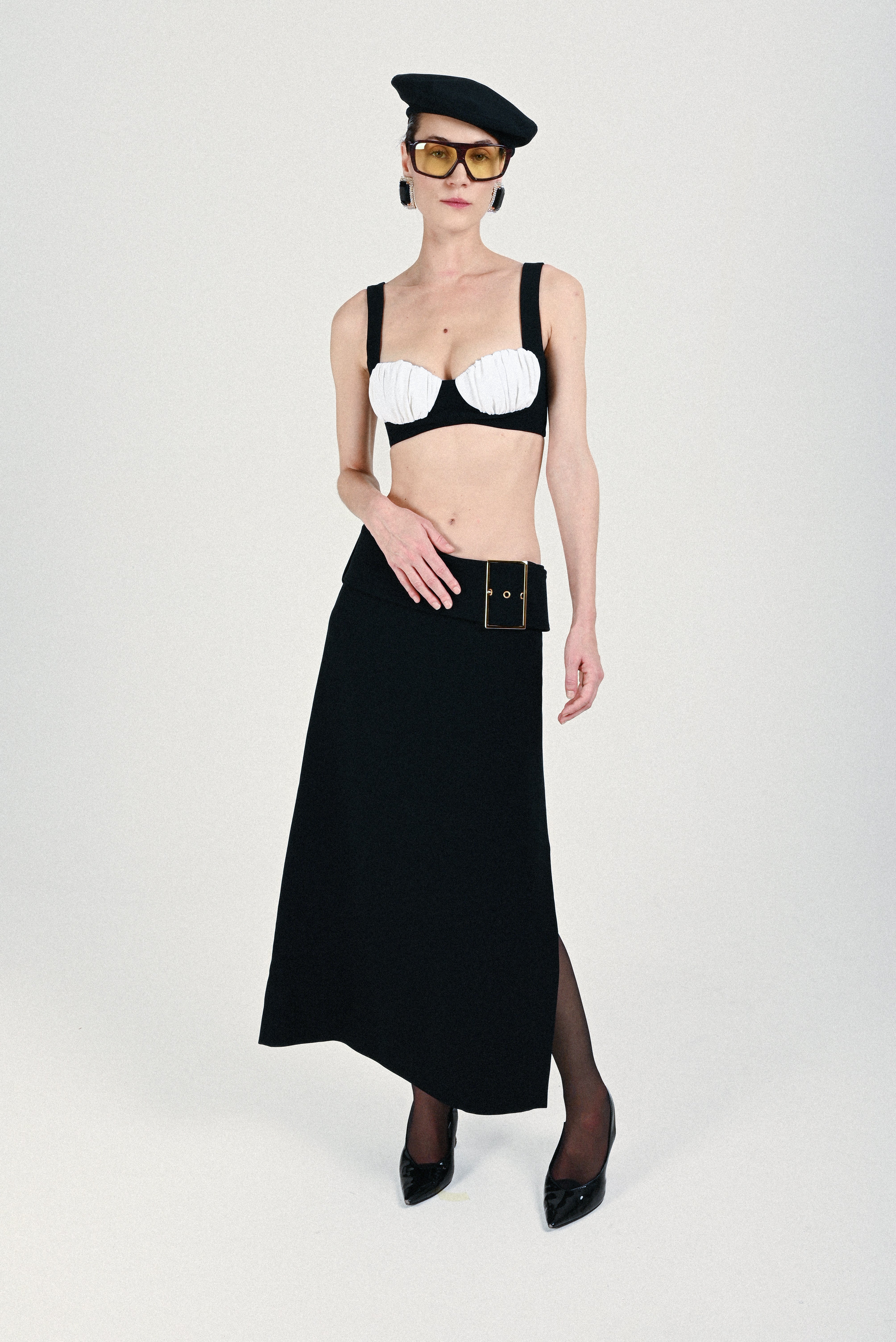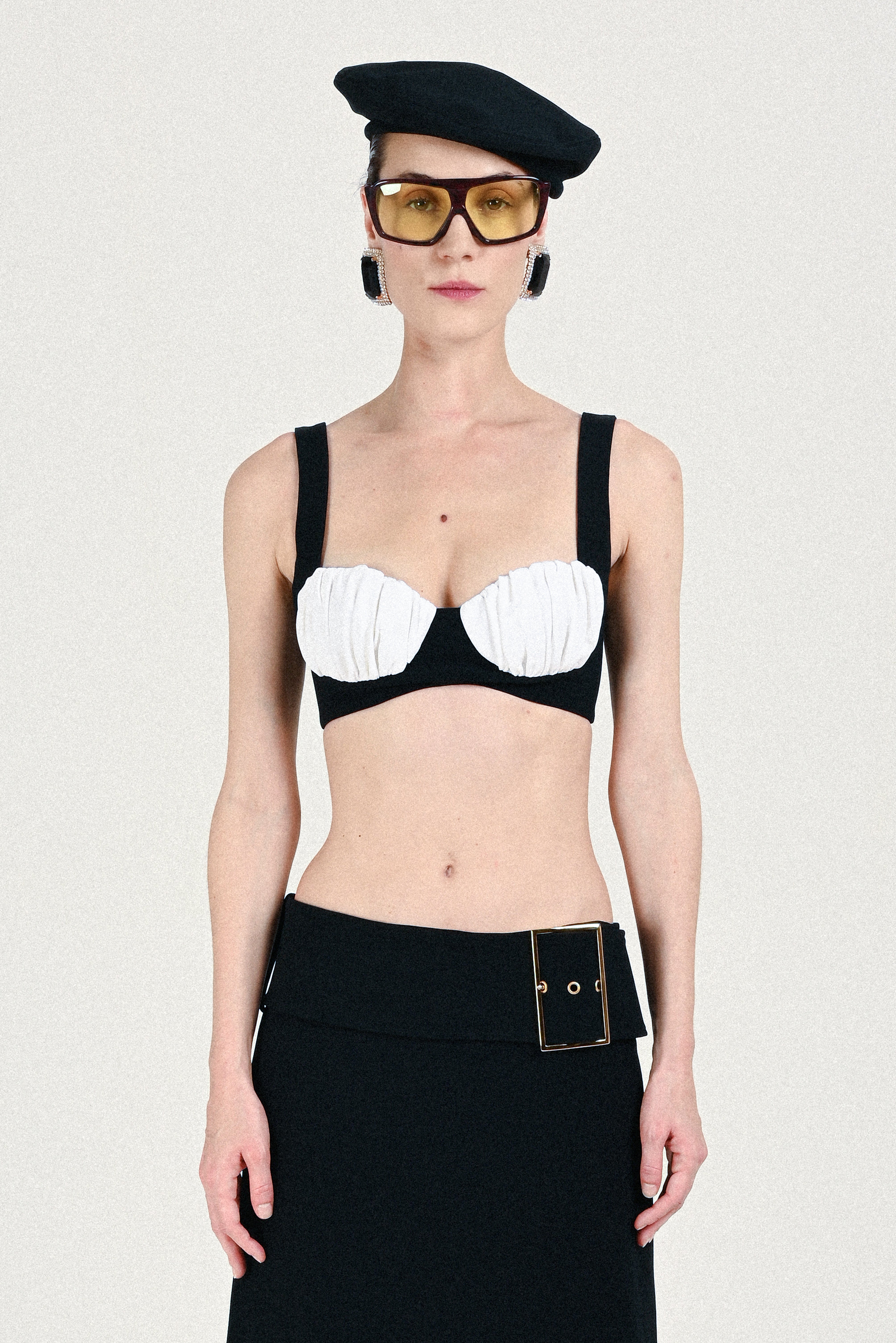 Fierce and undeniably bold, this ruched bra top is crafted from soft viscose. Designed with gathered cups that enhance and shape the bust, it features a structured yet flexible fit that hugs the body comfortably. Thin matching straps provide support while maintaining a sleek silhouette.