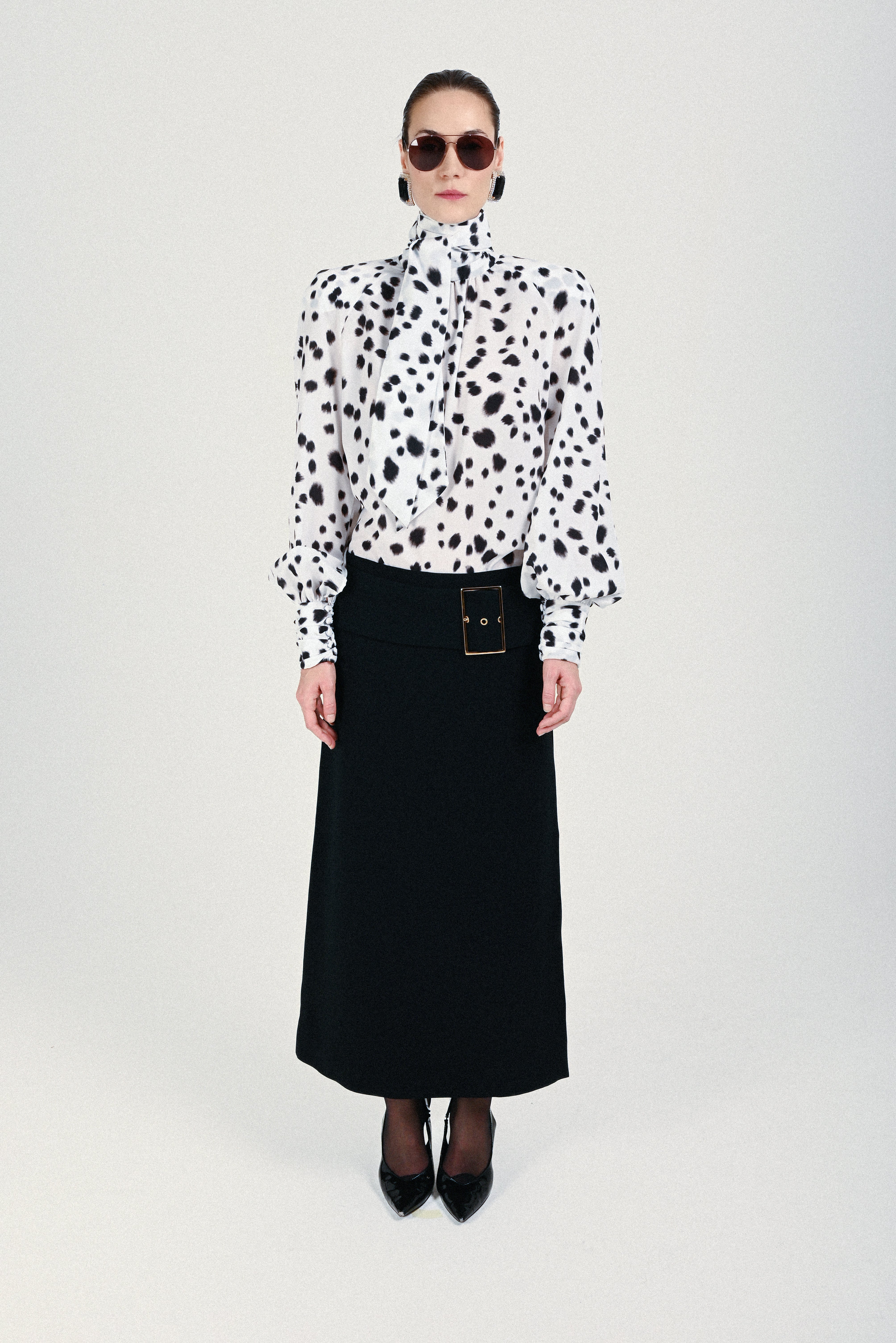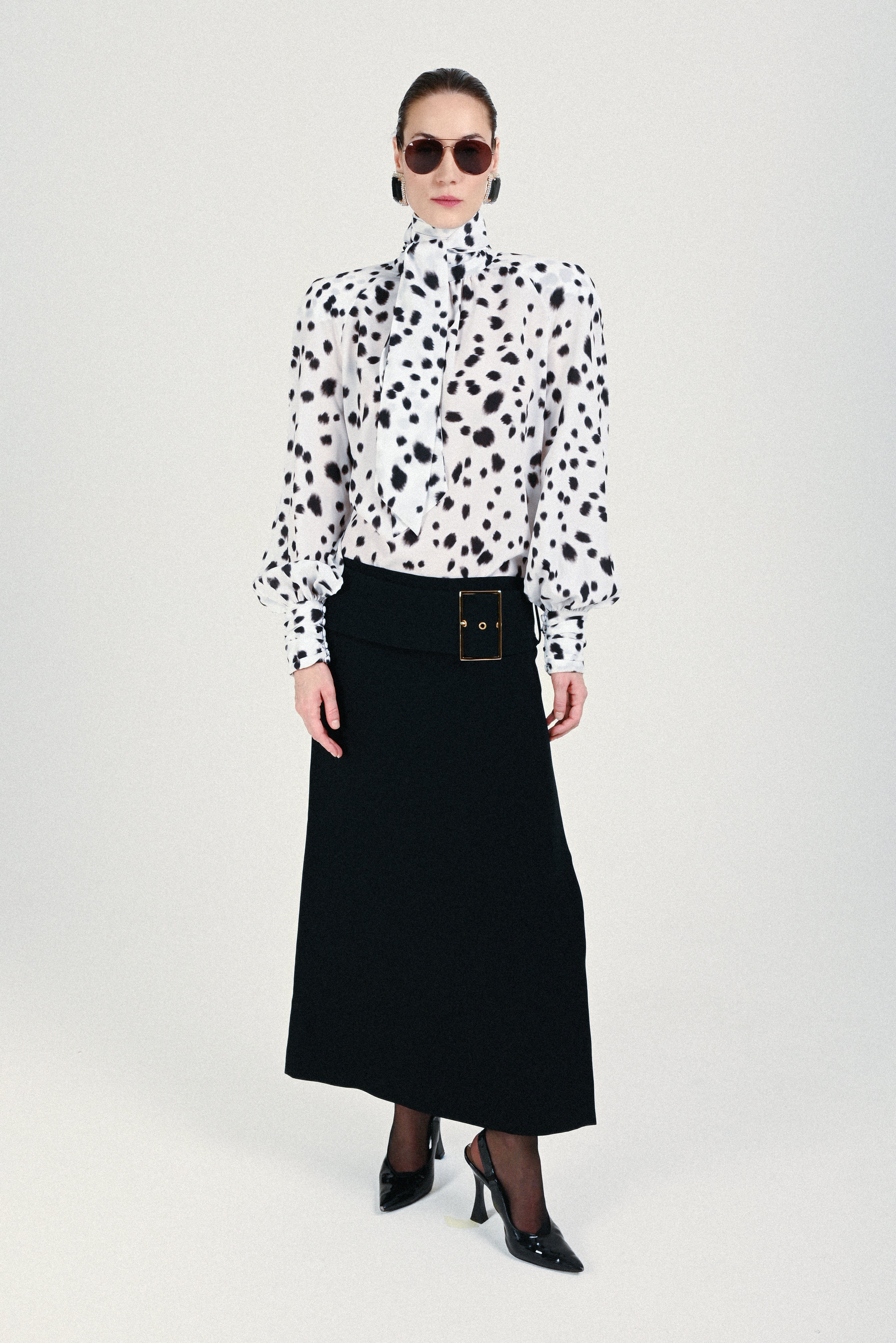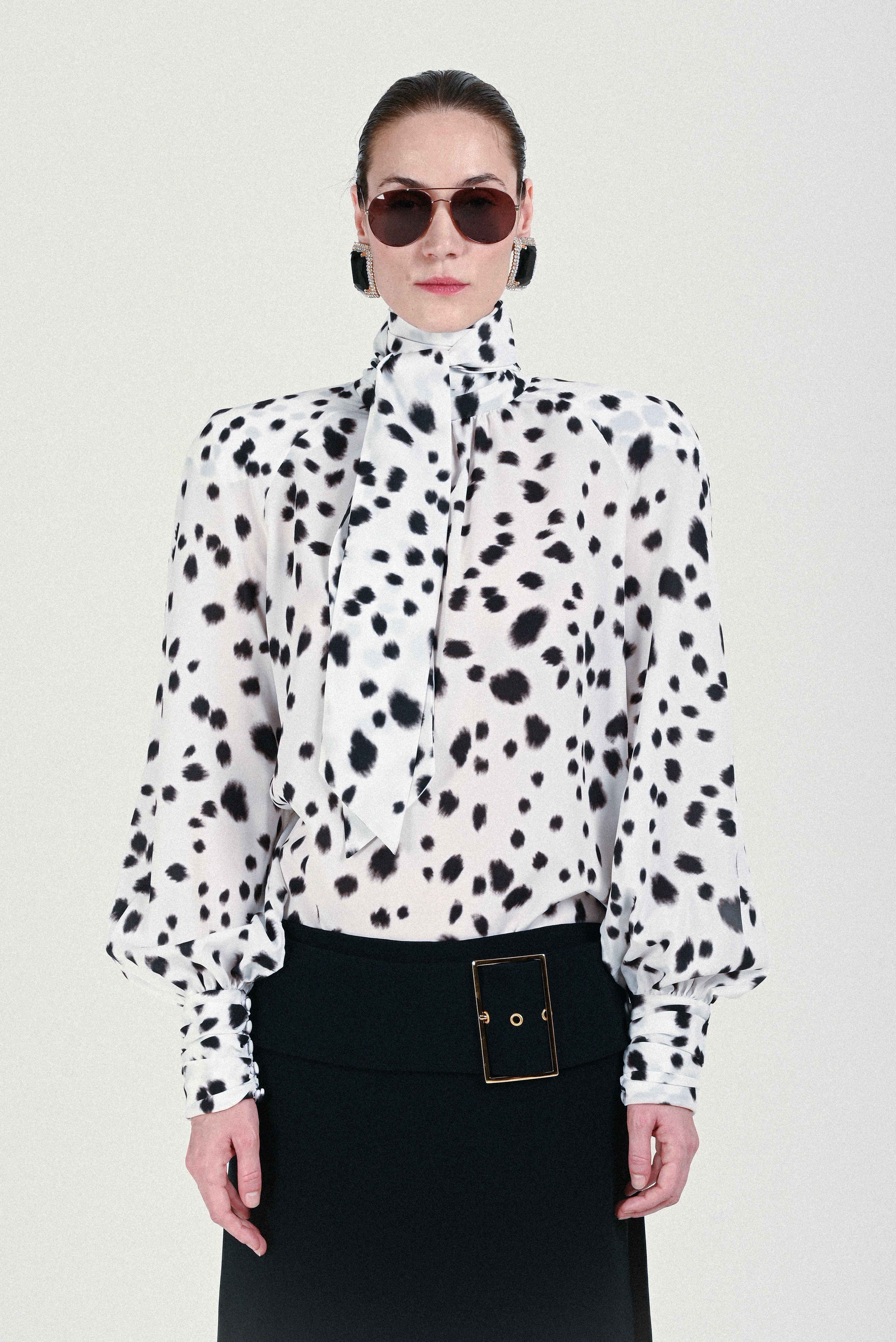 Experience a timeless elegance with our georgette blouse, adorned with a delicate bow neckline and discreet back button closure. The billowing silhouette and strategically placed shoulder pads create a romantic effect. Elevate your style with this luxurious piece.