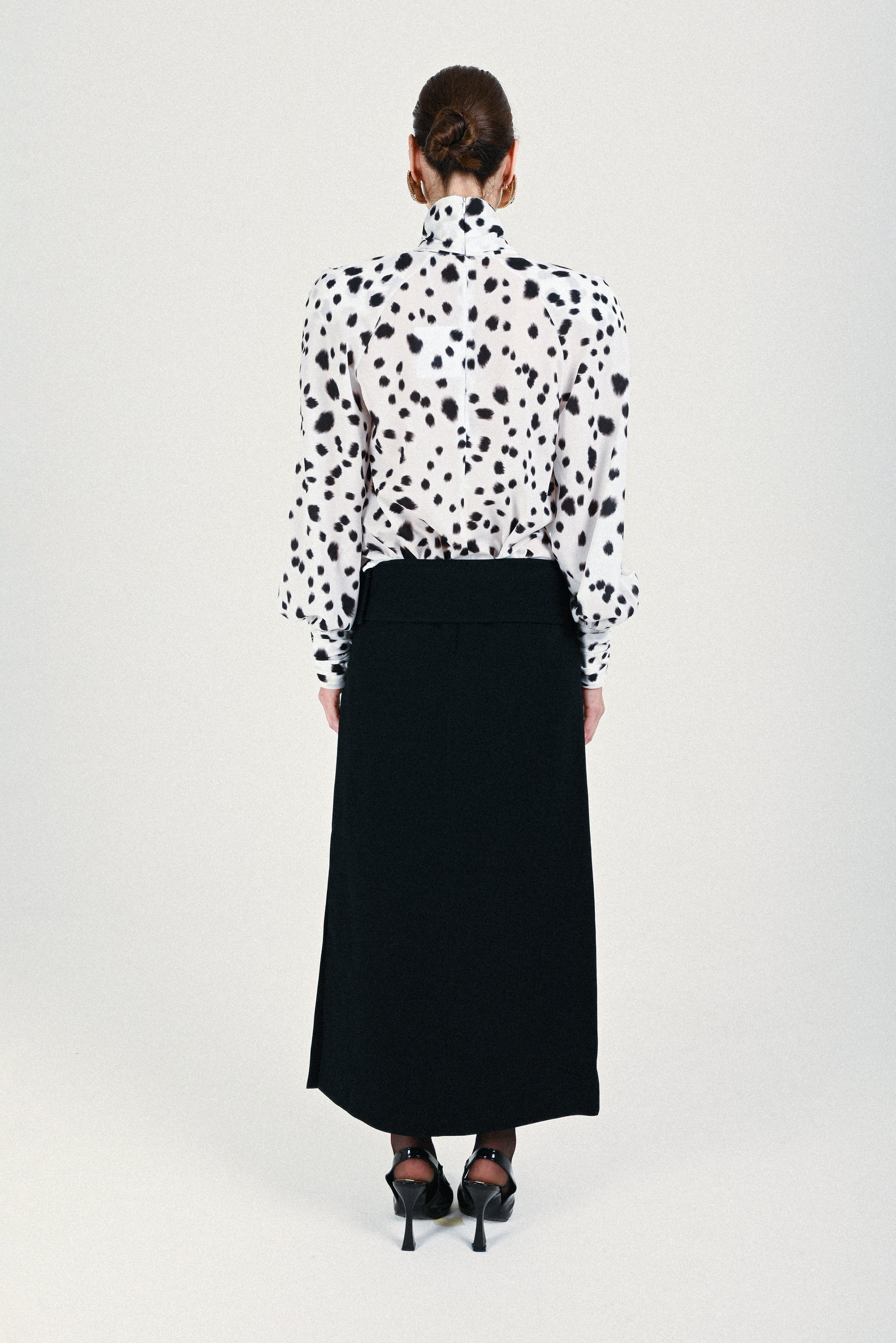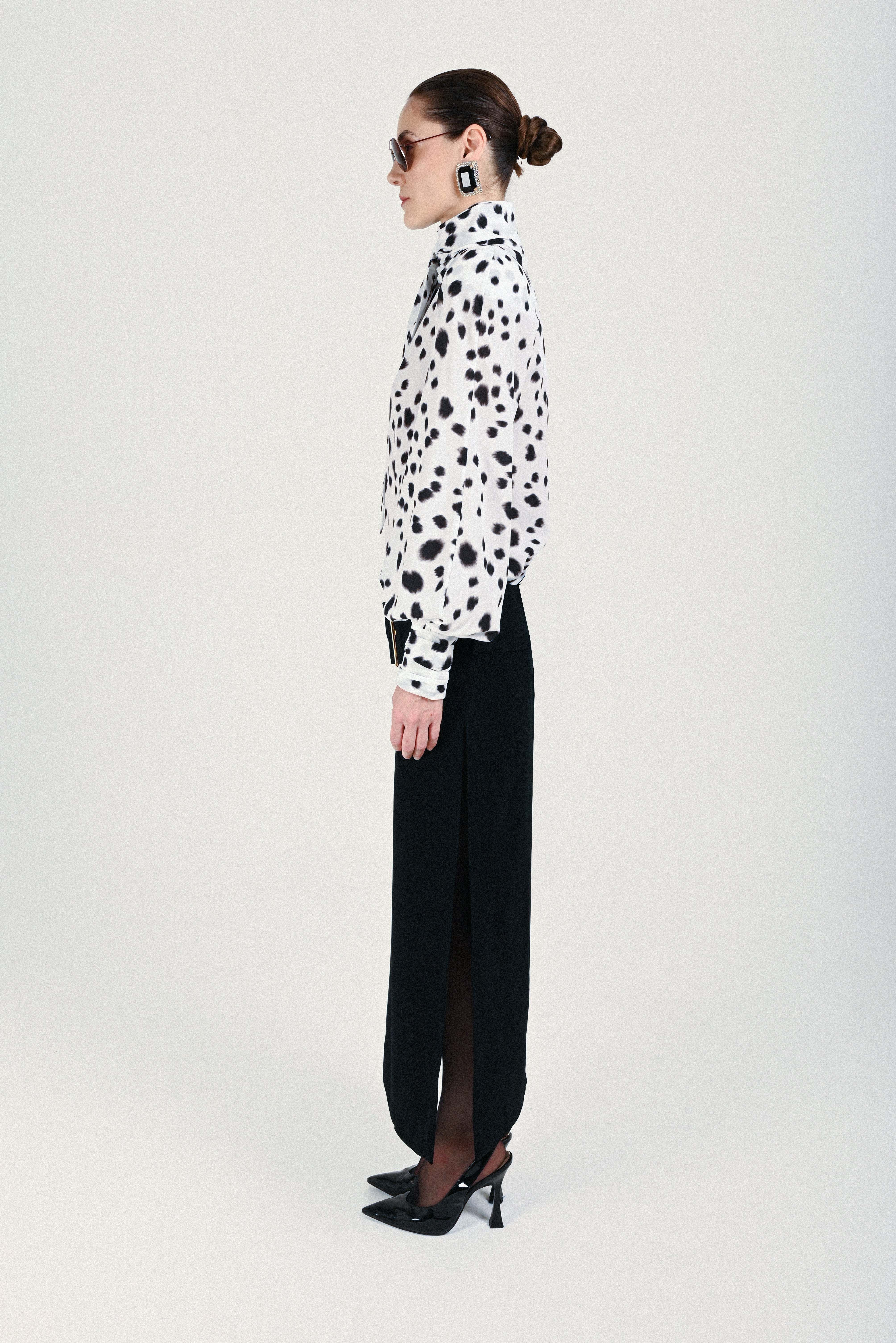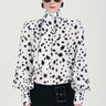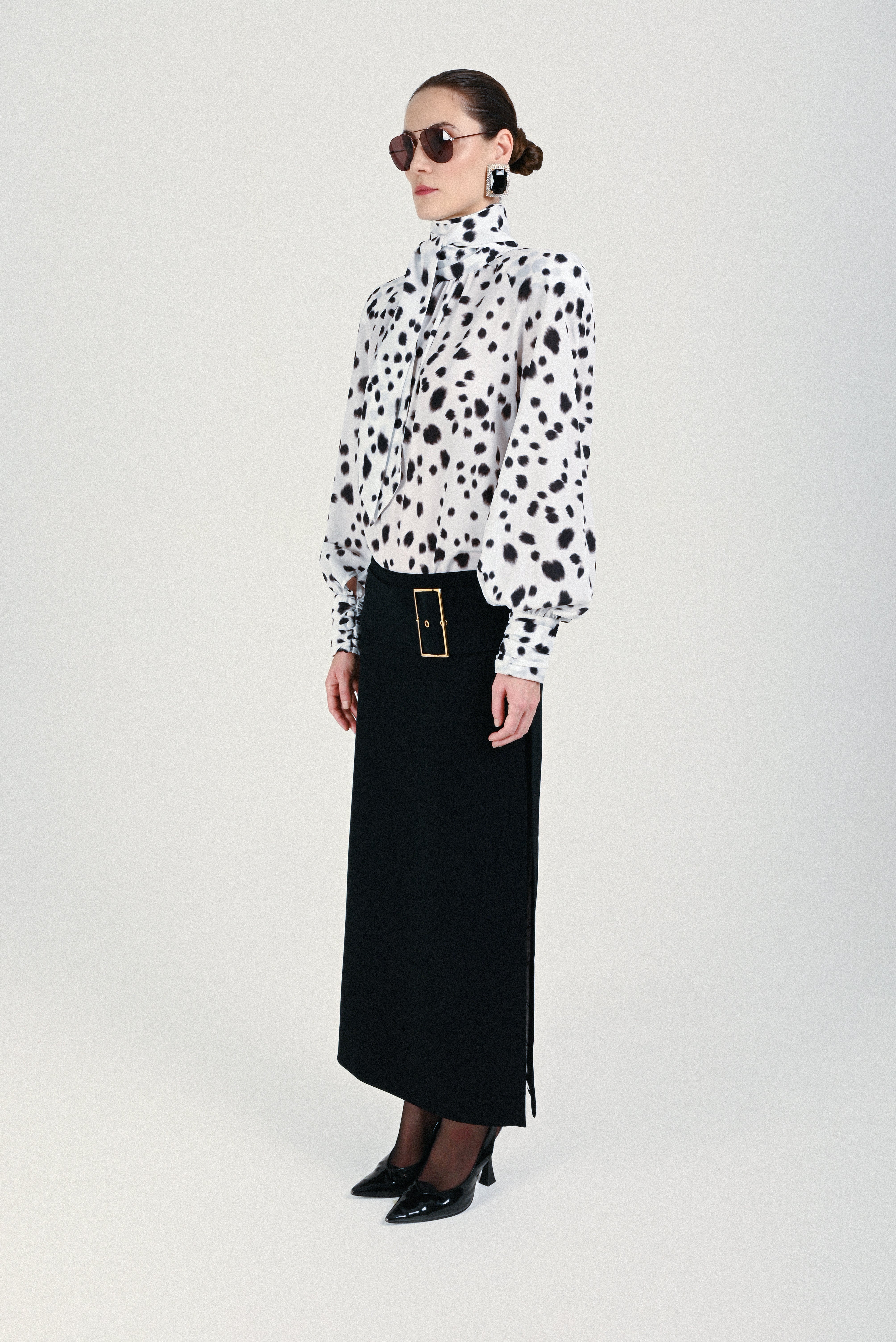 Experience a timeless elegance with our georgette blouse, adorned with a delicate bow neckline and discreet back button closure. The billowing silhouette and strategically placed shoulder pads create a romantic effect. Elevate your style with this luxurious piece.