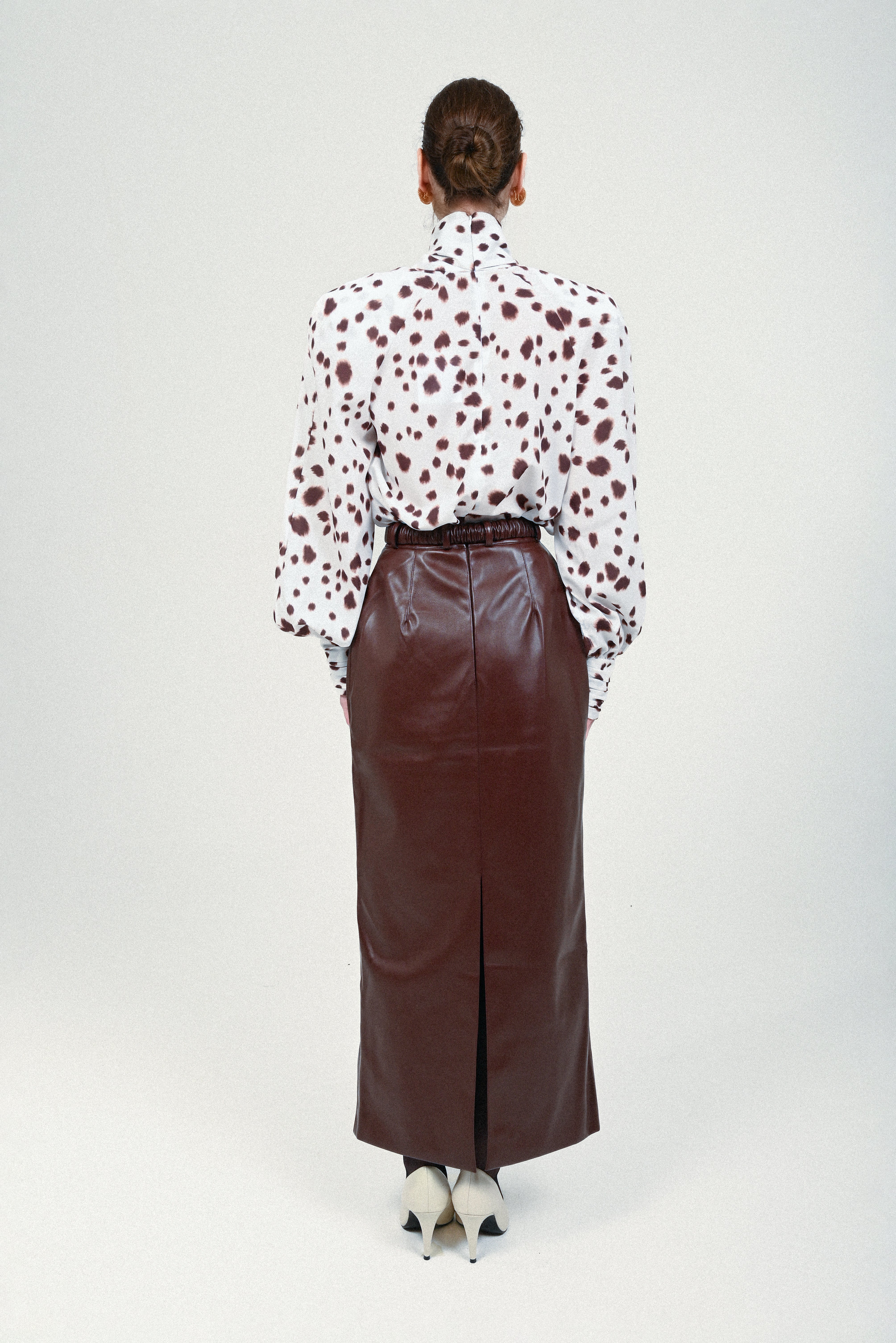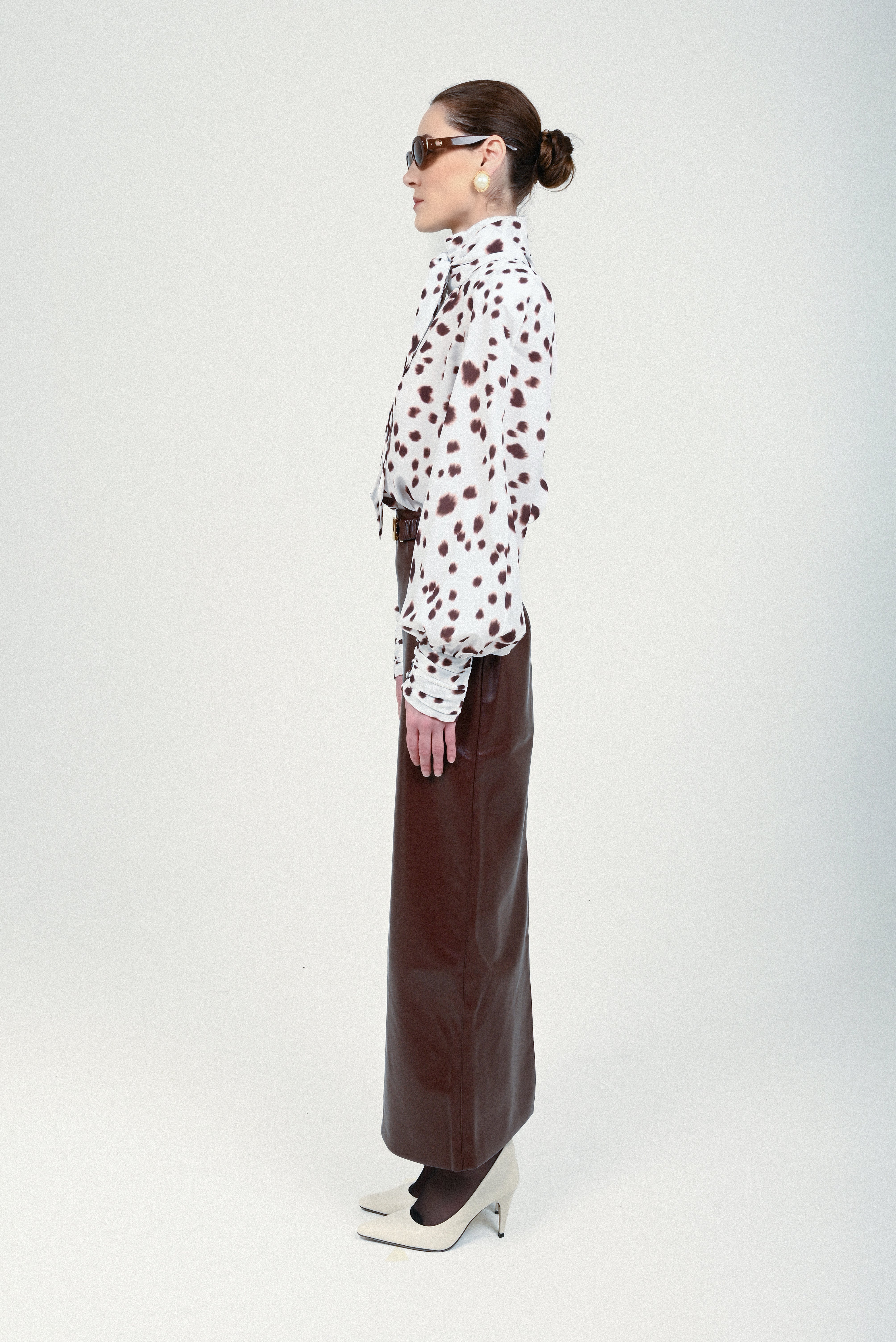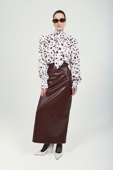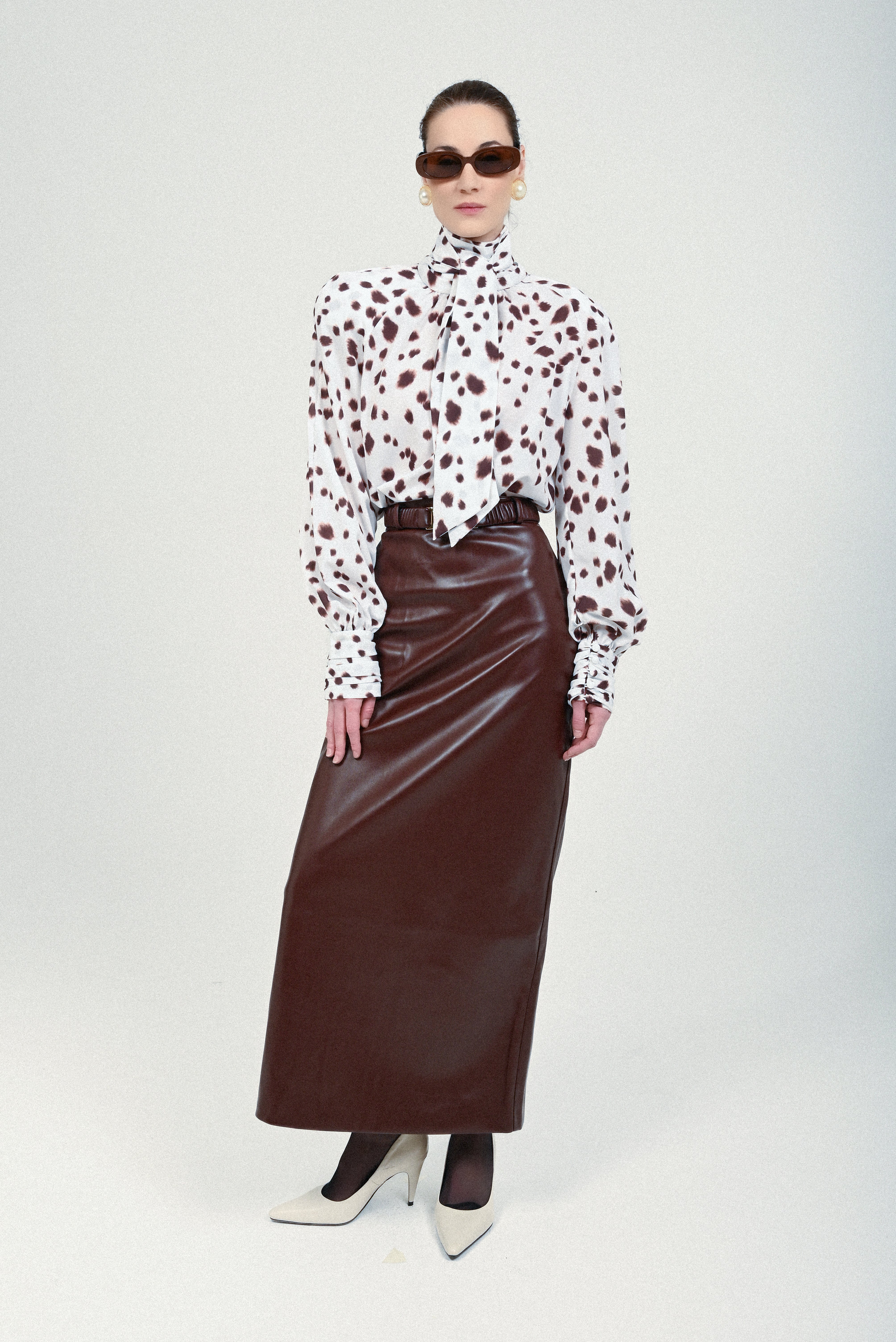 A classic georgette blouse with a bow neckline with a concealed back button closure, long sleeves and shoulder pads.