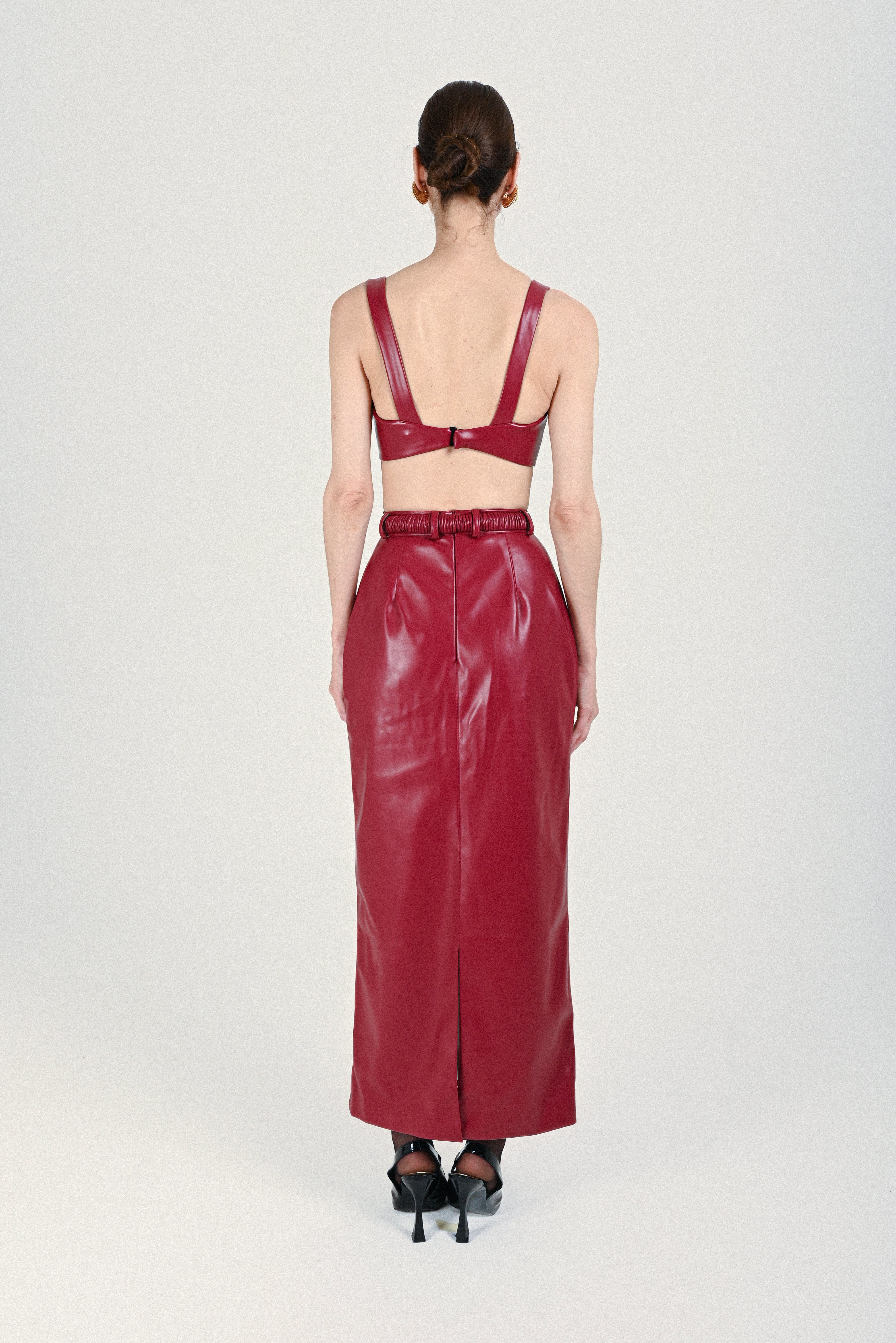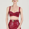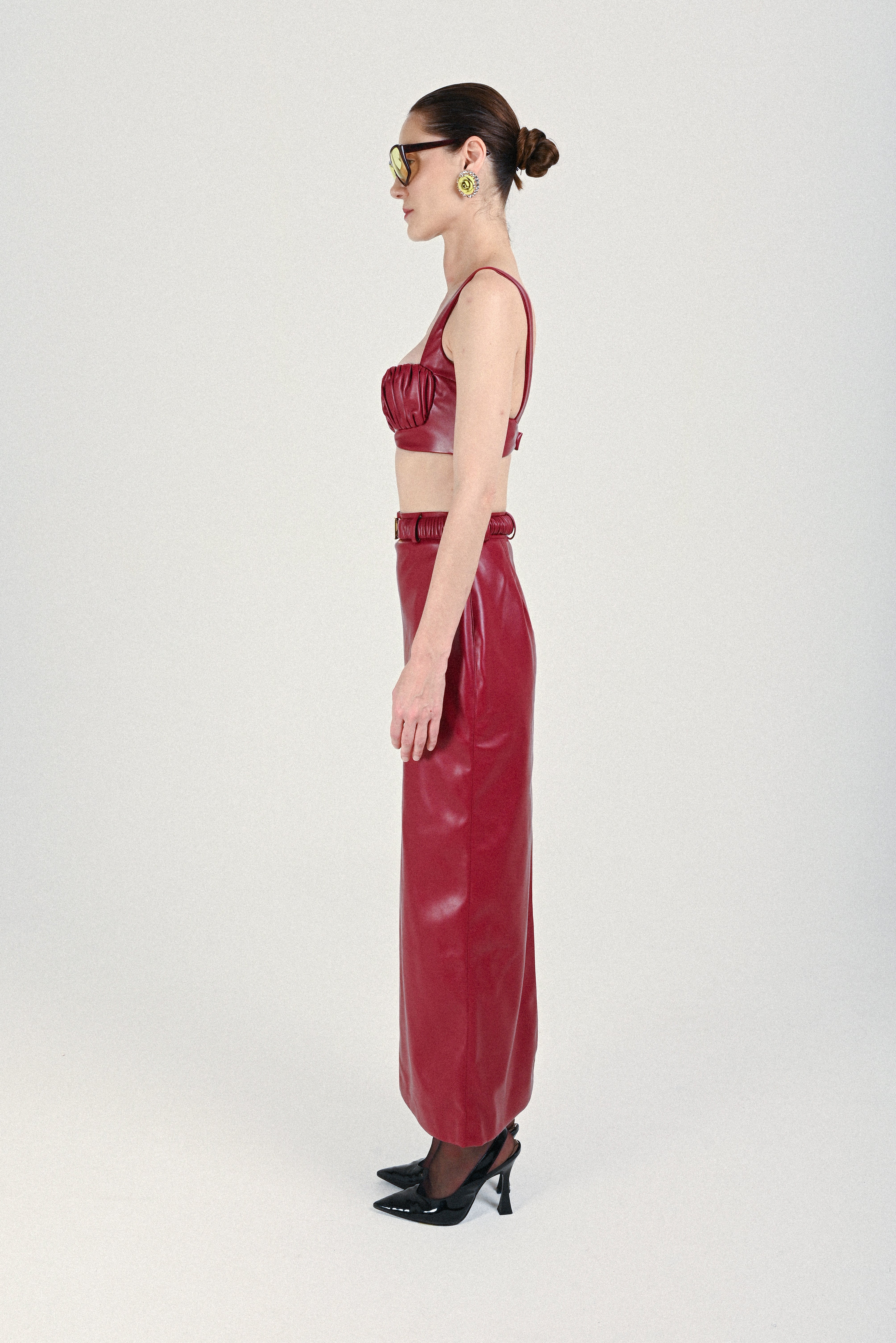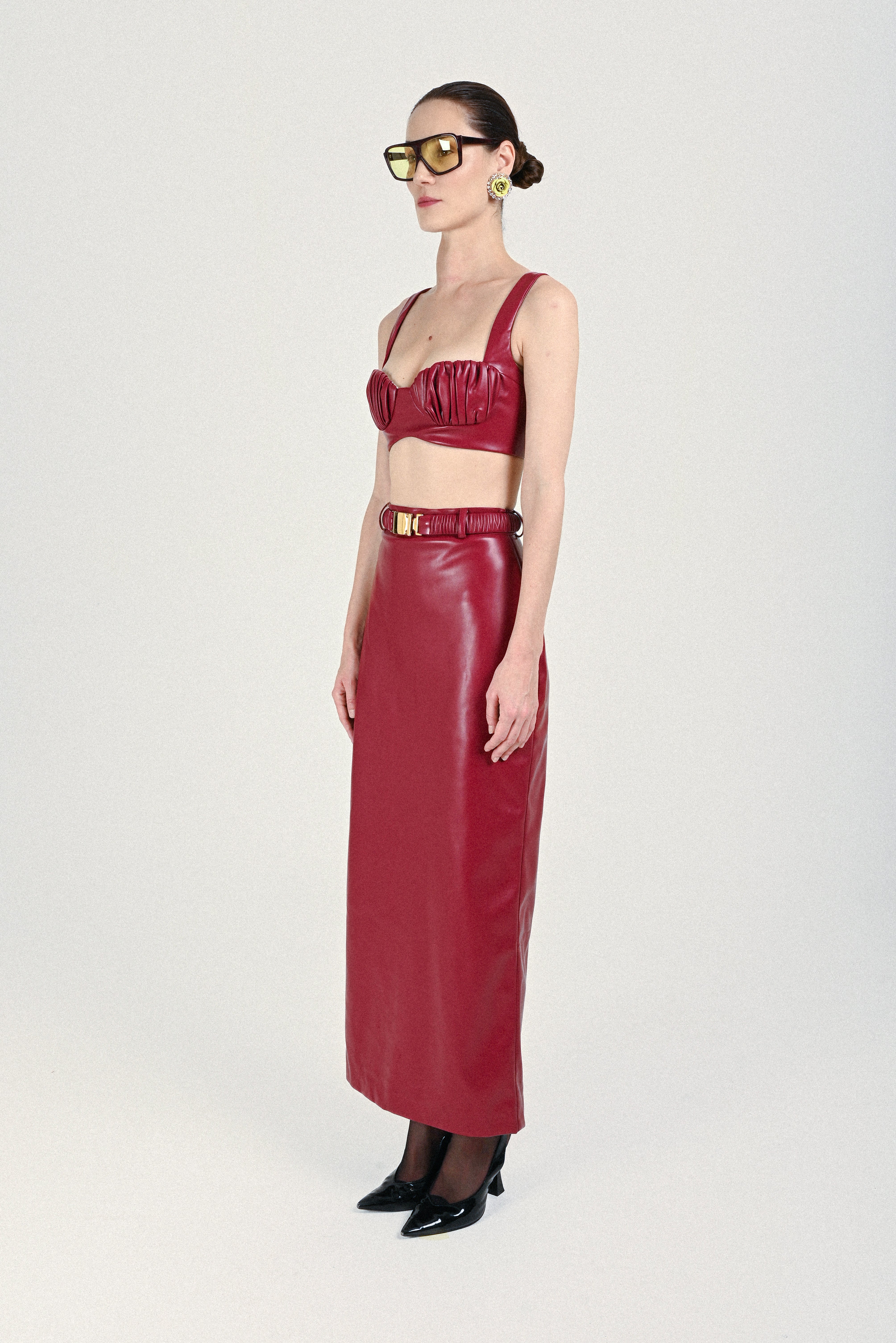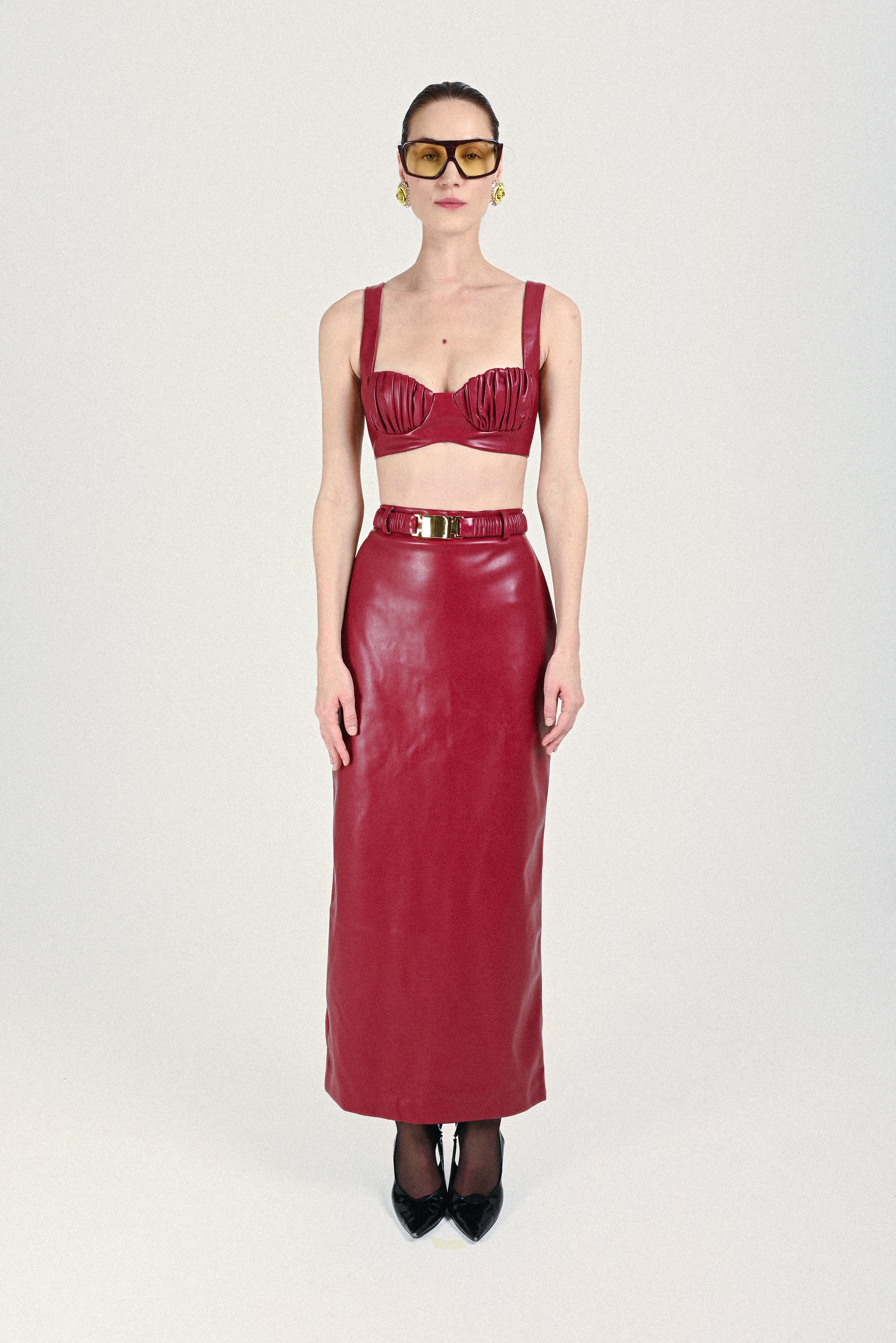 Fierce and undeniably bold, this ruched bra top is crafted from soft, high-shine eco leather in a rich burgundy tone. Designed with gathered cups that enhance and shape the bust, it features a structured yet flexible fit that hugs the body comfortably. Thin matching straps provide support while maintaining a sleek silhouette.