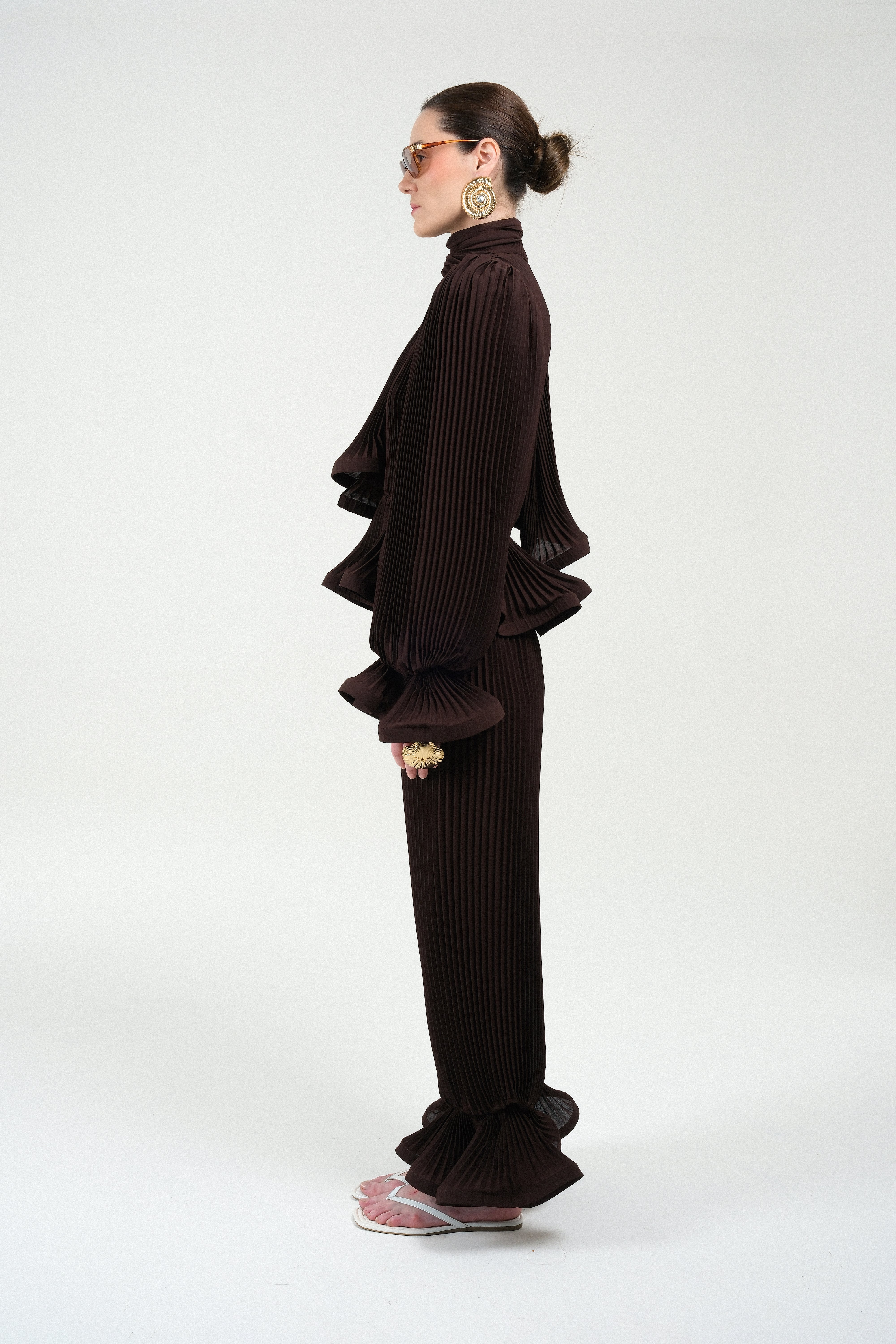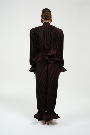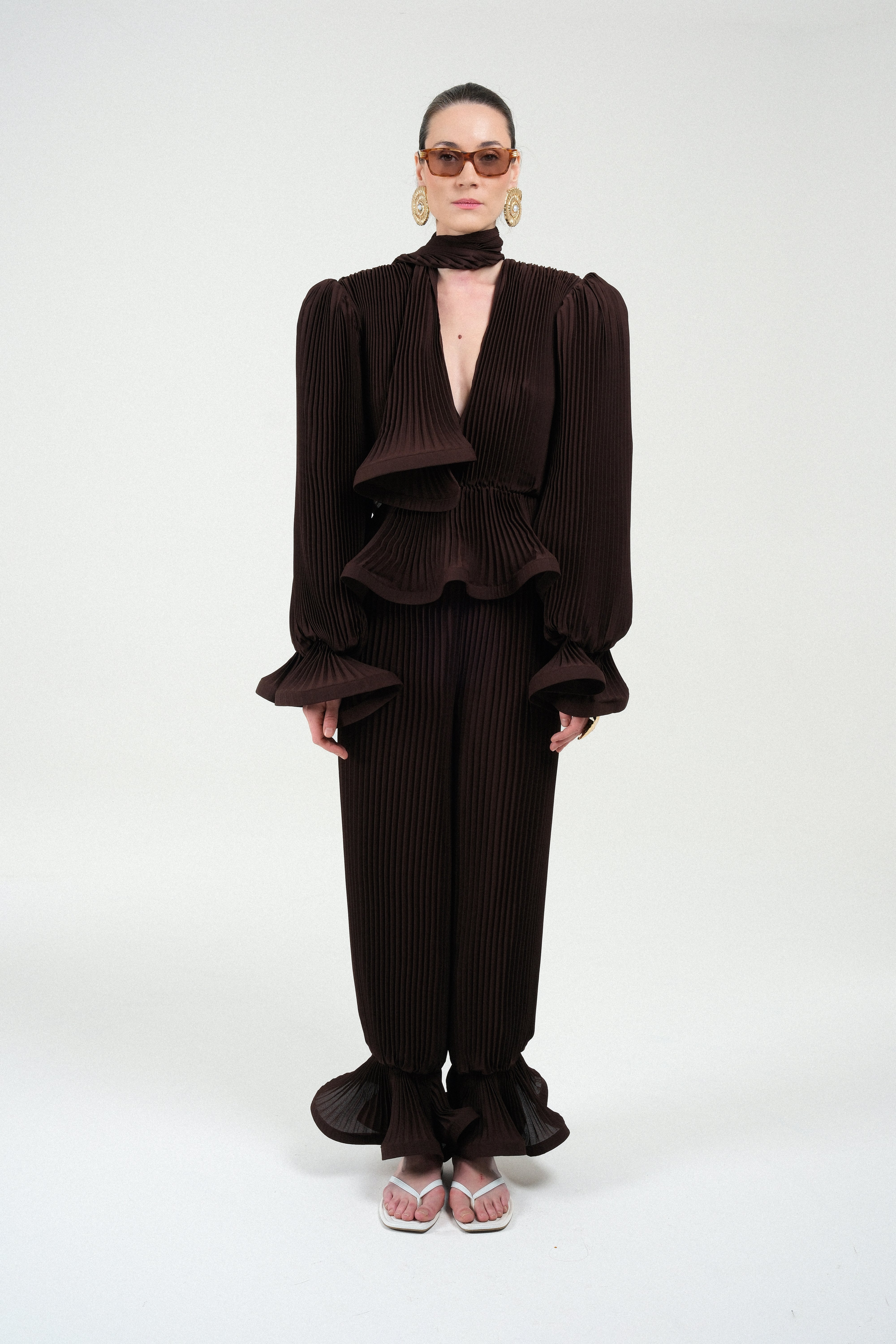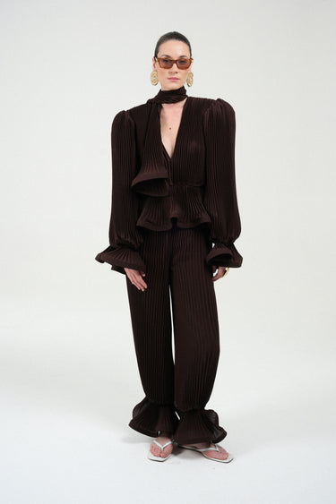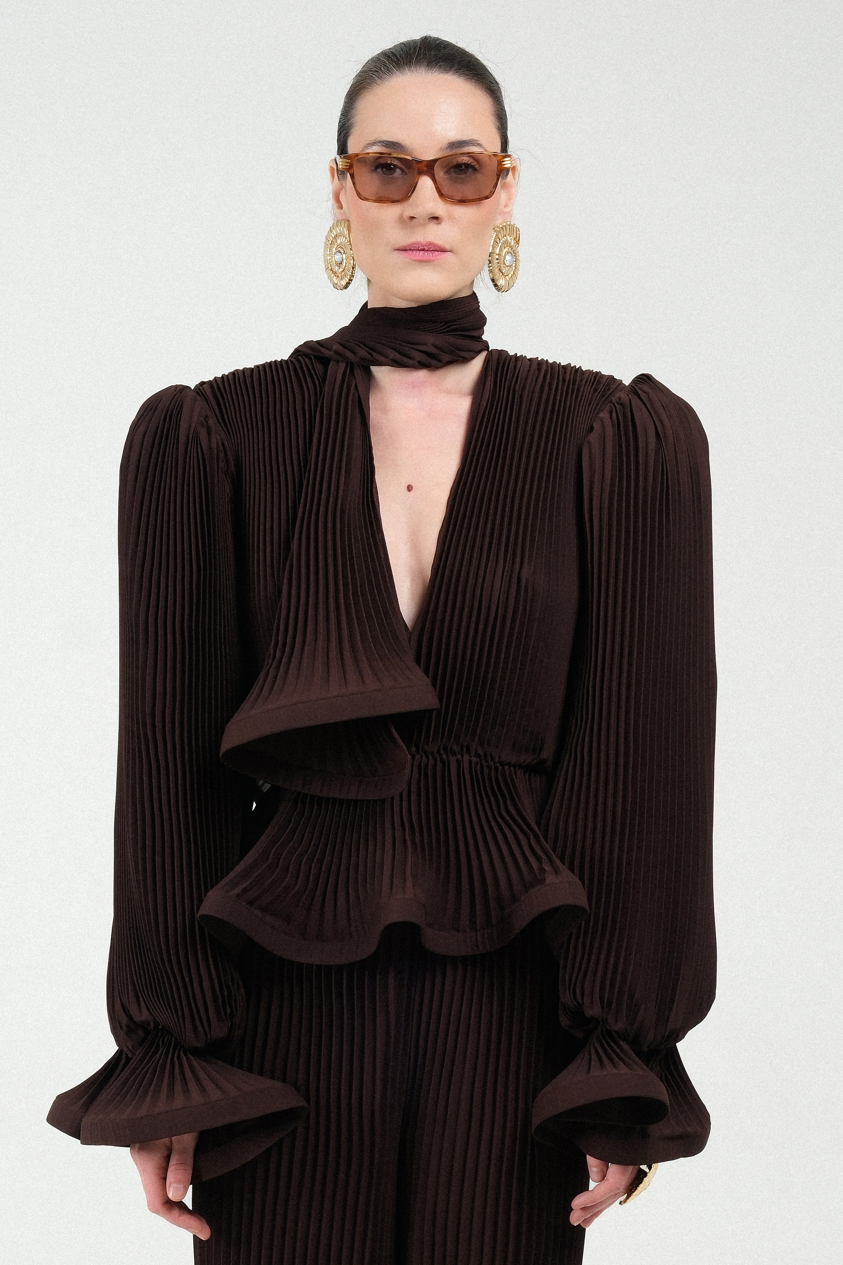 Unleash dramatic volume and texture with this exquisite blouse, entirely crafted from finely pleated georgette. The design is defined by its striking puffy sleeves and structured shoulder pads, creating a powerful, architectural silhouette. Adding a touch of romantic flair, the cuffs are finished with a delicate ruffle detail. A versatile integrated foulard at the neckline allows for multiple styling options, from a chic bow to a flowing tie.