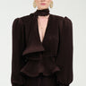 Blouse crafted from pleated georgette fabric. Features voluminous puffy sleeves with internal shoulder pads and a ruffle detail at the cuffs. Includes an integrated foulard at the neckline. Unlined construction with no zipper.