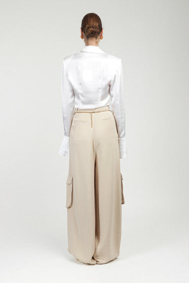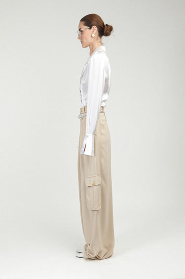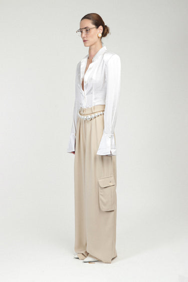 Indulge in our timeless RR shirt crafted from luxurious satin silk. A harmonious fusion of masculine and feminine elements, it boasts an oversized silhouette with structured shoulders. Exquisitely detailed with an understated logo embroidery and our signature buttons. Features open, elongated cuffs for added elegance.