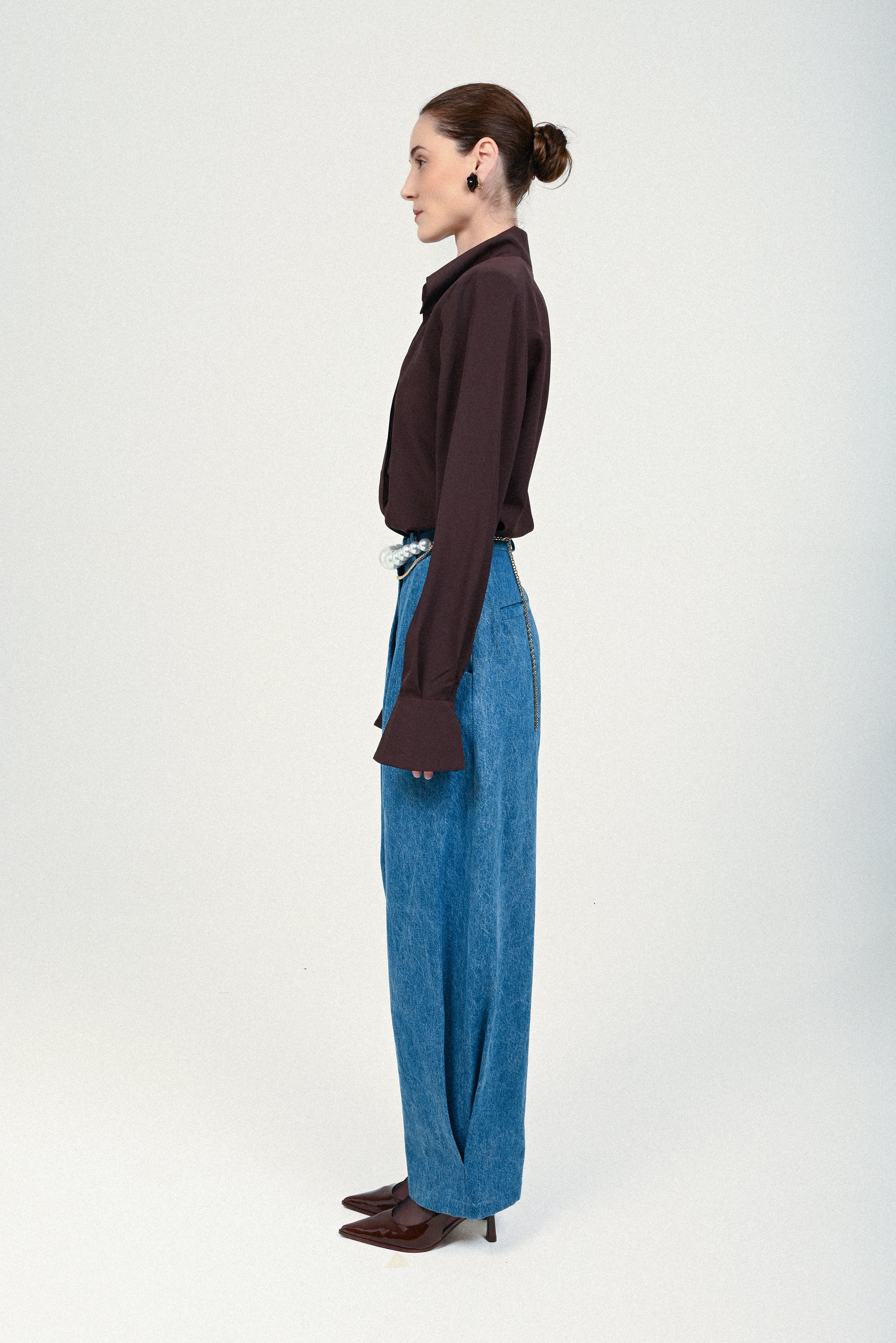This tailored shirt is crafted from lightweight georgette in a refined brown georgette. Designed with a structured collar, long sleeves, and a fluid drape, it balances sophistication with contemporary ease. Versatile and elegant, it transitions effortlessly from day to evening styling.
