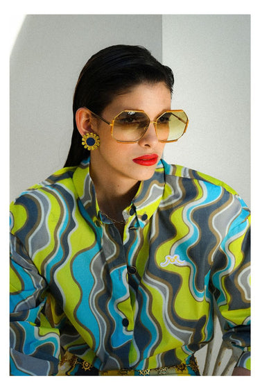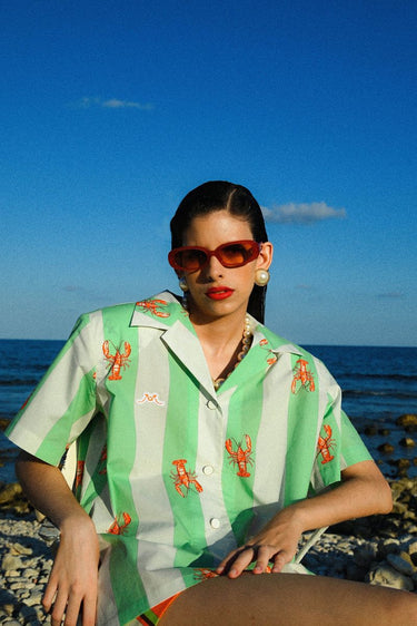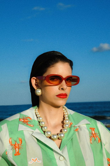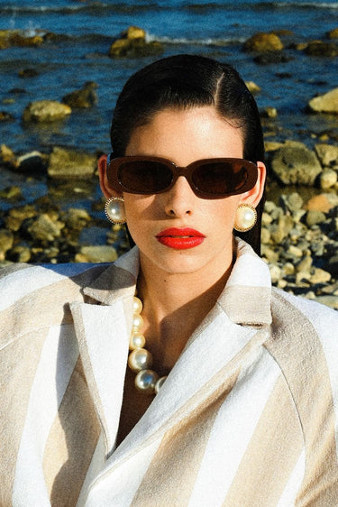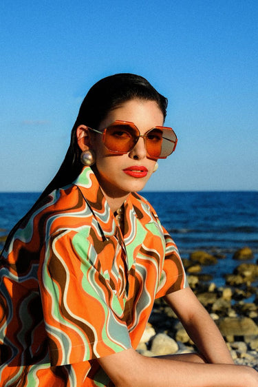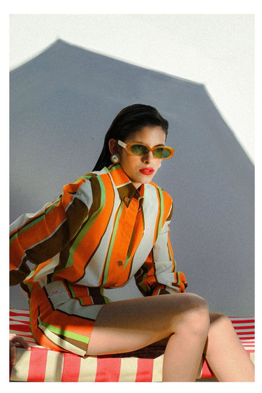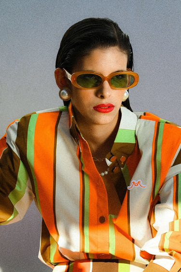 Playing with classic summer codes, a redesigned for the capsule elegant red and white striped linen packaging reveals the iconic shapes Cara and Margot, chosen specifically for their 1970’s feel. 6 frames are available, 2 shapes in 3 color ways, all of them being an ode to the 70s and its aesthetic, as well as reminiscing of the south of France with its sunny beaches, crystal blue waters and bright, vivid orange sunsets. This is manifested throughout the collection with terracotta with orange gradient lenses, honey with green lenses, or a warm chocolate brown with brown lenses, bringing us back to an ideal past, with a refreshing contemporary touch.