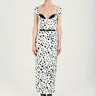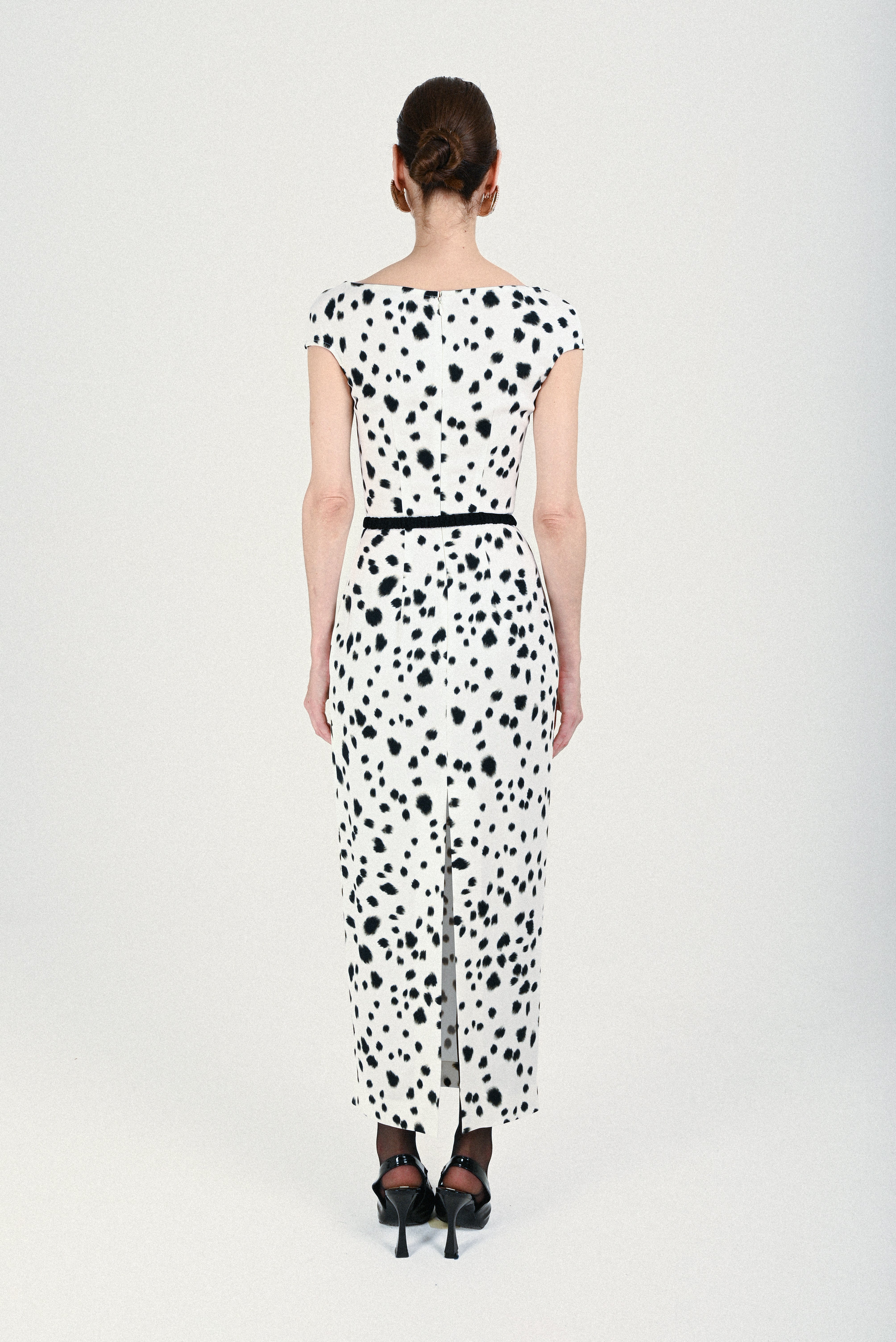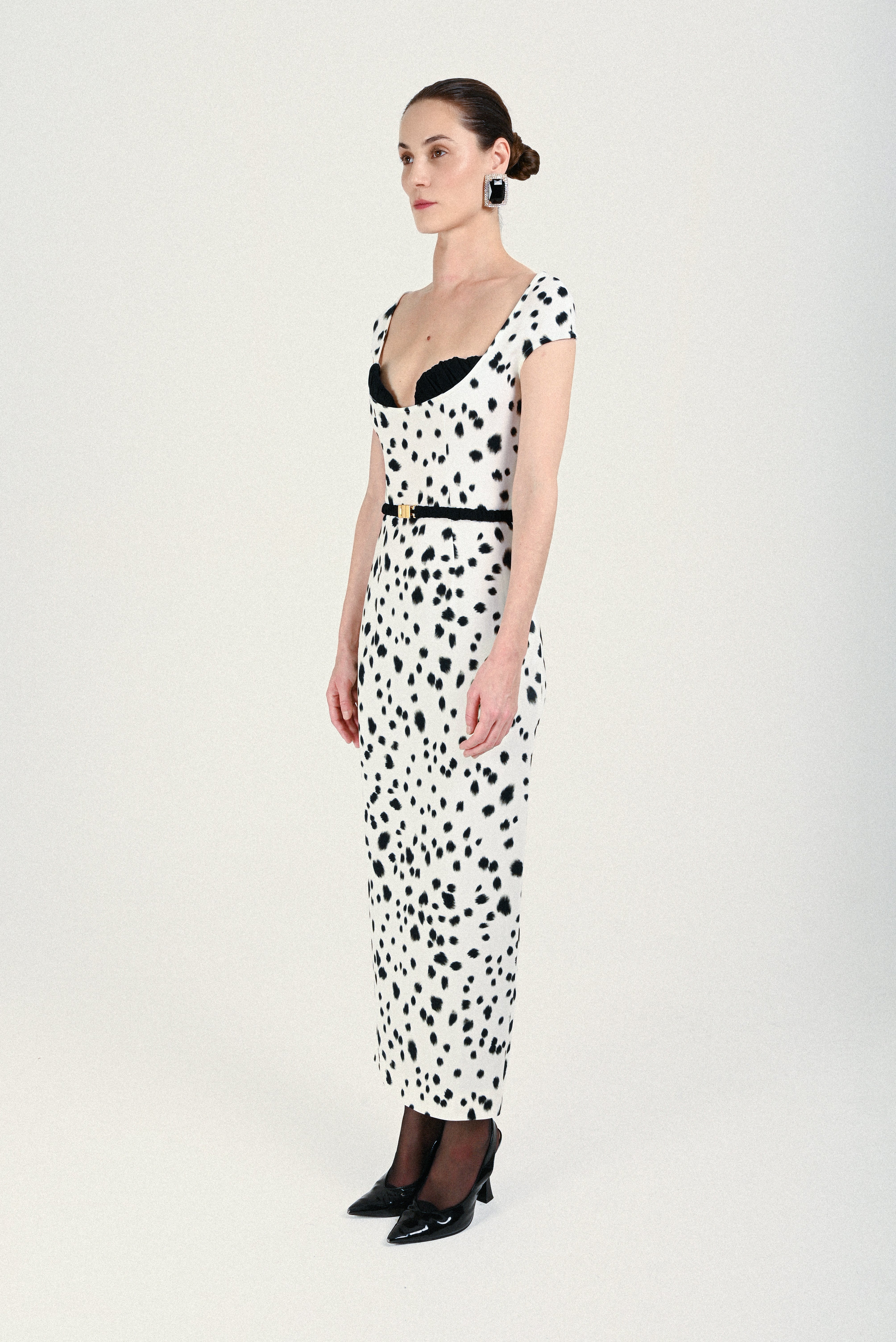 This refined dress in white and black dalmatian print sable features a sleek, elongated silhouette that exudes timeless sophistication. Designed with contrasting black half-exposed cup detailing, it offers a bold yet feminine touch. The integrated belt cinches the waist for a structured, elegant shape, while the clean lines and floor-length cut enhance its graceful appeal. A statement piece that seamlessly combines modern sensuality with classic tailoring.