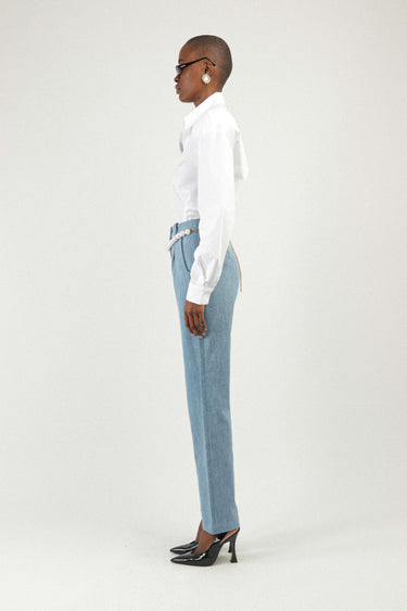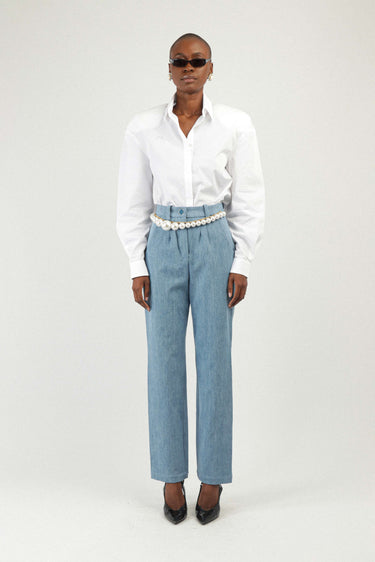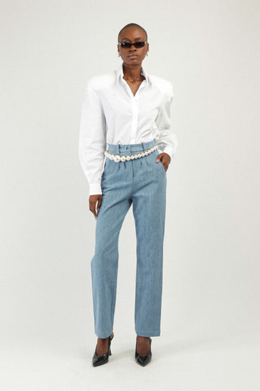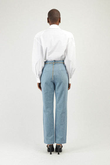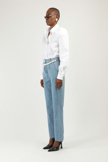 Experience the iconic style of Rowen Rose with these timeless denim cigarette pants. Featuring a long length and a straight fit, these pants are both fashionable and functional with the addition of pockets. The zip and signature button closure add a touch of sophistication to these must-have pants.