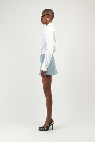 Our mini skirt in denim. High waisted, mini length and zip enclosure. To pair alone or with a matching jacket for a full look. Model is 1m76 and wears size 34FR. This piece fits true to size. We recommend you to get your regular size.