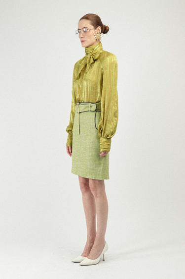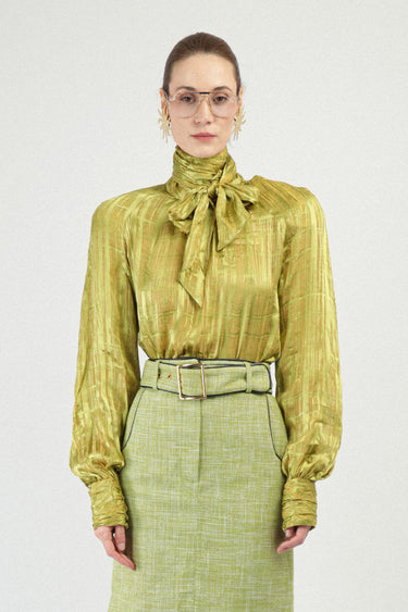 This dévoré blouse boasts a timeless design, with elegant draping and a charming bow neckline. It also includes functional features such as a back button closure and shoulder pads for added structure.