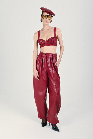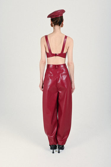 Made from durable eco leather, these elegant carrot pants boast pleats and a flattering high waist that reaches the ankle. The deep bordeaux color, highlighted by coordinating stitching, offers a stylish and adaptable option that effortlessly enhances any top or blouse in your wardrobe.