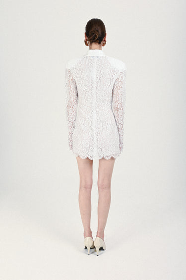 Elegant fitted mini dress crafted from delicate sheer floral lace, featuring a structured shirt collar and deep neckline with invisible button closure. Detailed with scalloped cuffs and hem for a refined finish. Fully sheer design, no pockets, with concealed side zipper for a sleek silhouette. A sophisticated statement piece, perfect for evening and special occasions.
