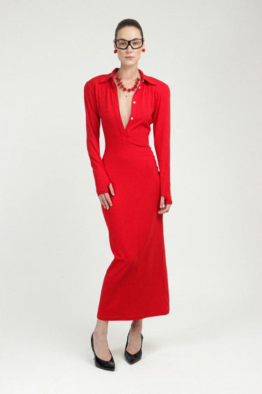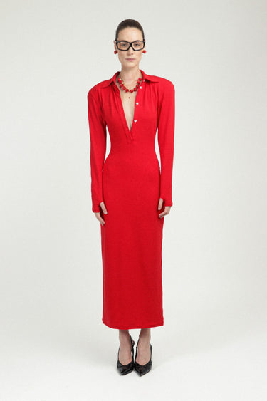 This jersey polo dress is our signature piece, designed to flatter with its shape and long sleeves. It also features a back slit and thin shoulder pads for added style.